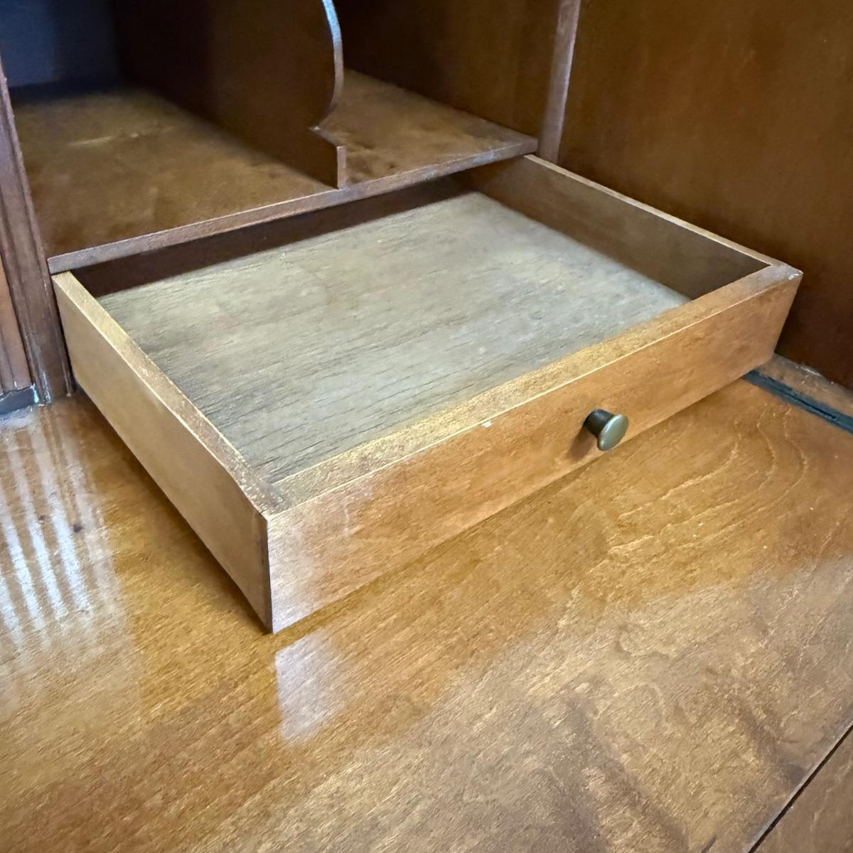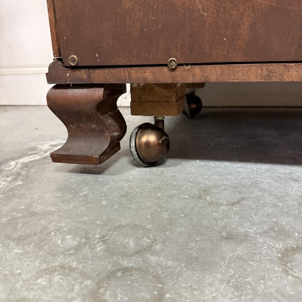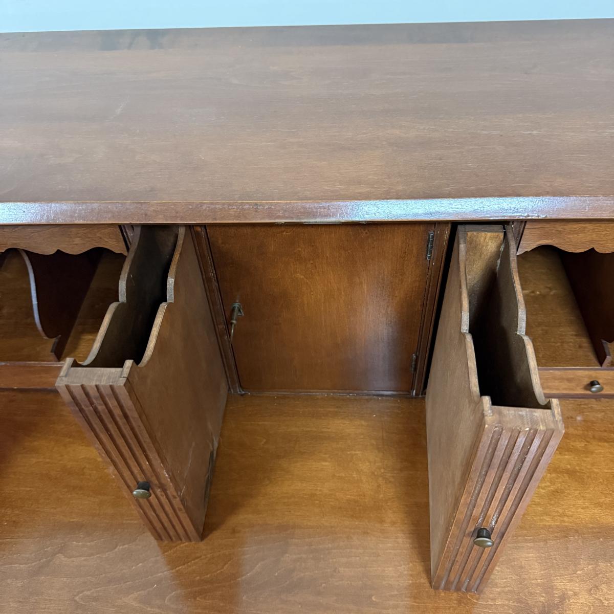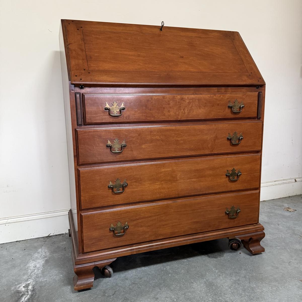 Beautiful wooden Trutype brand secretary desk features dovetailed construction throughout. The desk rolls very smoothly and easily on casters. It measures 32.75” x 21” x 41.5”H. Two keys are included and both locking mechanisms function.