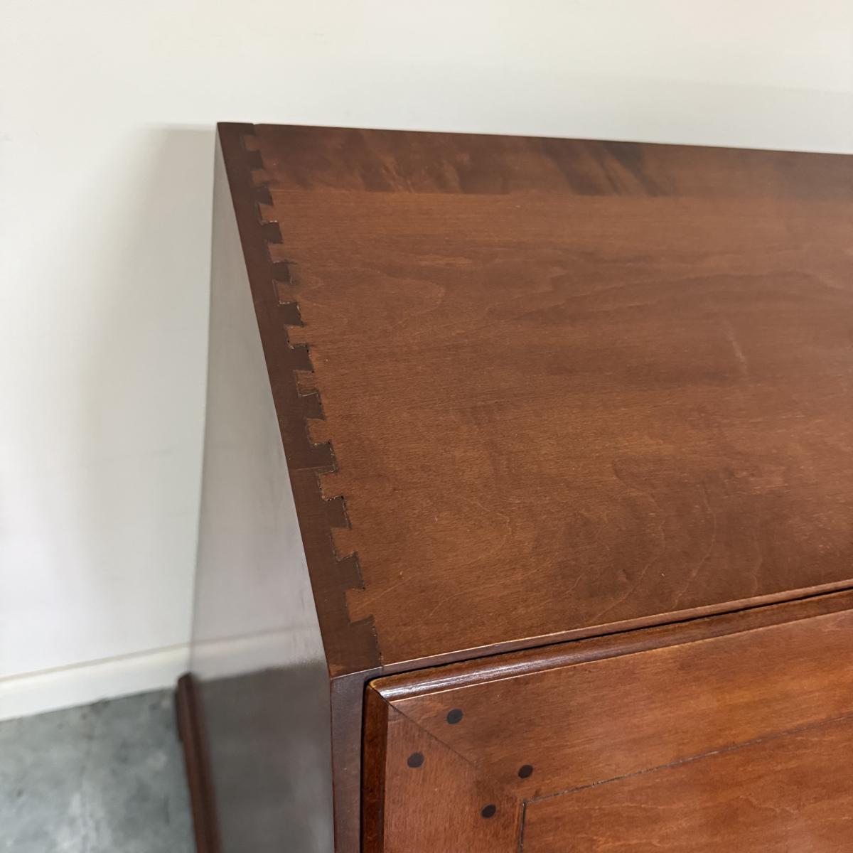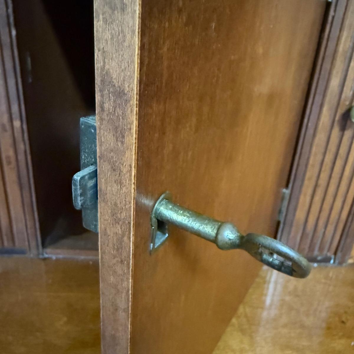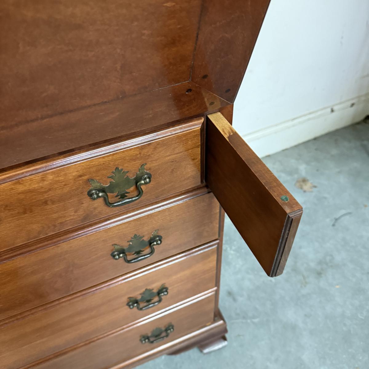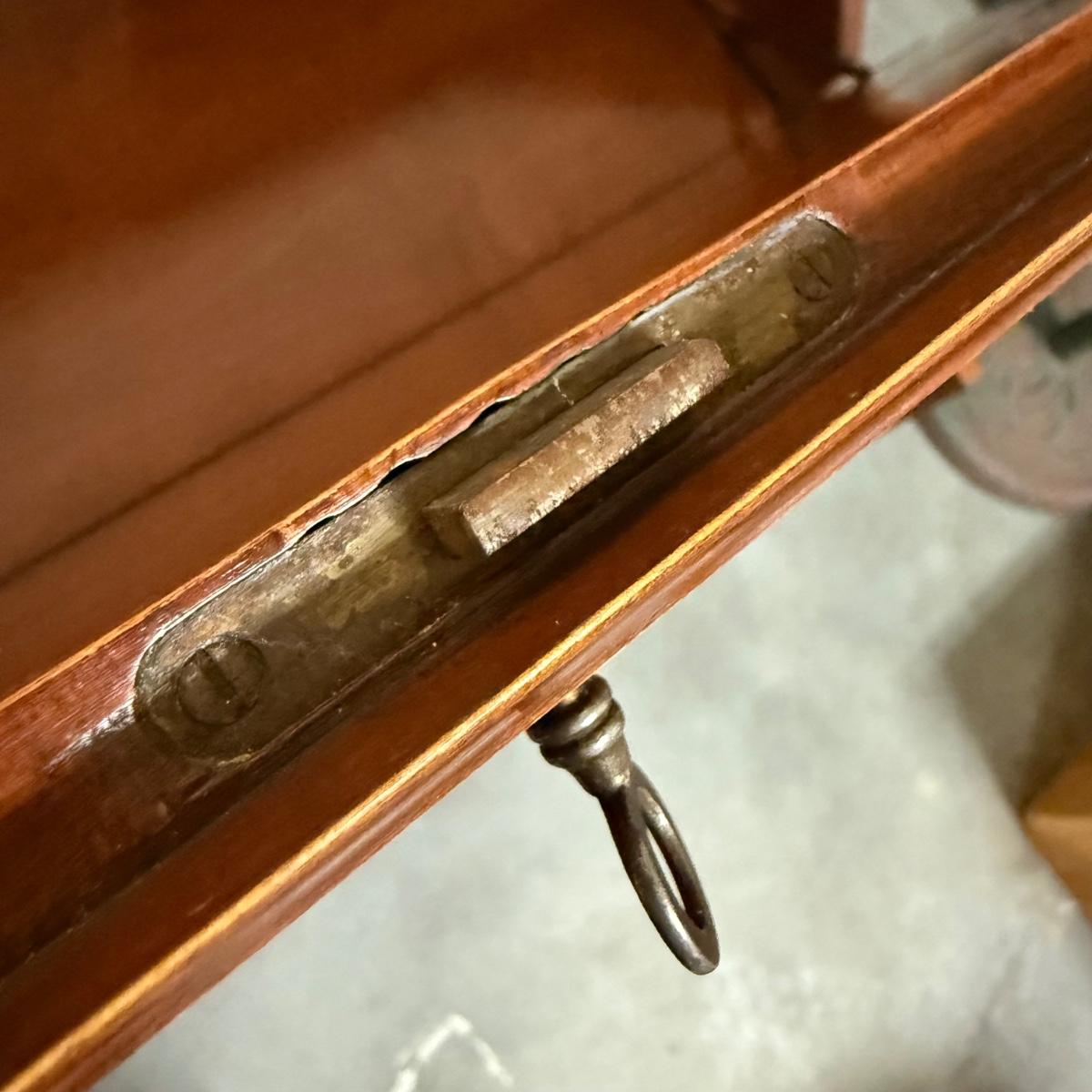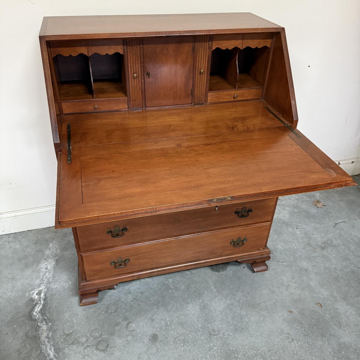 Beautiful wooden Trutype brand secretary desk features dovetailed construction throughout. The desk rolls very smoothly and easily on casters. It measures 32.75” x 21” x 41.5”H. Two keys are included and both locking mechanisms function.