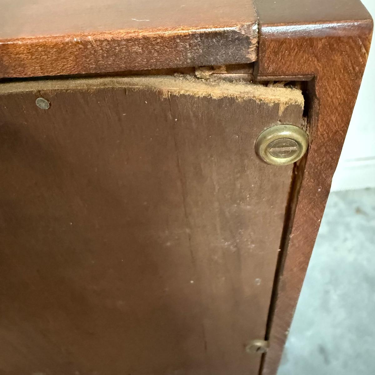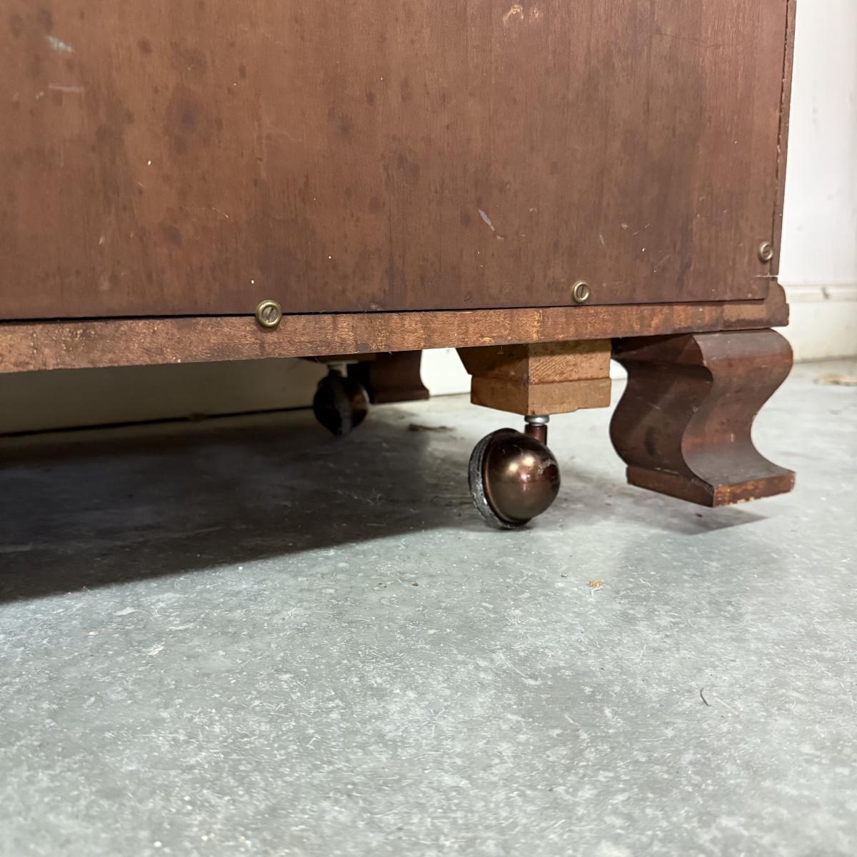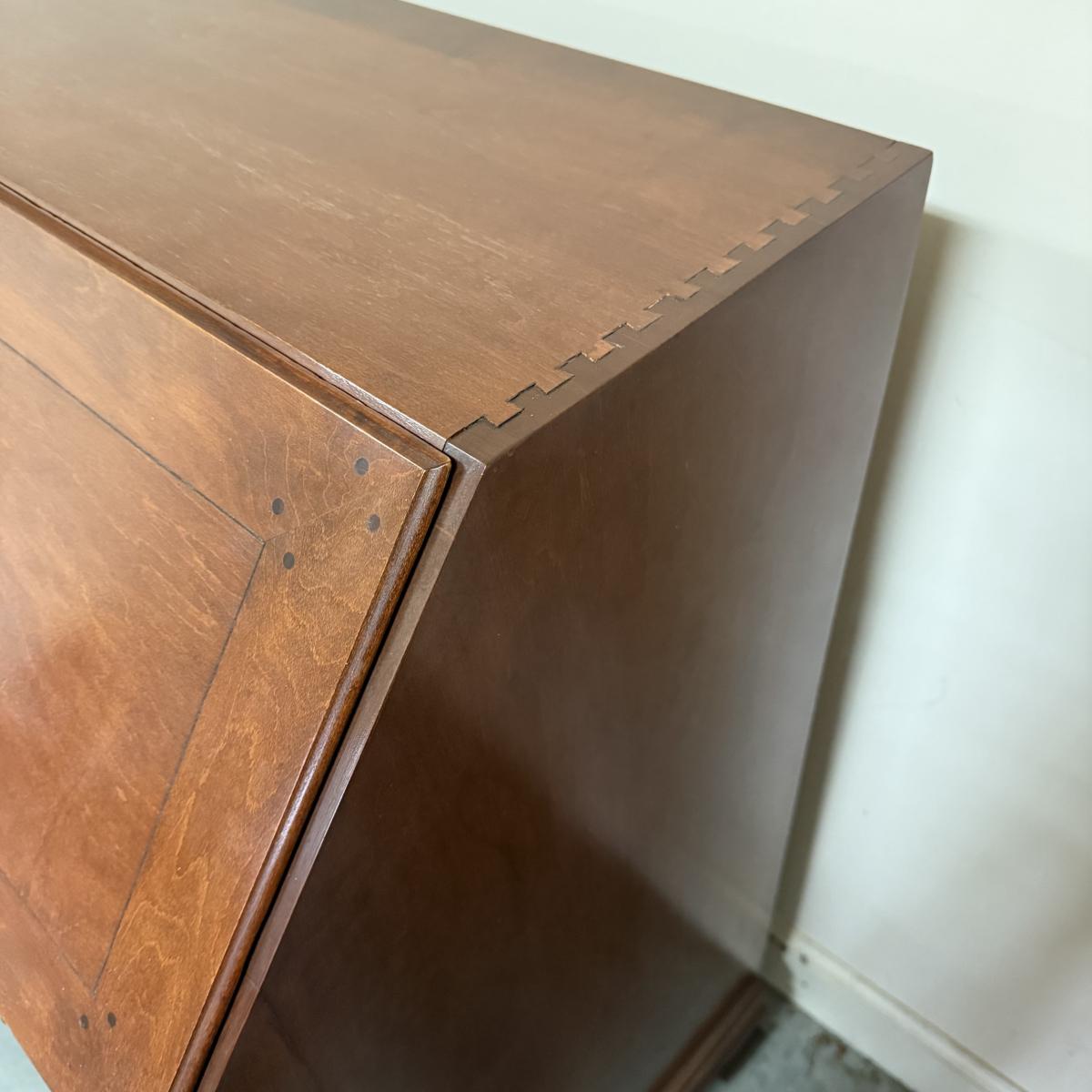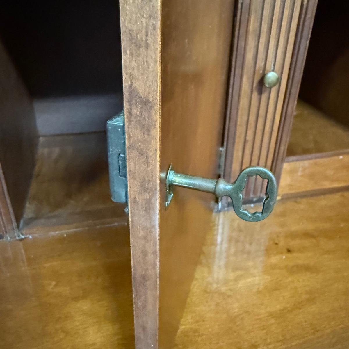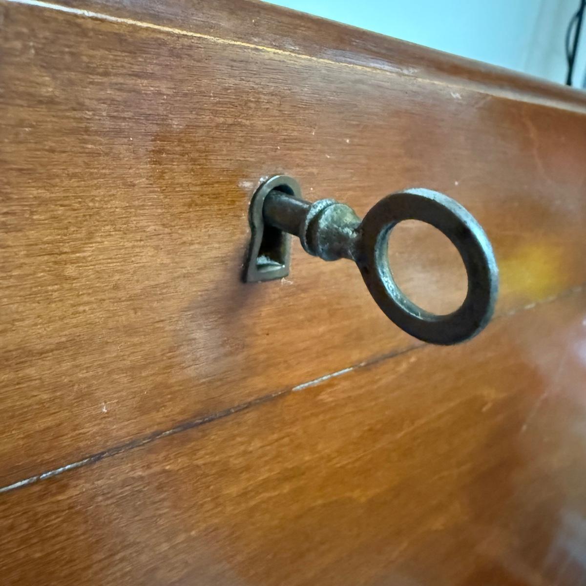 Beautiful wooden Trutype brand secretary desk features dovetailed construction throughout. The desk rolls very smoothly and easily on casters. It measures 32.75” x 21” x 41.5”H. Two keys are included and both locking mechanisms function.