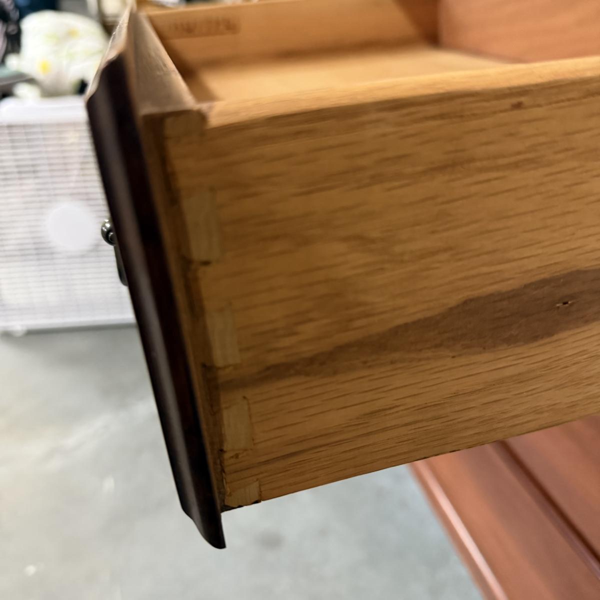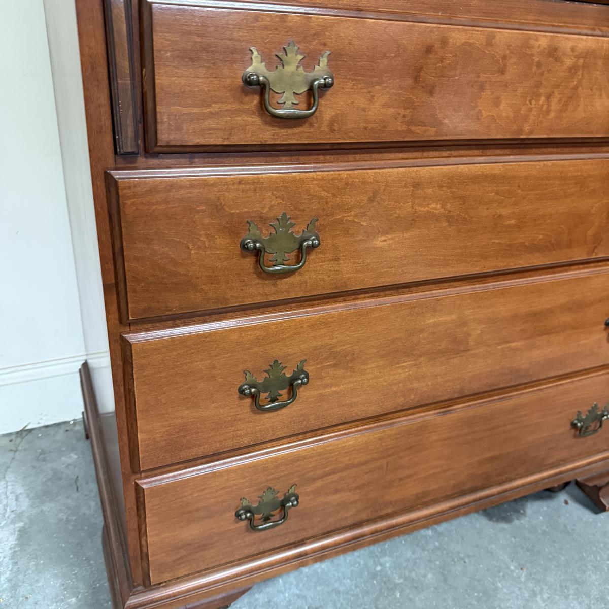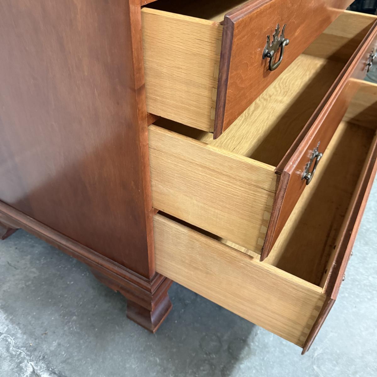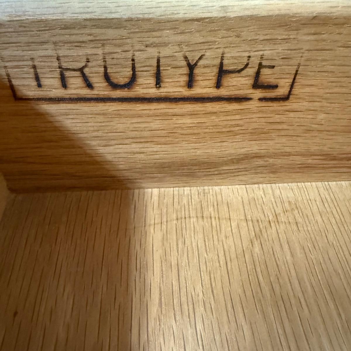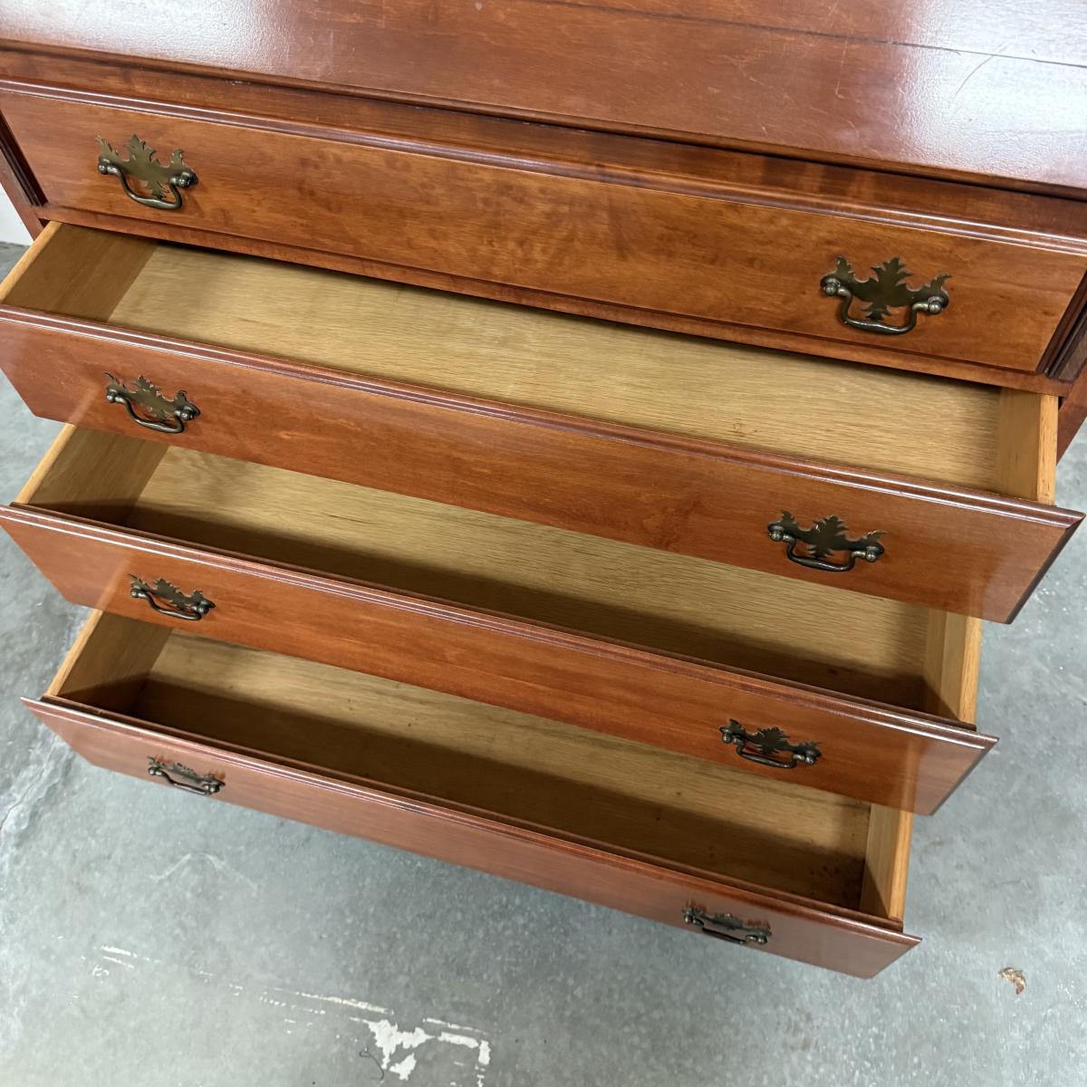 Beautiful wooden Trutype brand secretary desk features dovetailed construction throughout. The desk rolls very smoothly and easily on casters. It measures 32.75” x 21” x 41.5”H. Two keys are included and both locking mechanisms function.