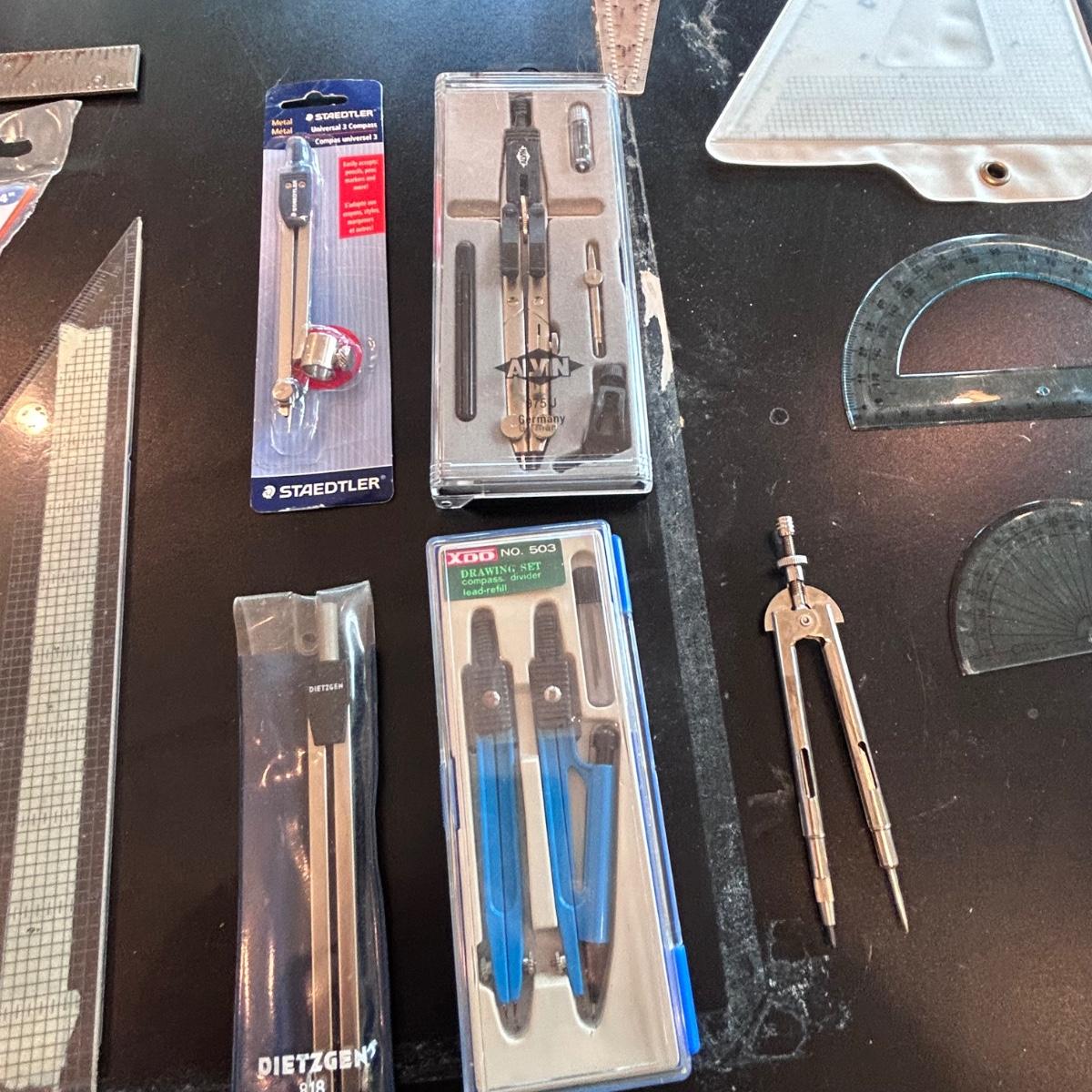 Lot includes all types of measuring devices. Four T squares. Three drafting rulers, three triangles, four compasses, and more. Devices are in all sorts of materials like plastic, aluminum, steal and wood. Local pick up only.
