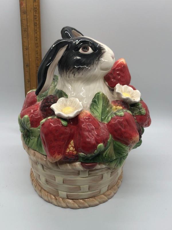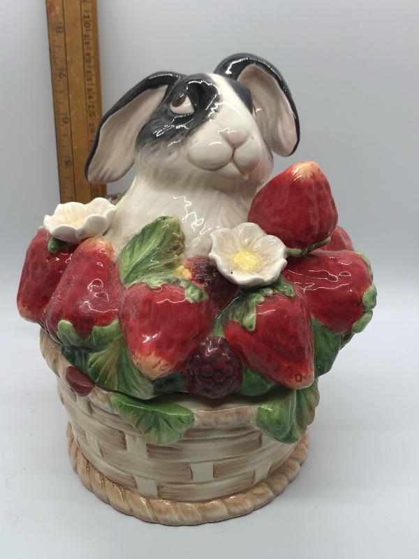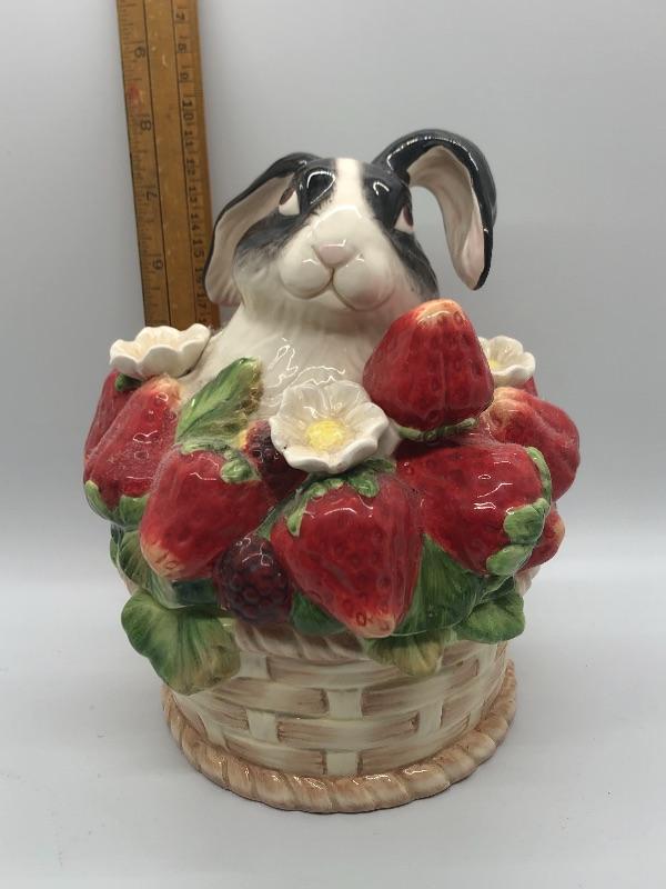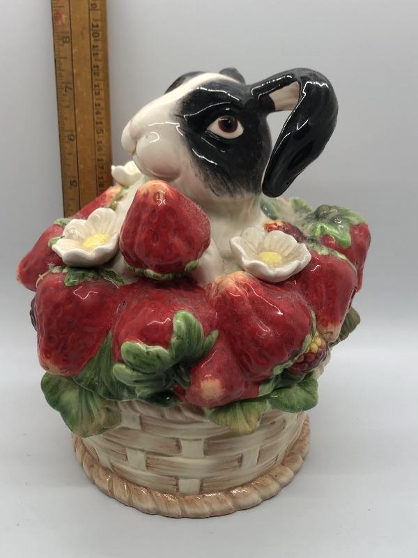 Rare Kaldun & Bogle porcelain rabbit cookie jar with black and white Dutch Rabbit, bunny in a basket of strawberries and raspberries