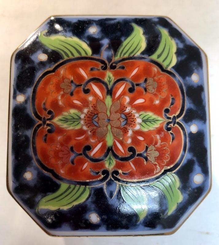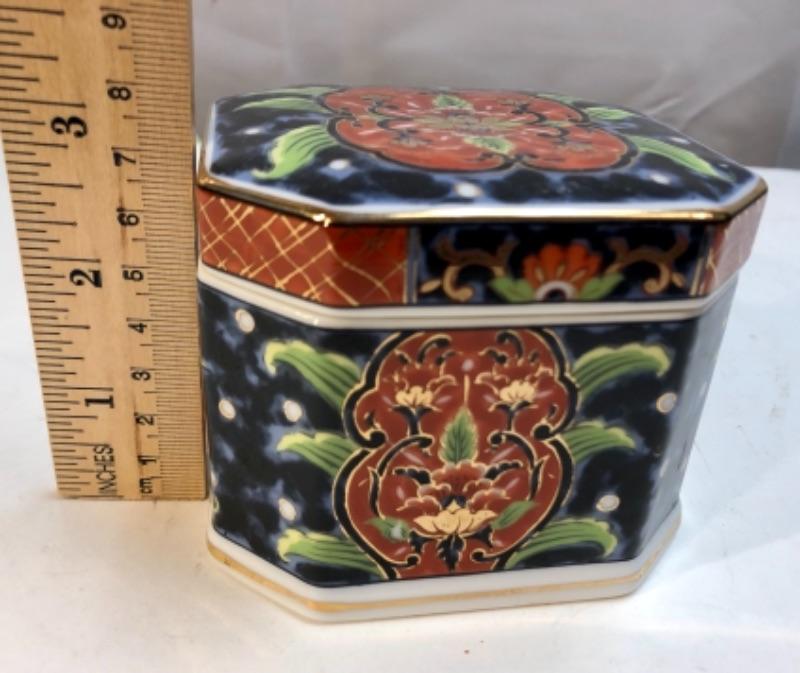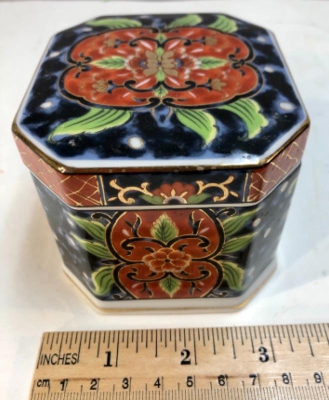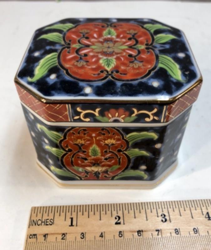 Small ceramic Asian design trinket box. 3" size. Good condition.