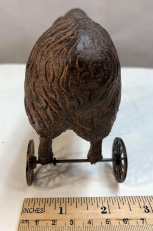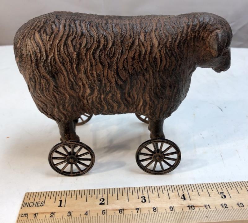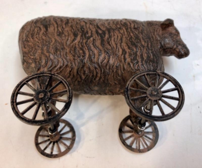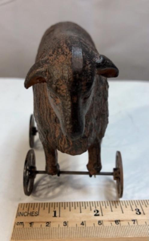 Small 5" metal sheep push toy replica. Great for rustic farmhouse decor.