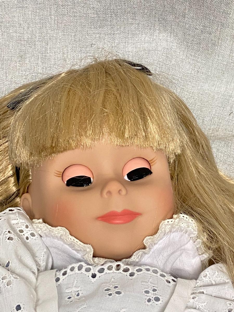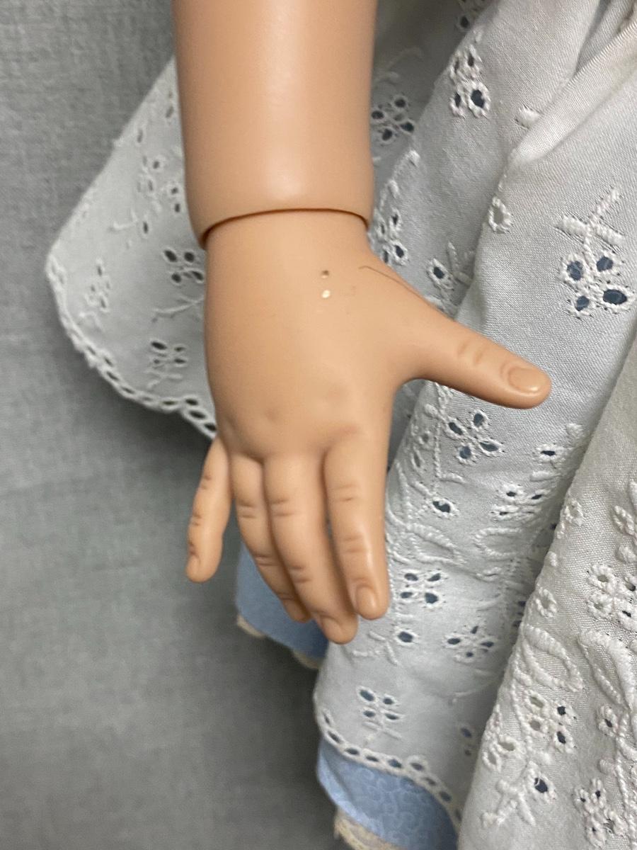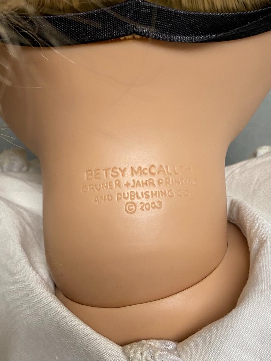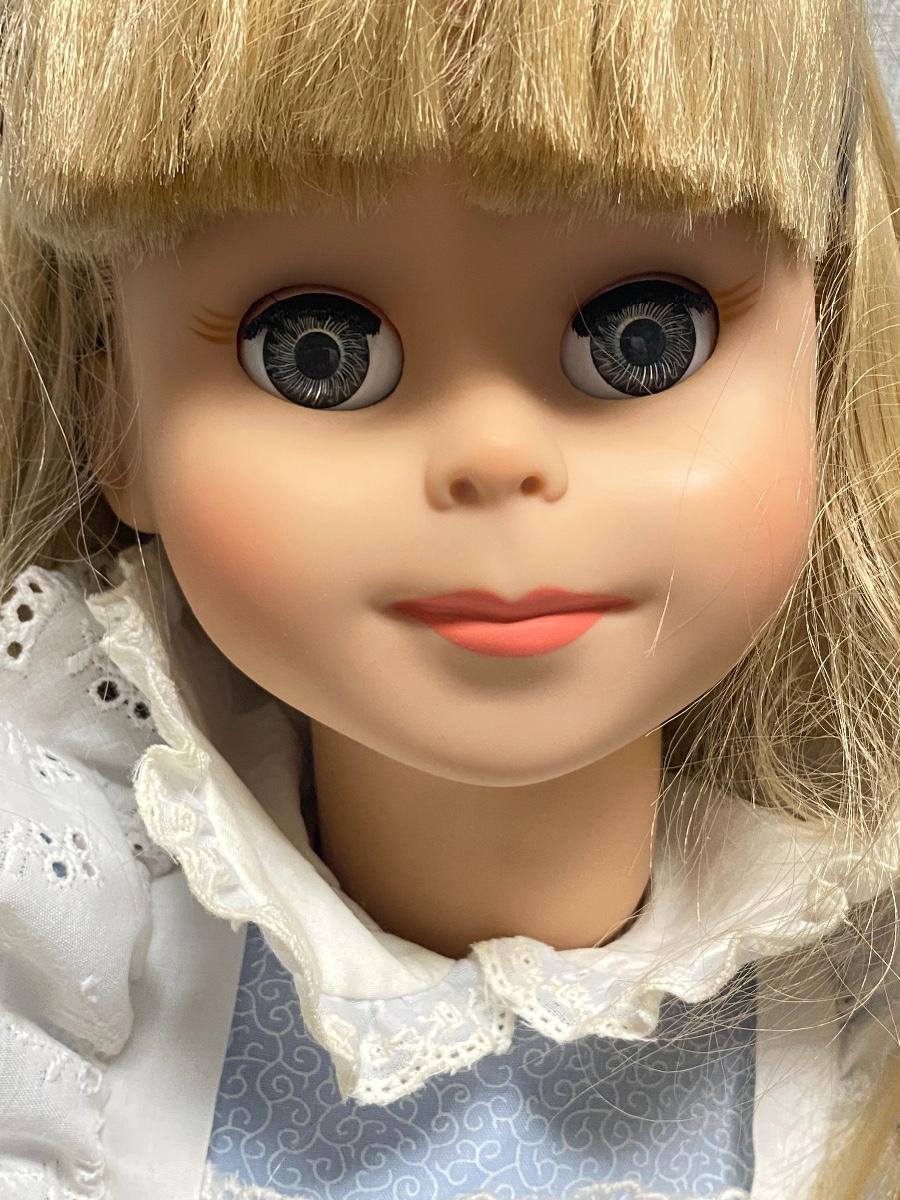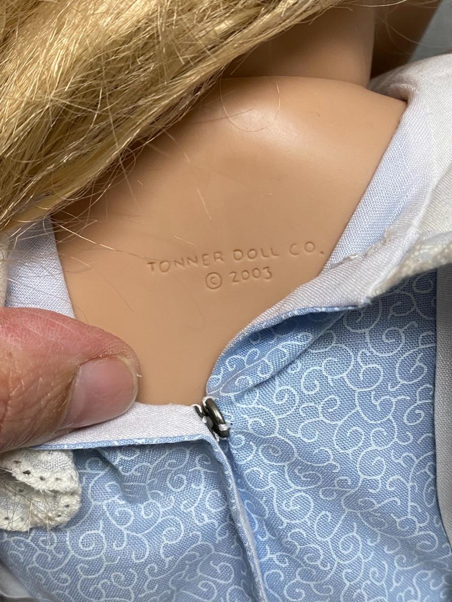 2003 Betsy McCall & Tonner Dolls Alice in Wonderland doll. Hard vinyl plastic, jointed neck shoulders, waist, hips and ankles. Sleepy eyes. In good condition, a little dusty discolor from display. About 26" tall.
