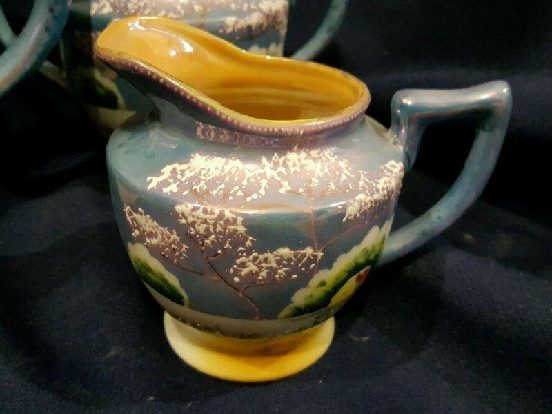 Gorgeous luster-ware set. Purple/blue as the main color with a lovely country scene hand painted. Peach luster-ware accents the blue. Tea pot measures 8.5 x 7.25 x 5. Creamer measures 4.5 x 3.75 x 3.5. Sugar measures 6.5 x 5.5 x 4. (Shipping Weight Approximately 4 lbs)