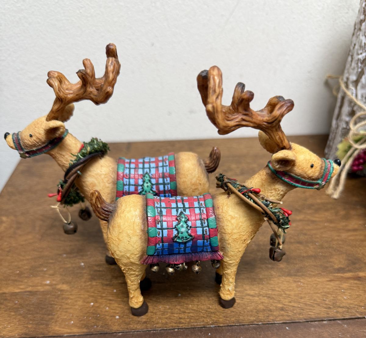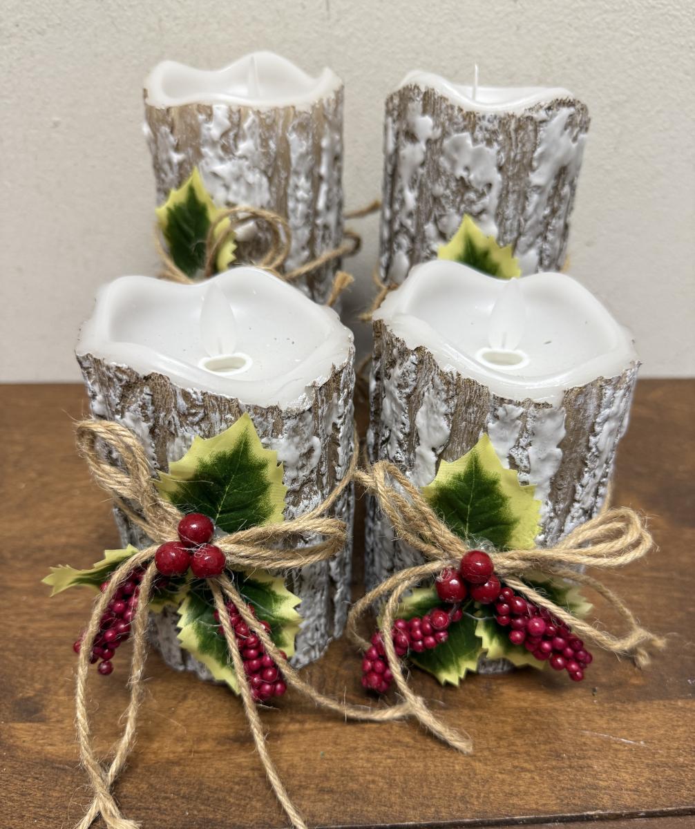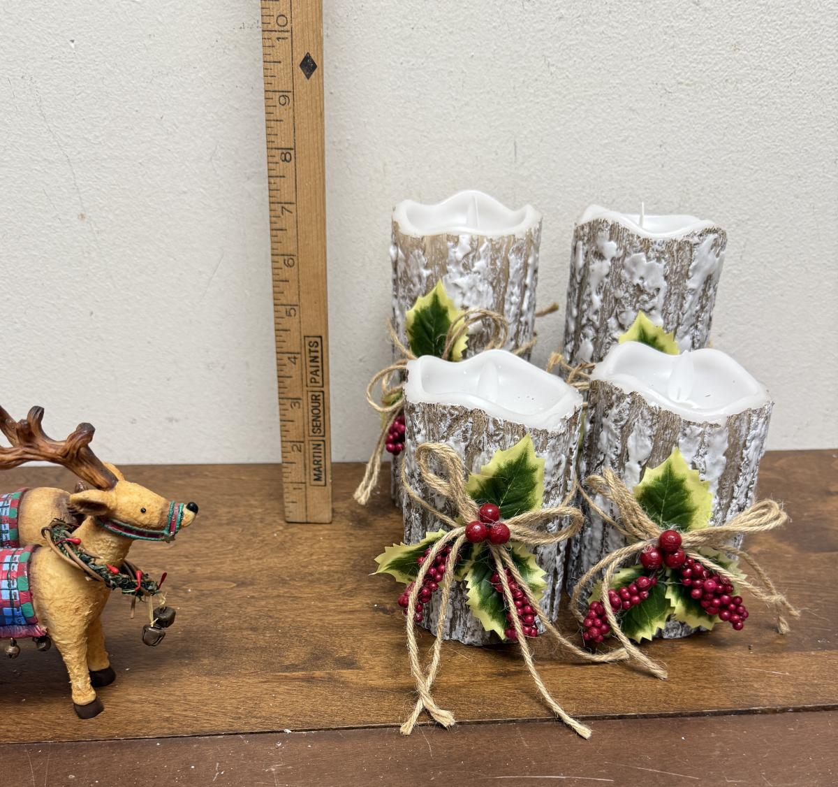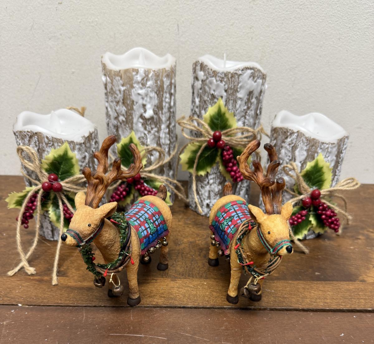 Christmas Decor Lot - Flameless Candles Tree bark Design plus 2 Reindeer dressed in plaid