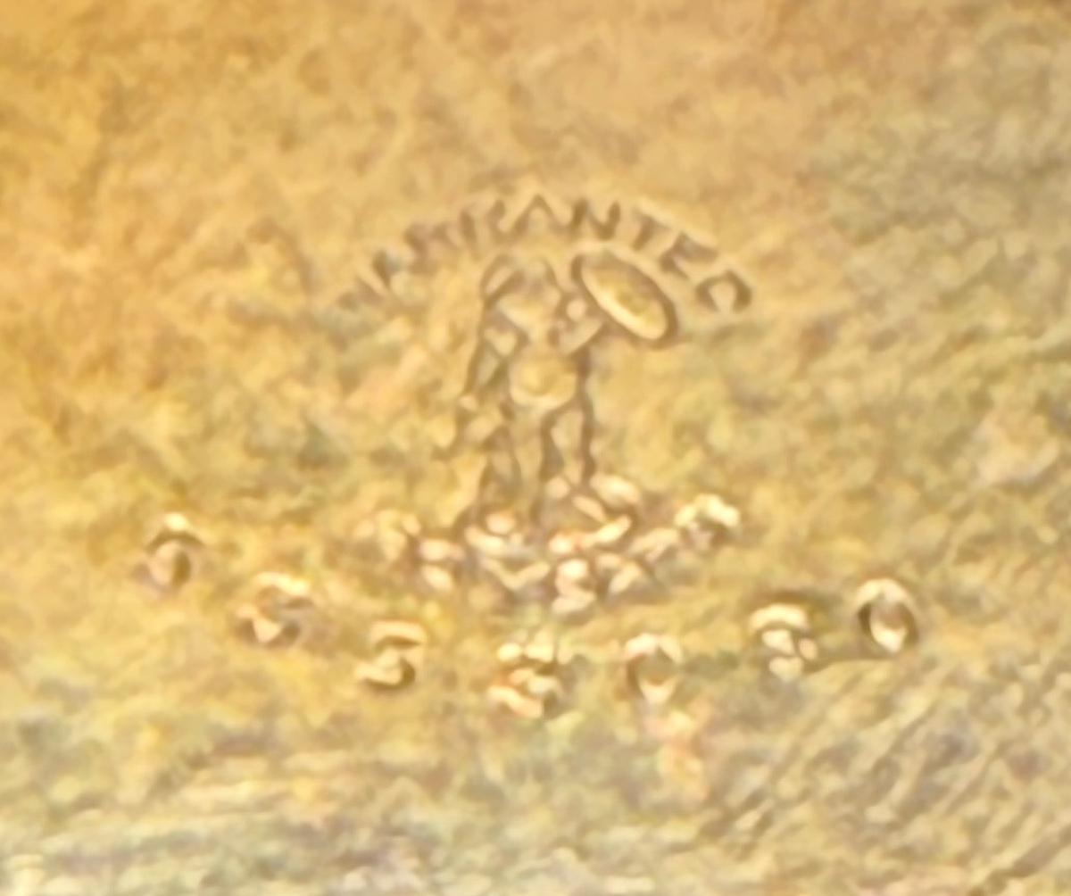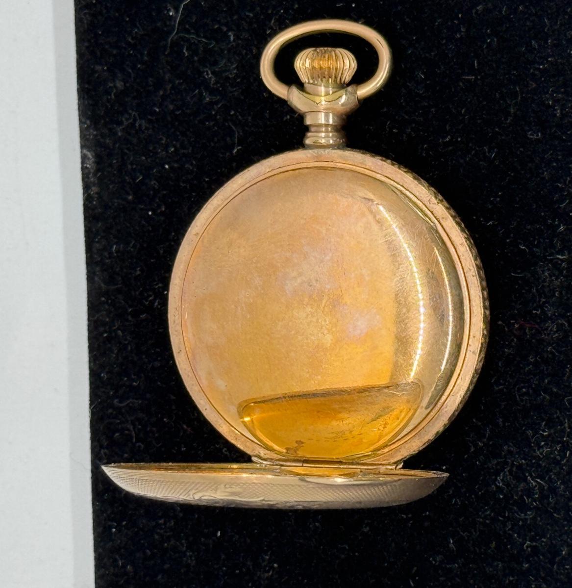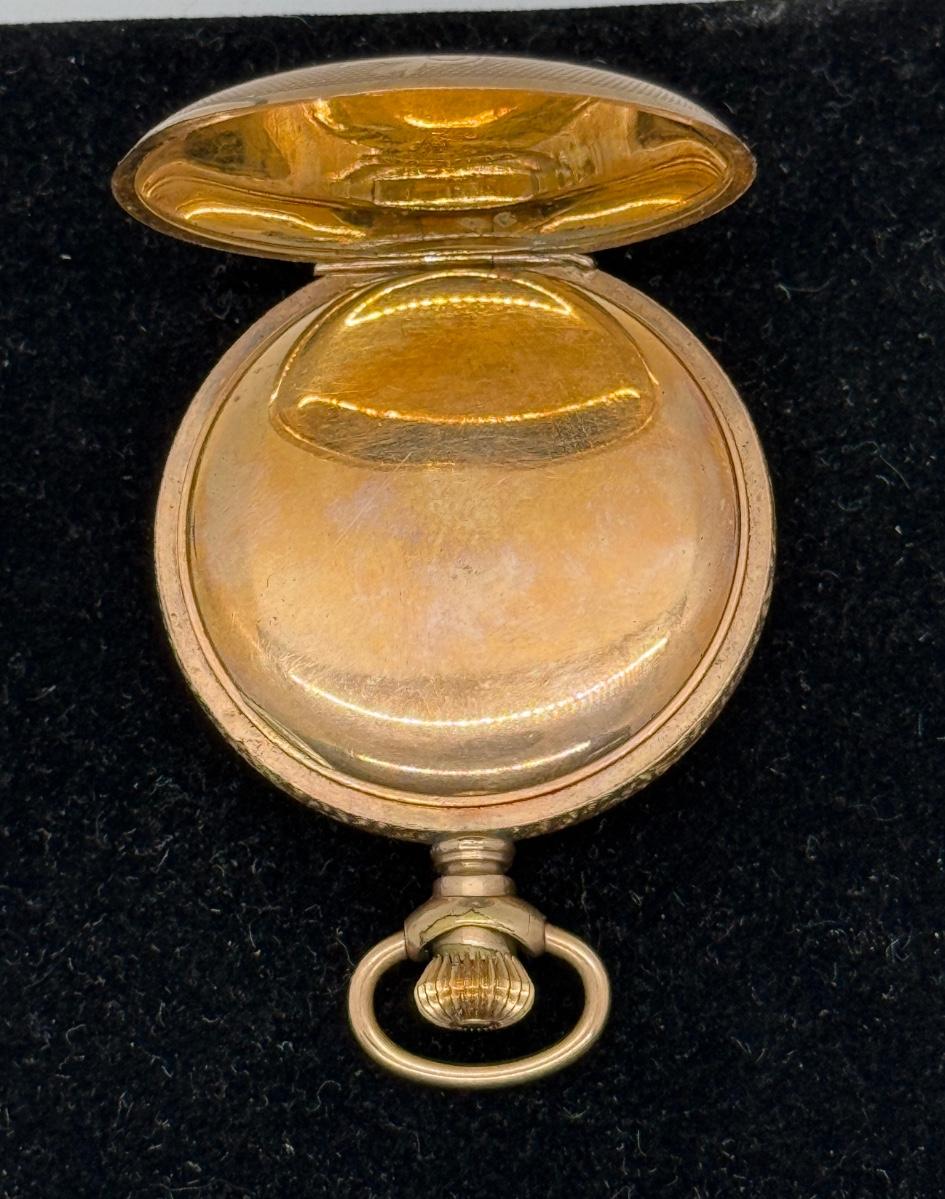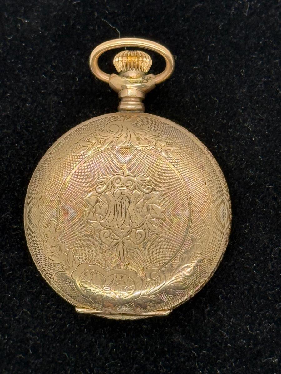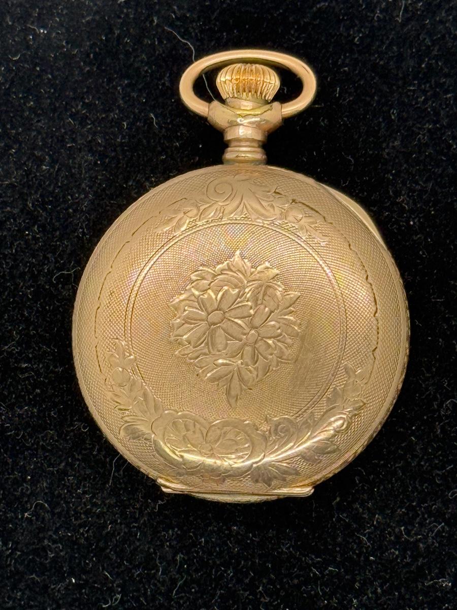 Gold-tone Double Hunter case with a fancy dial. Watch case serial number is 5353080, movement number is 6829243, indicating manufacturing date in 1896. Sidewinder style (crown is at the "3" position, not "12"). No markings to indicate the case is made using gold or gold fill. Not observed to be working, but wheels were seen to be moving when the case was opened to obtain the movement serial number. May simply need a cleaning and adjustment by a competent watch servicer.