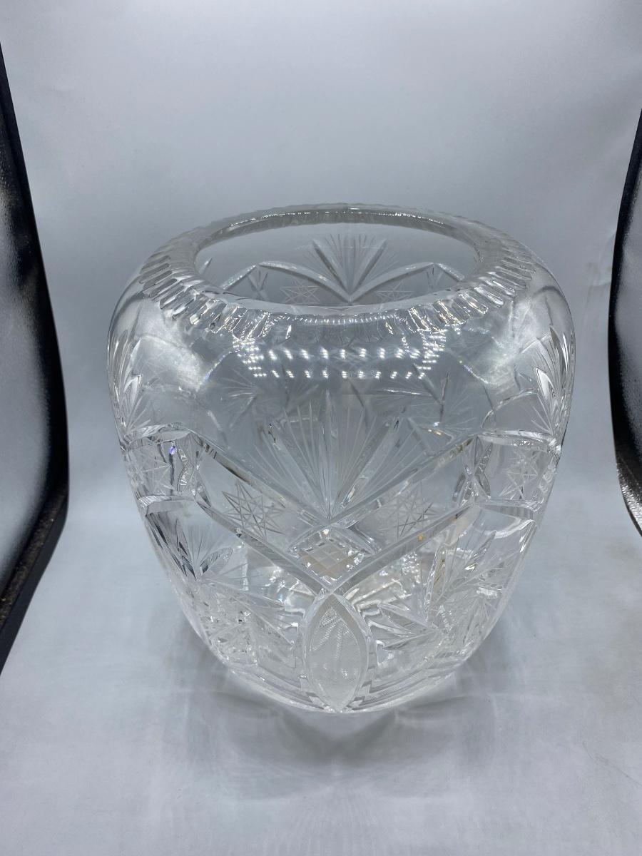 Large Heavy Quality Cut Crystal Flower Vase Pinwheel and Star Pattern. In very good condition. No maker name or sticker. Looks to be nice quality, very clear crystal. Has a pinwheel and star design. About 12" tall and 10" wide near the top. No chips found.