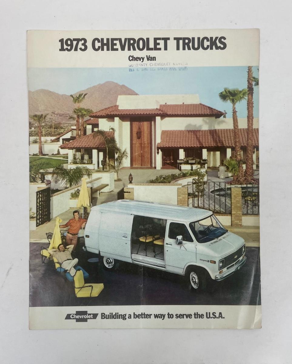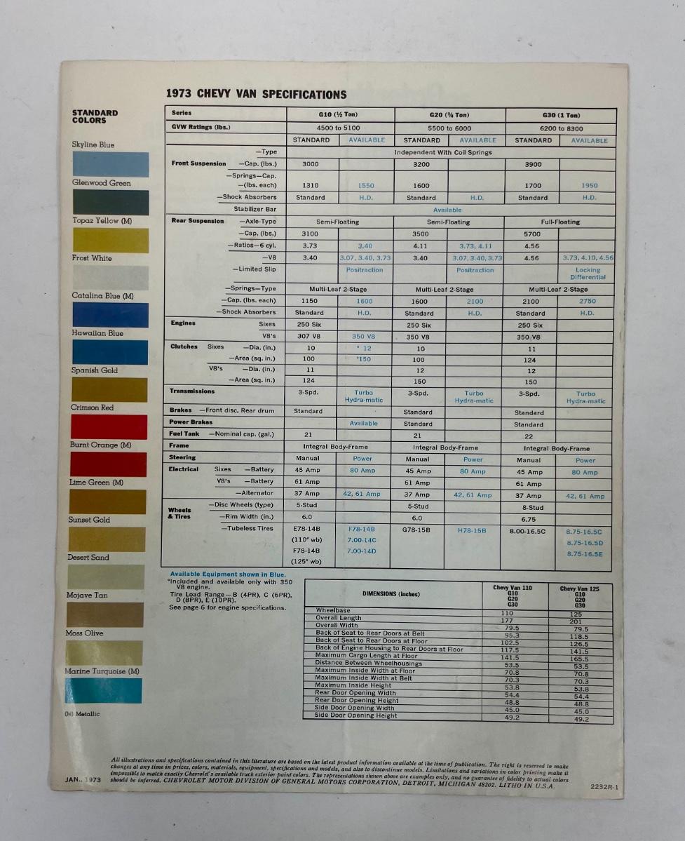 1973 brochure for various models of Chevy Vans, with Spec. charts, color option, and more. Stamped by Guaranty Chevrolet Motors of Santa Ana, California. Good vintage condition.