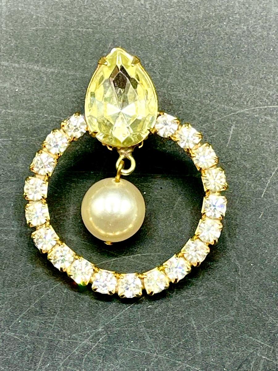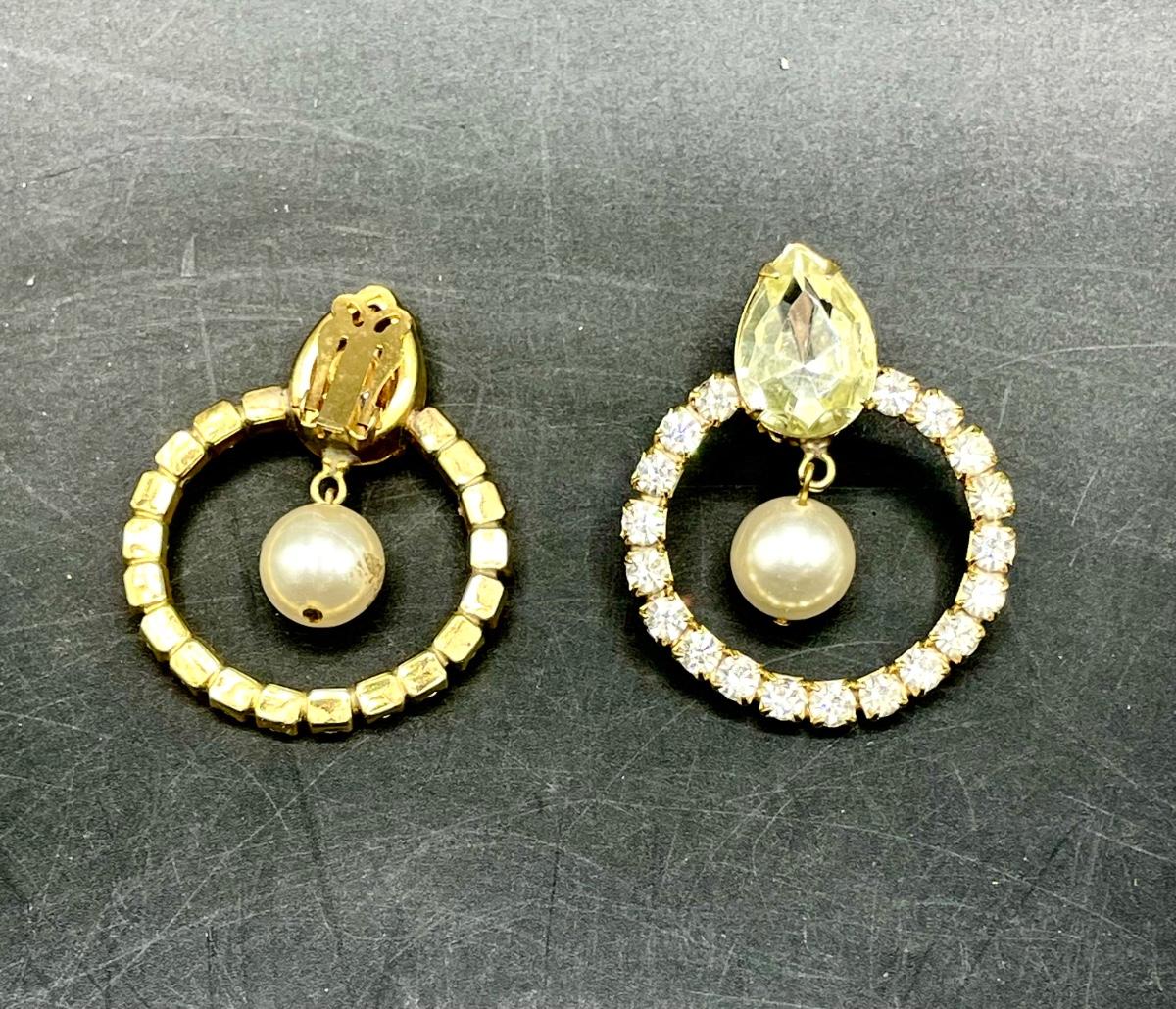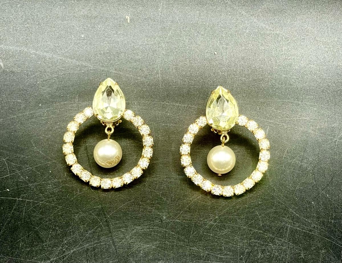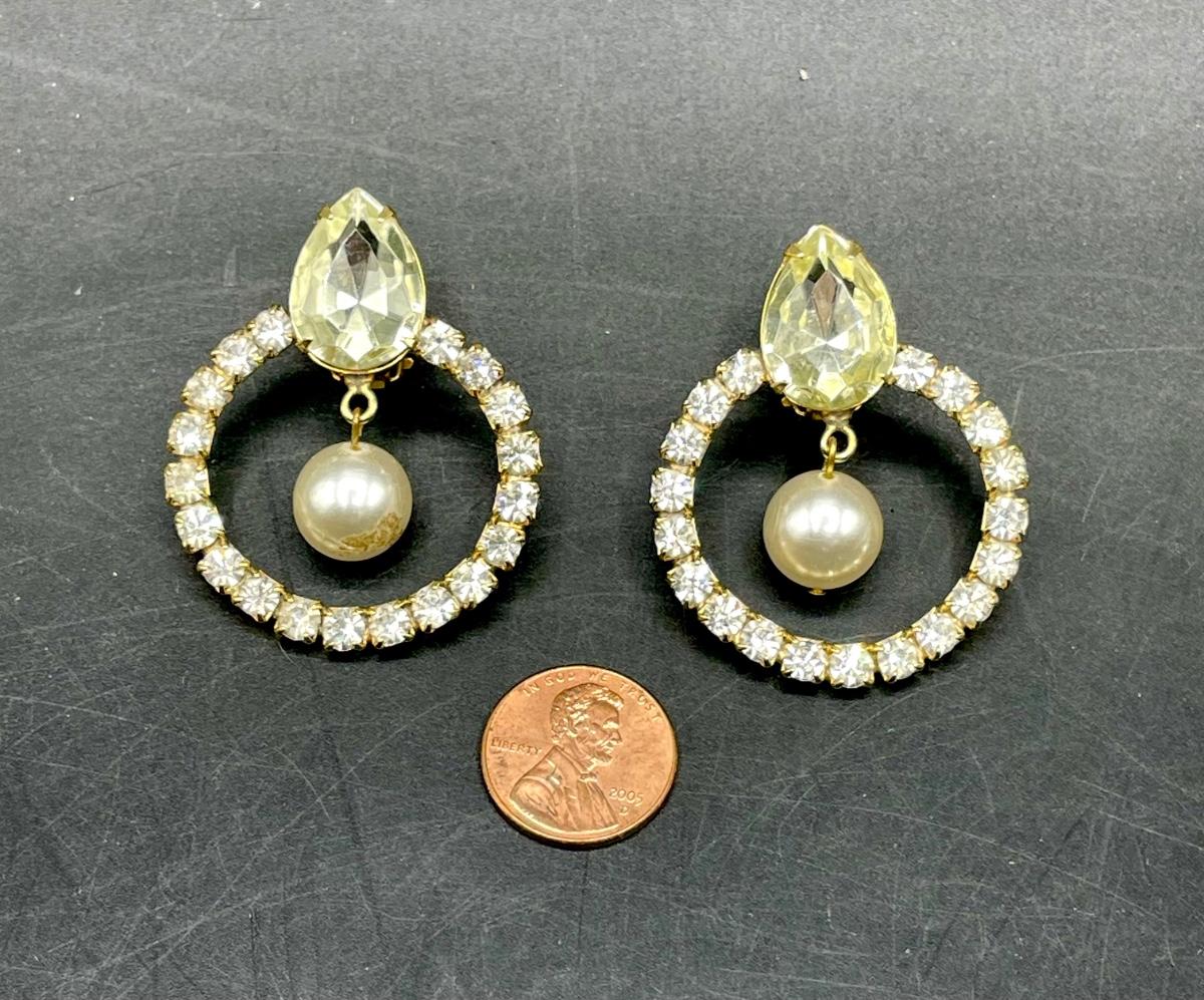Large pear-shaped rhinestone, dangling large pearl, and gold-tone hoop studded with diamond-like rhinestones.