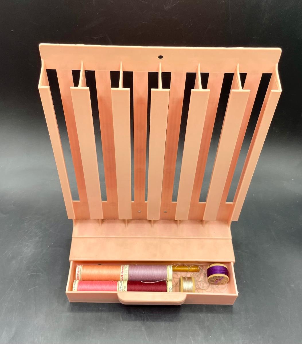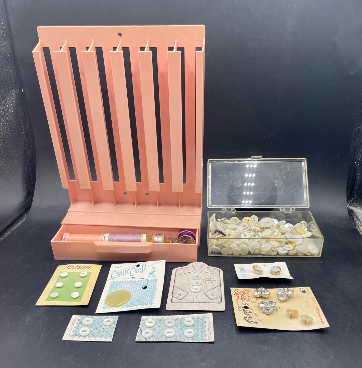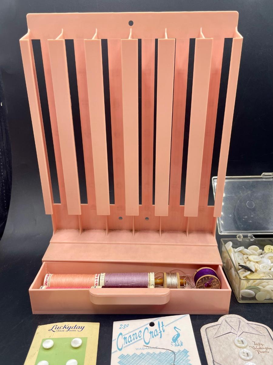 Vintage Plastic Spool Thread Holder and button lot. This is a great spool holder organizer. Pink upright holder is in excellent condition has a drawer at base, can stand upright or be hung on wall. Lots of vintage buttons, some still on cards. Please see all pictures for better description of what's included.