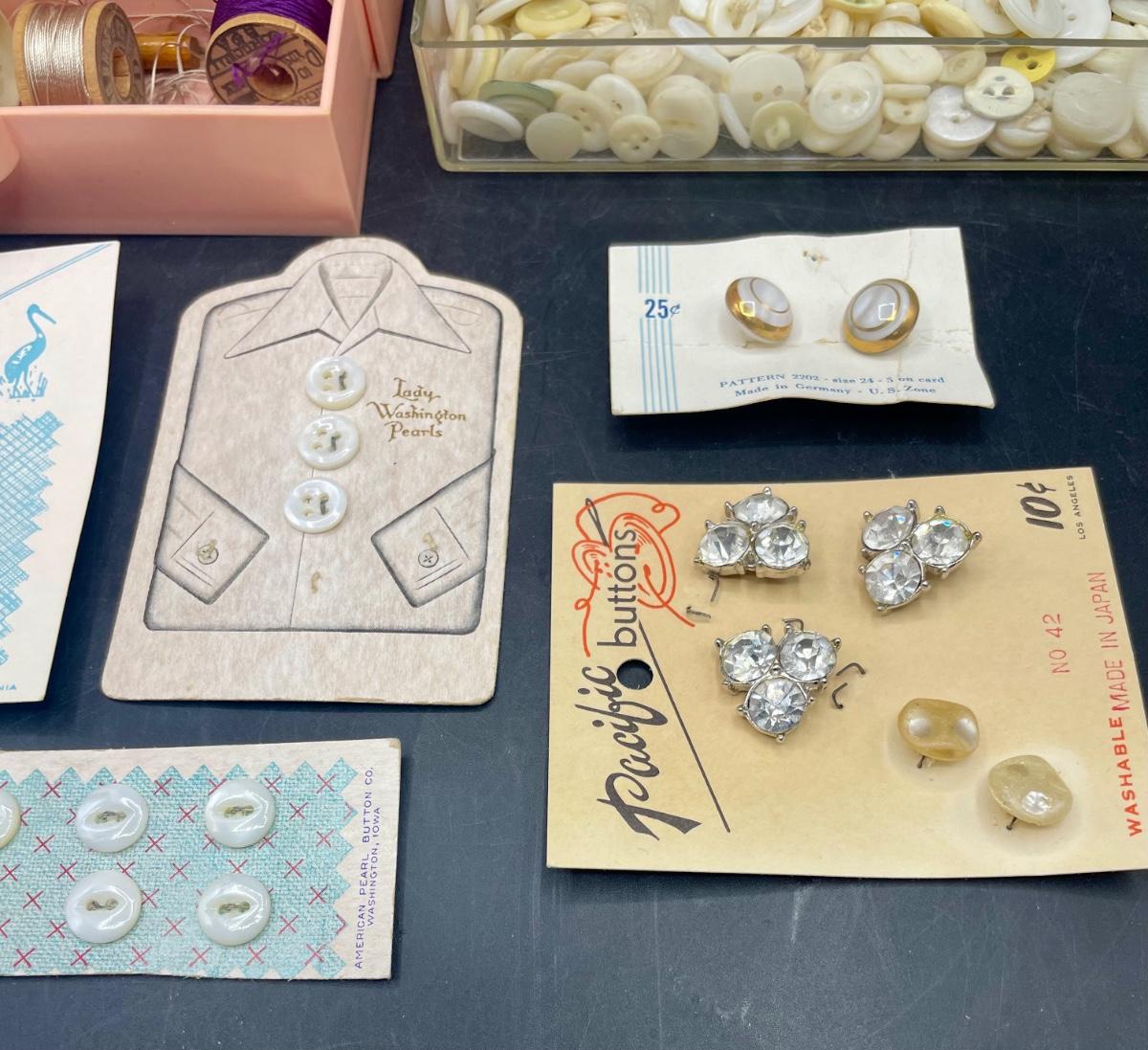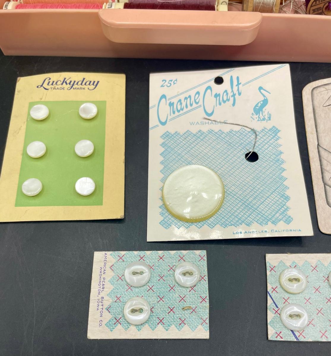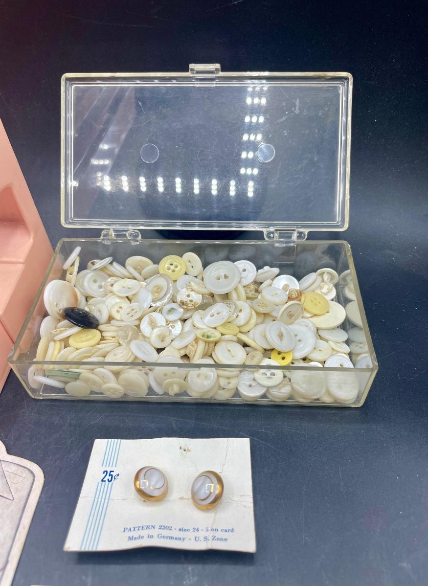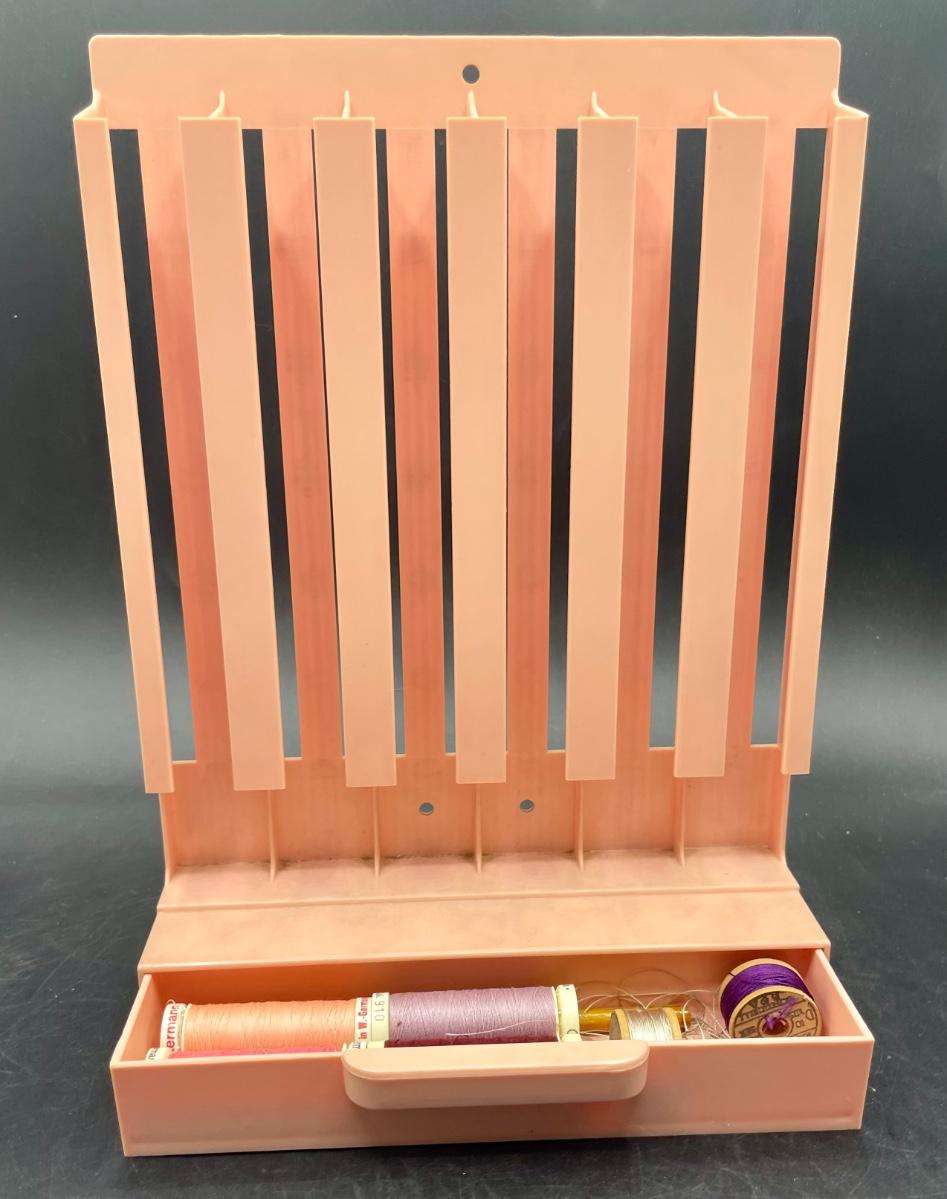 Vintage Plastic Spool Thread Holder and button lot. This is a great spool holder organizer. Pink upright holder is in excellent condition has a drawer at base, can stand upright or be hung on wall. Lots of vintage buttons, some still on cards. Please see all pictures for better description of what's included.