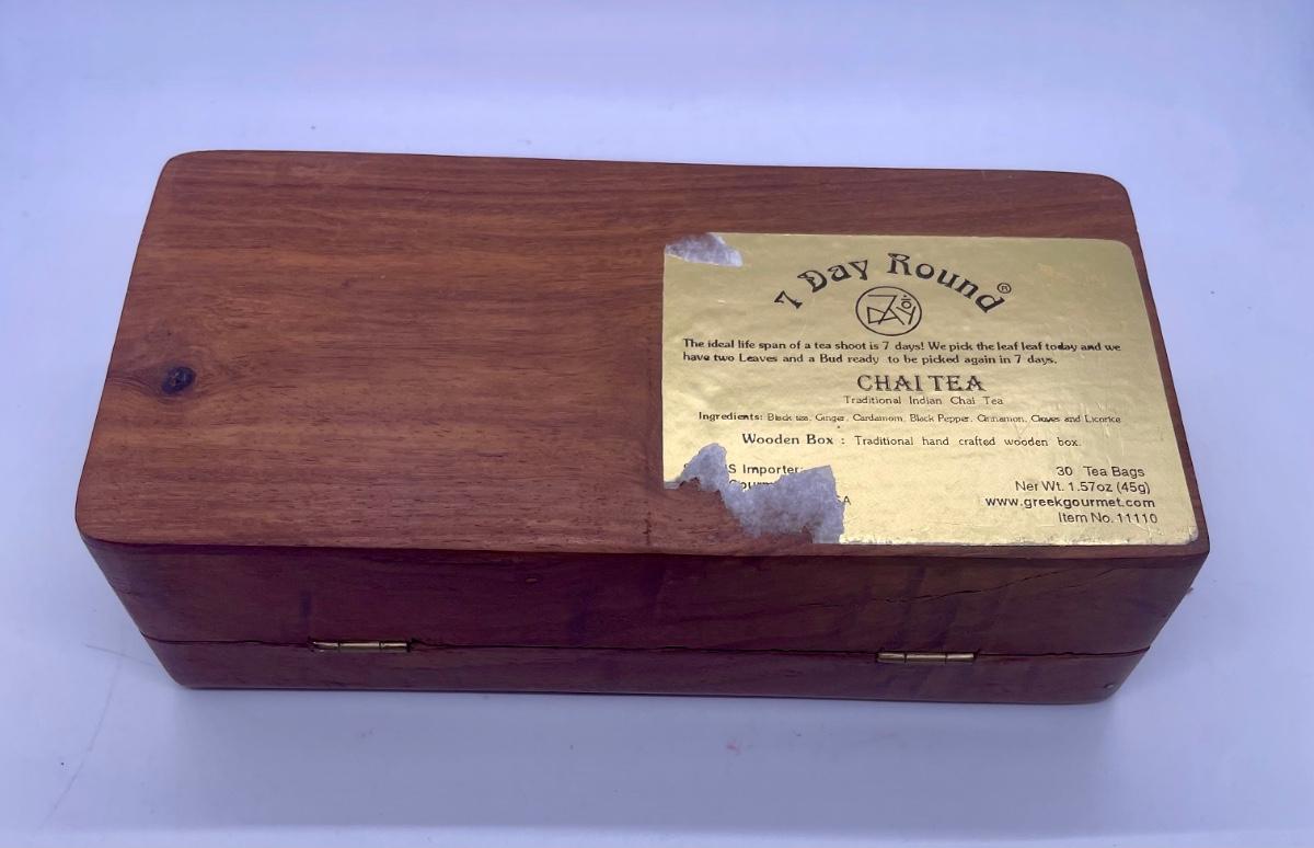 Originally a box for exotic tea. Hand made, beautiful flower scrollwork on the lid. Excellent condition.