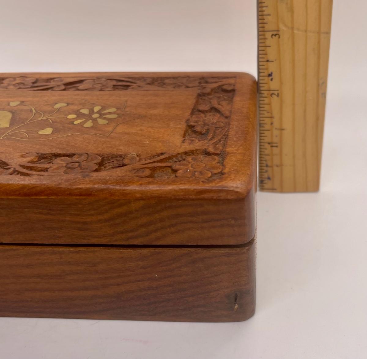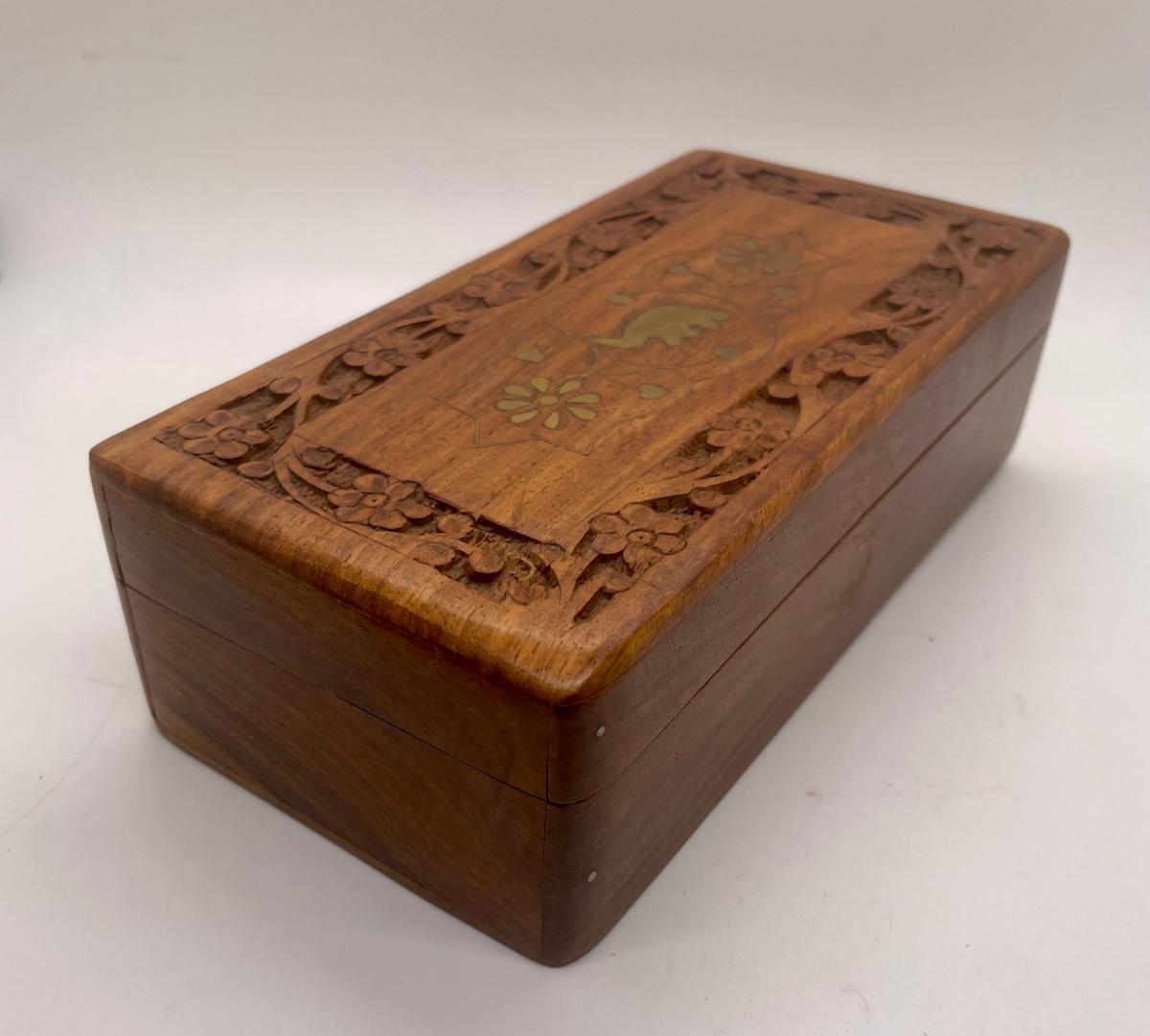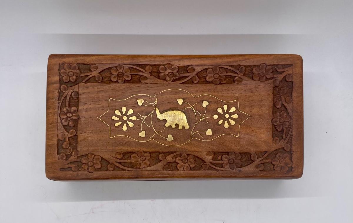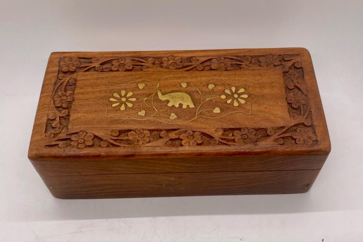Ornate Wood Tea Box with Metal Elephant and Flower Inlay