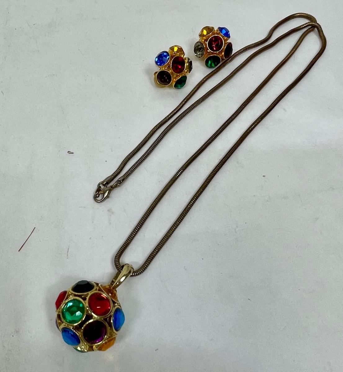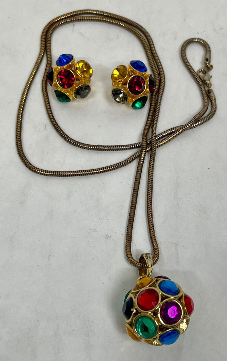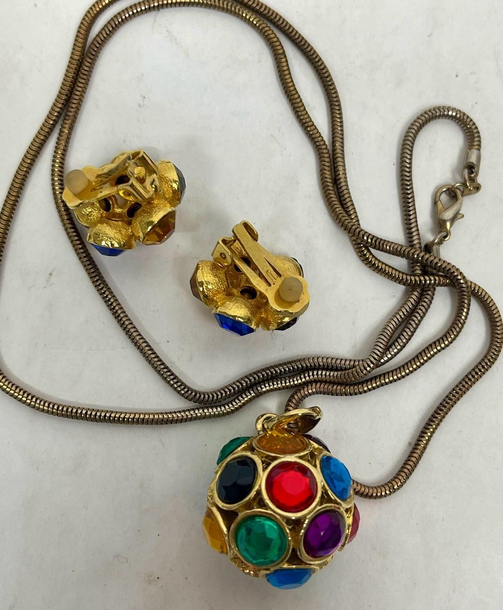 Necklace is approx. 28" long, matching clip-on earrings. Great condition!
