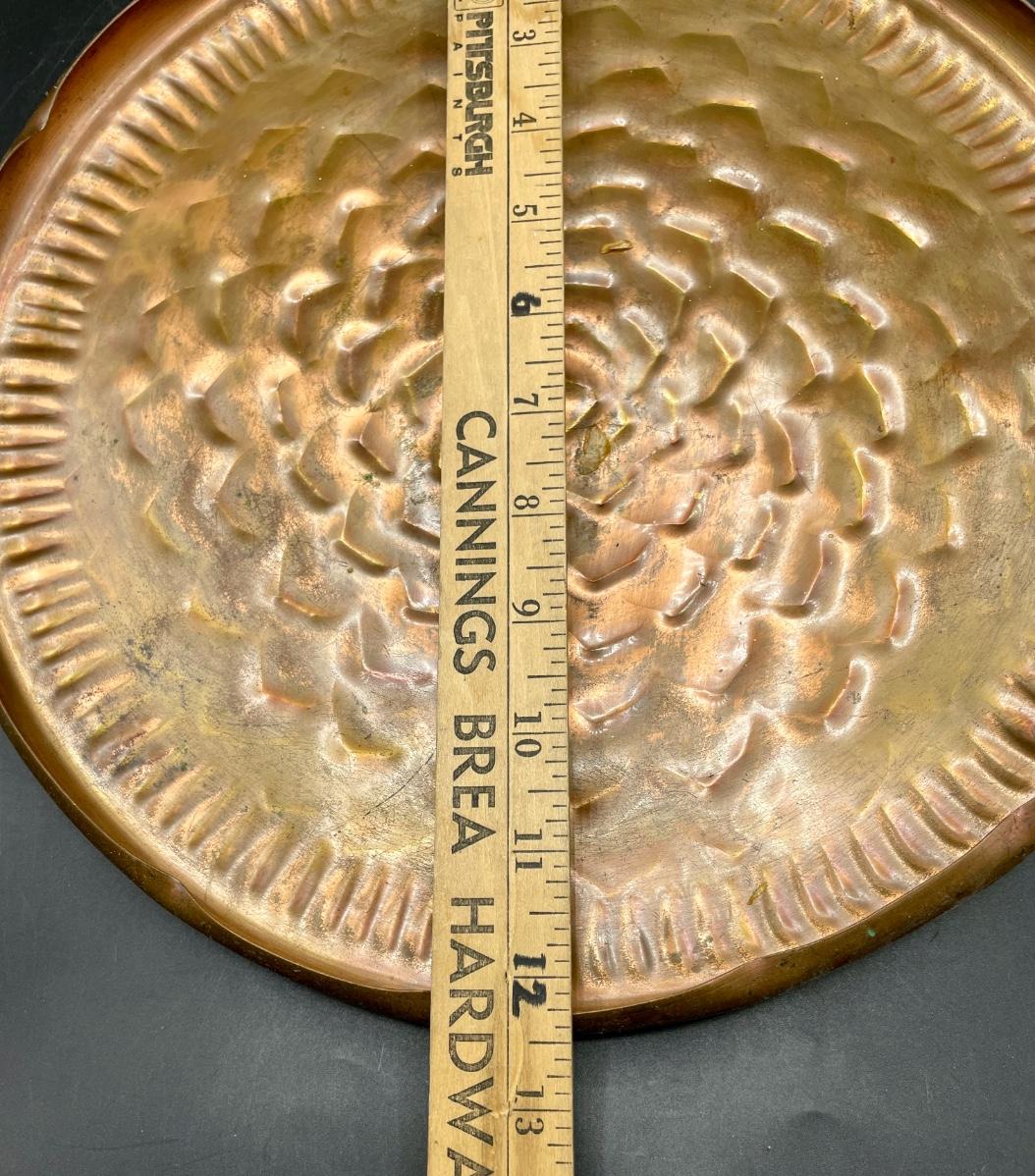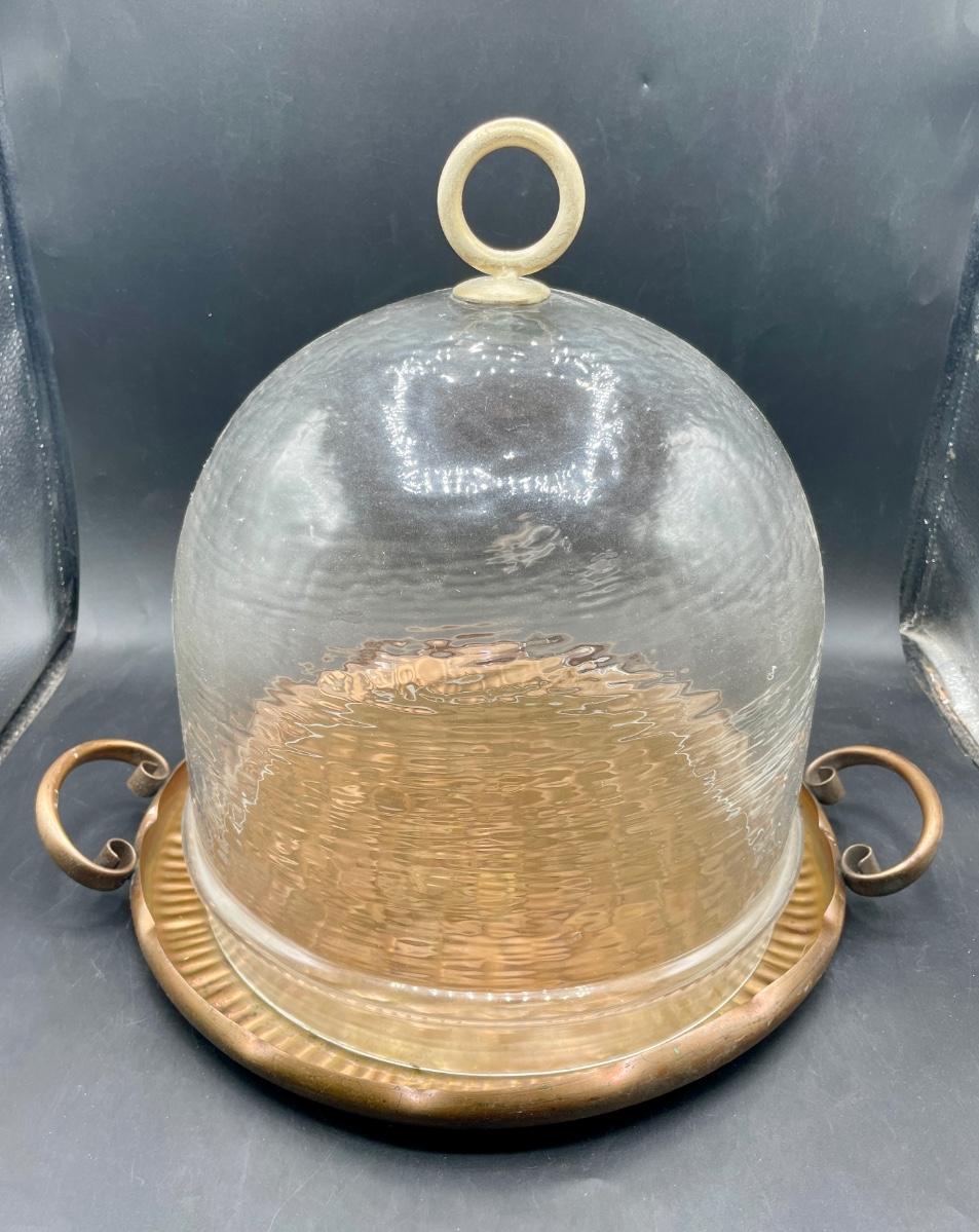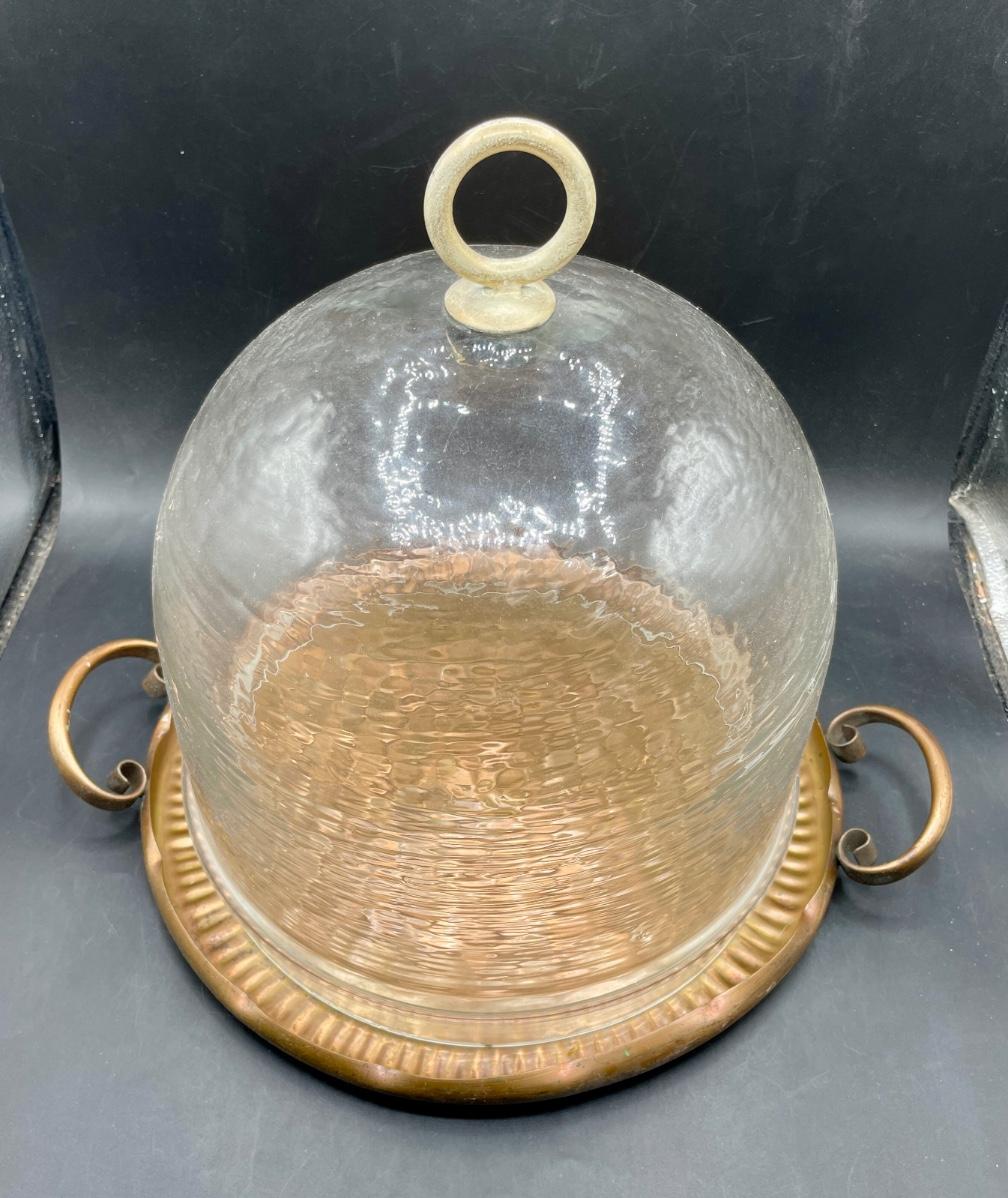 Glass dome is approx. 12" high, copper platter is approx. 12" across. Good condition.