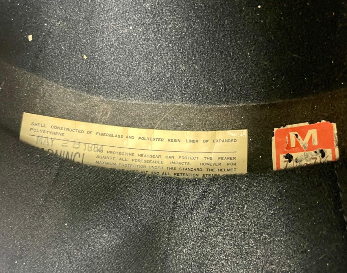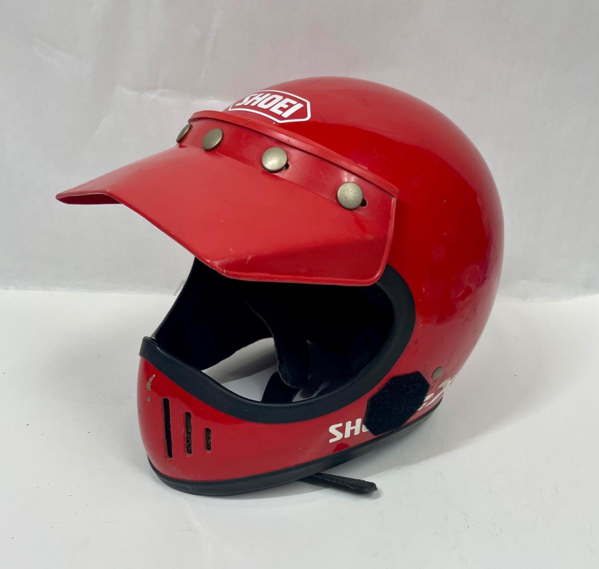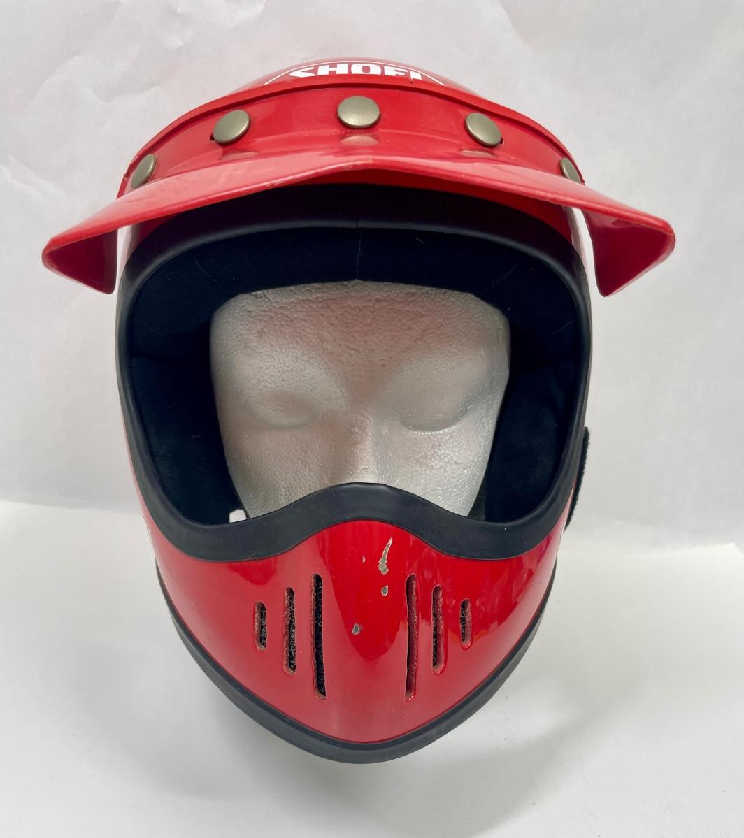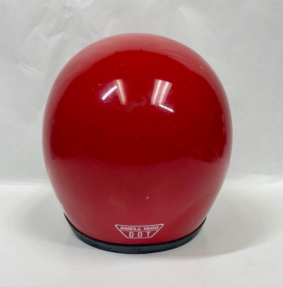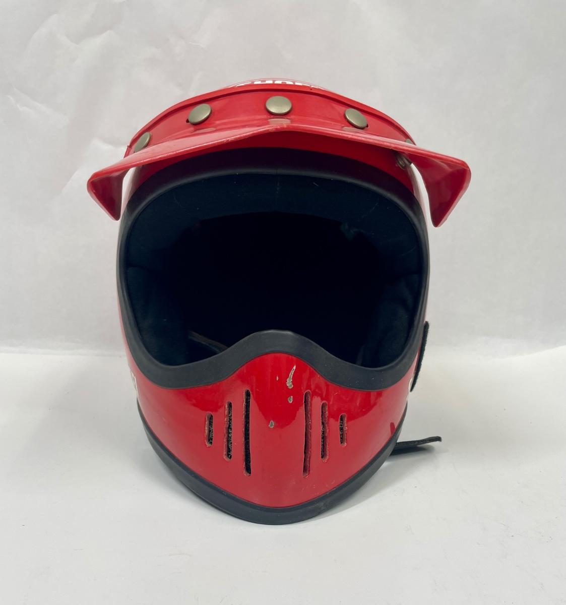 Bright Red. Size Medium (7 1/8 - 7 1/4). Produced in 1984. Good overall condition, some chips in the outer shell from flying sand/rocks. Snap-on plastic sun visor. Chin strap and liner in good condition, see photos.