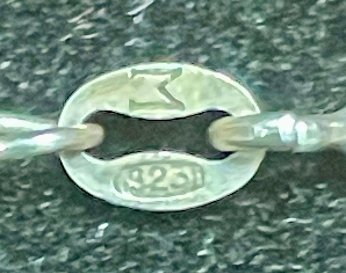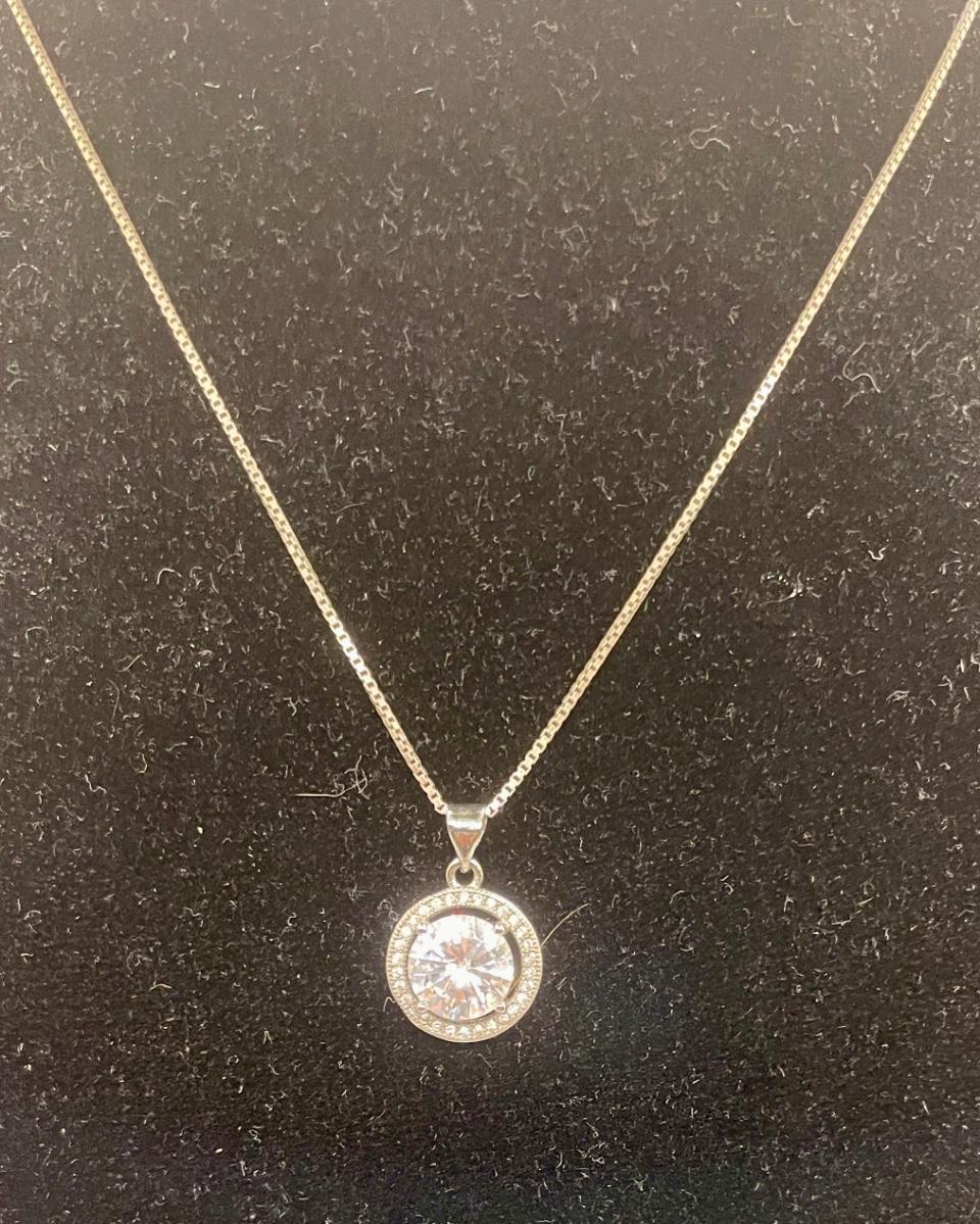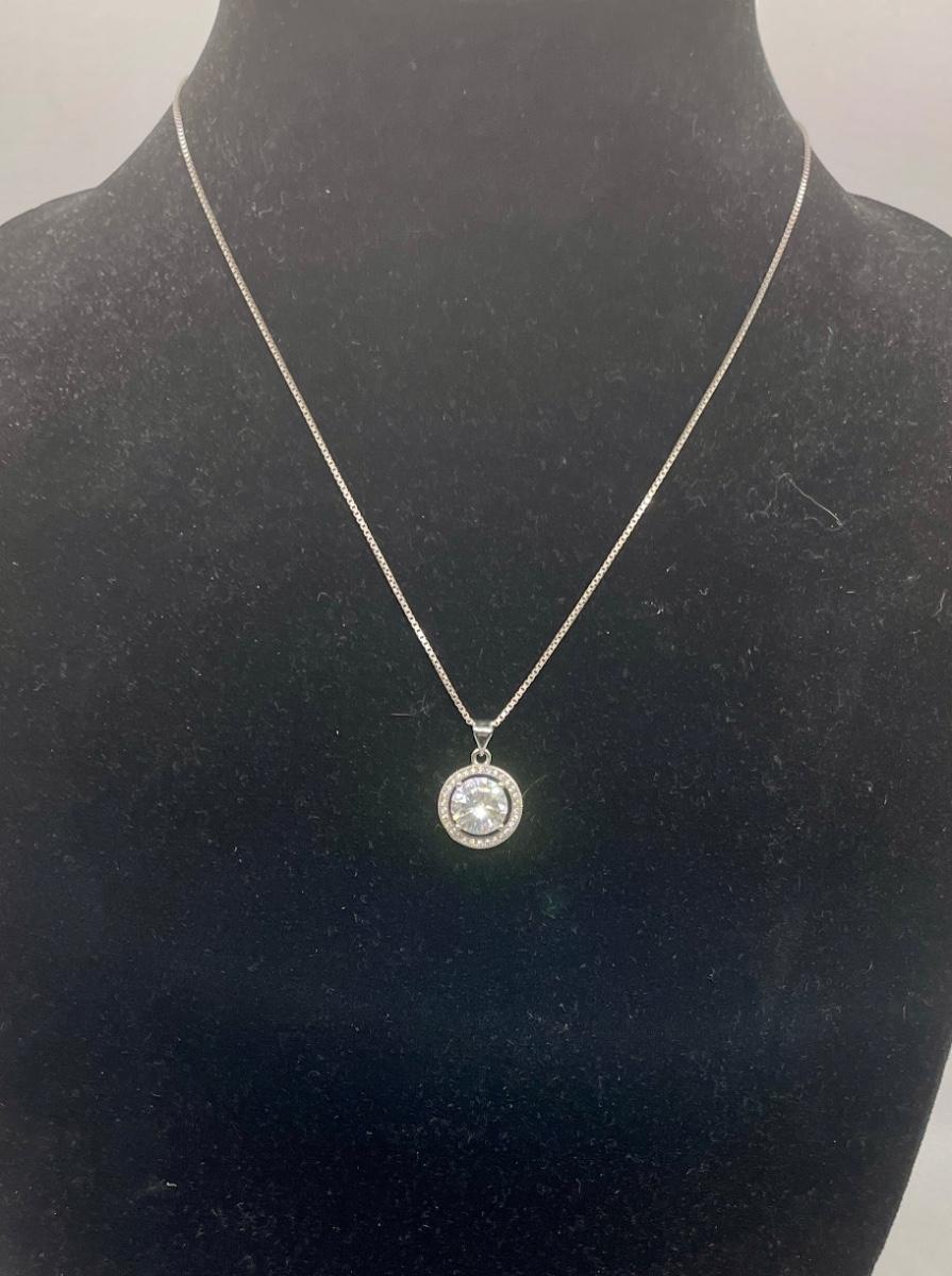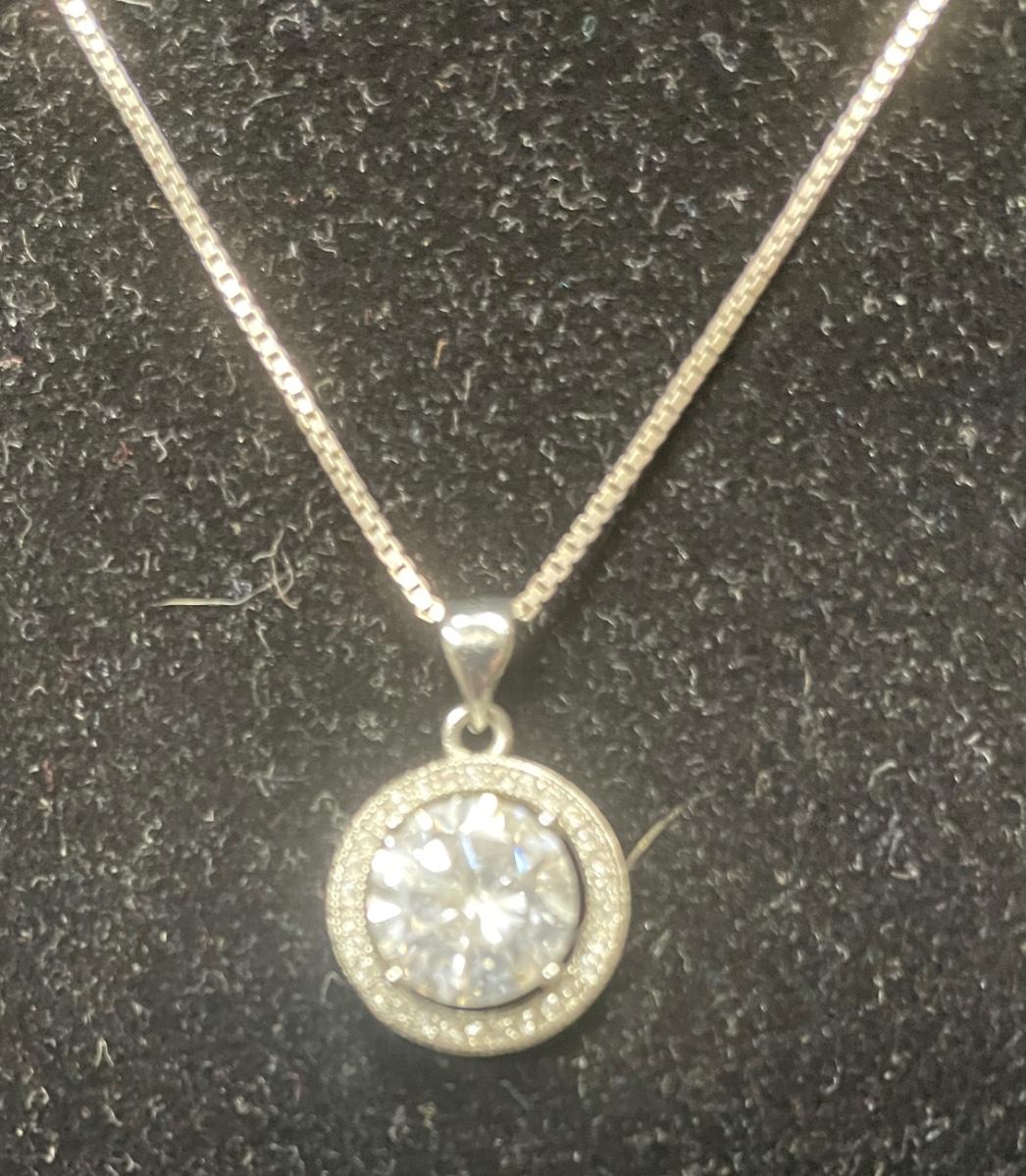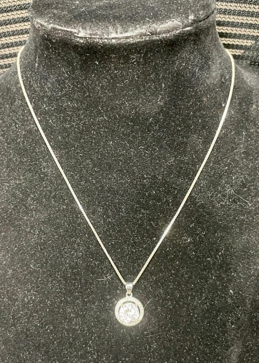 18 inch .925 sterling silver necklace with solitaire faux diamond pendant. Good condition.