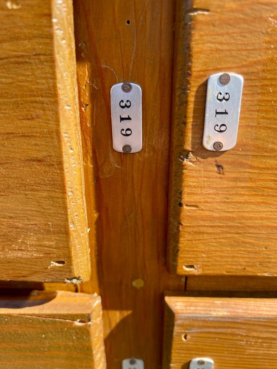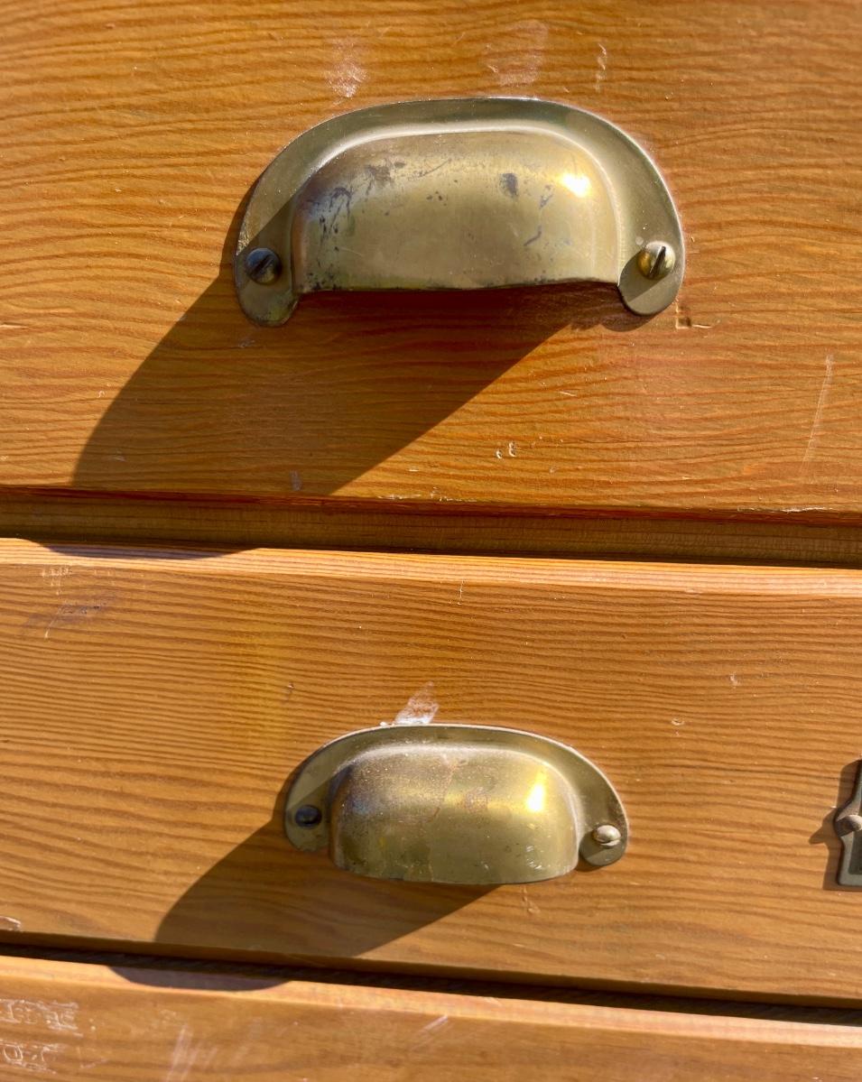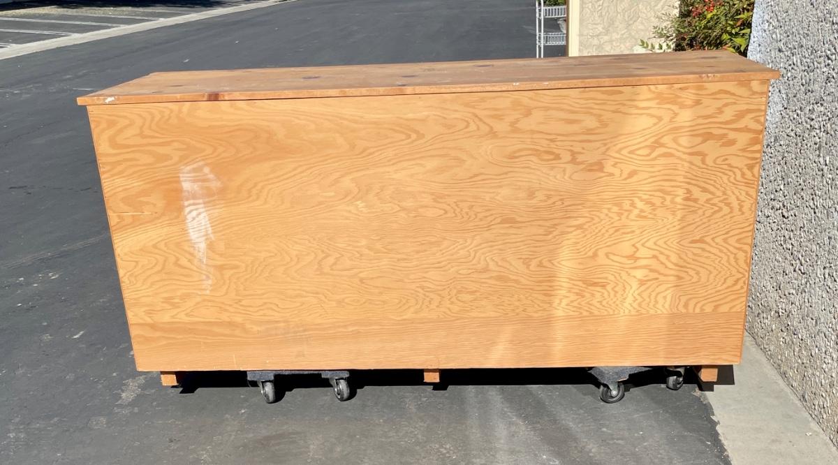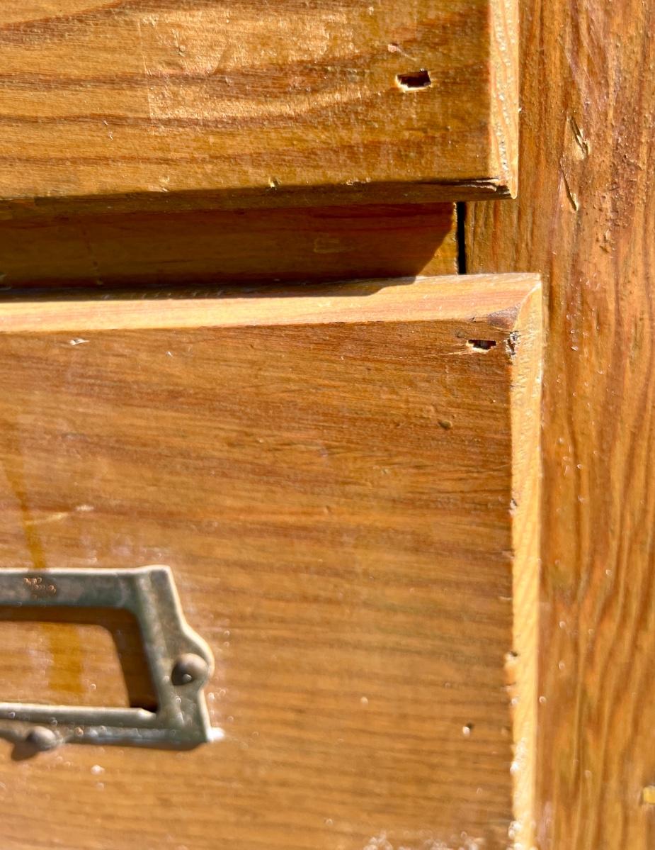 Manufacturer and date unknown, was used as a prop in a museum display after serving as a storage cabinet for museum artifacts. Drawers have all been nailed shut with a brad nailer. Top was replaced and used to display other museum items. Measures approx. 32" high x 24" deep x 70" long. Good condition.