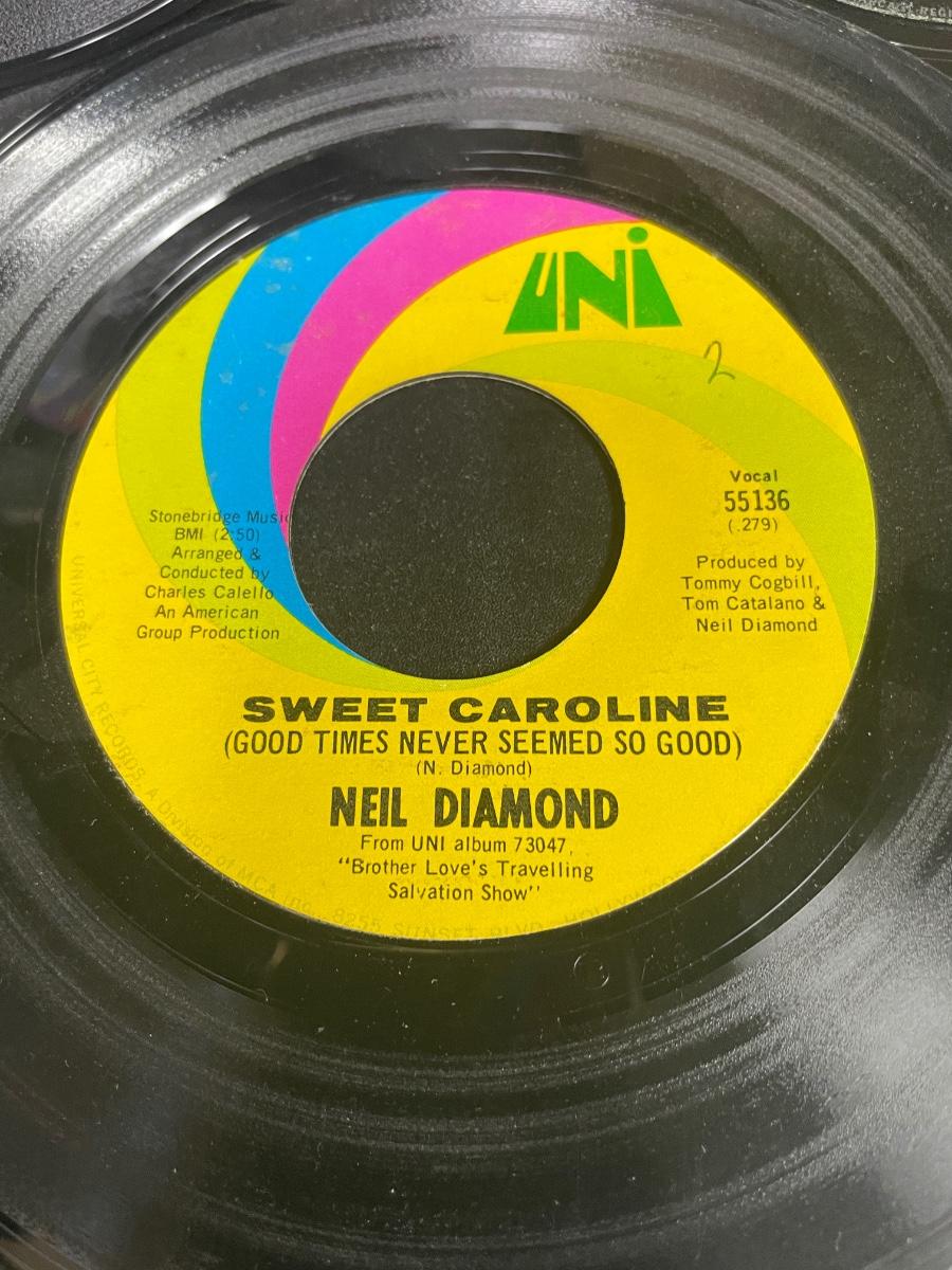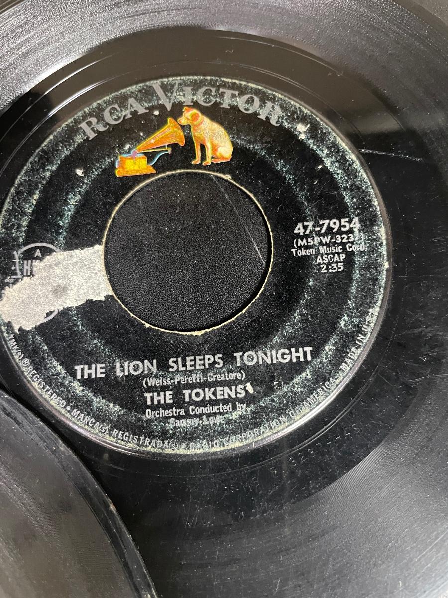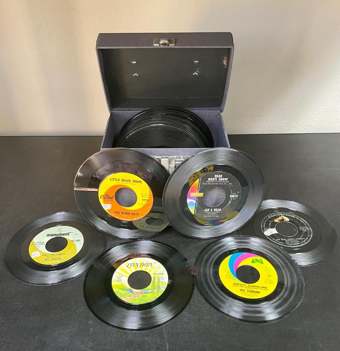 Lebo Denim Blue case is in good condition. Records are in good to fair condition. Examples of records includes: "Only the Lonely" by Roy Orbison on Monument Records, "Little Deuce Coupe" by The Beach Boys on Capitol Records, "(I Can't Get No) Satisfaction" by The Rolling Stones on London Records, "Dead Man's Curve" by Jan & Dean on Liberty Records, "Sweet Caroline" by Neil Diamond on UNI Records, and "The Lion Sleeps Tonight" by the Tokens on RCA Records.