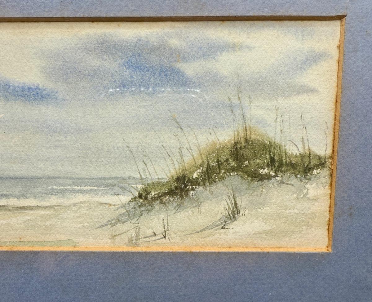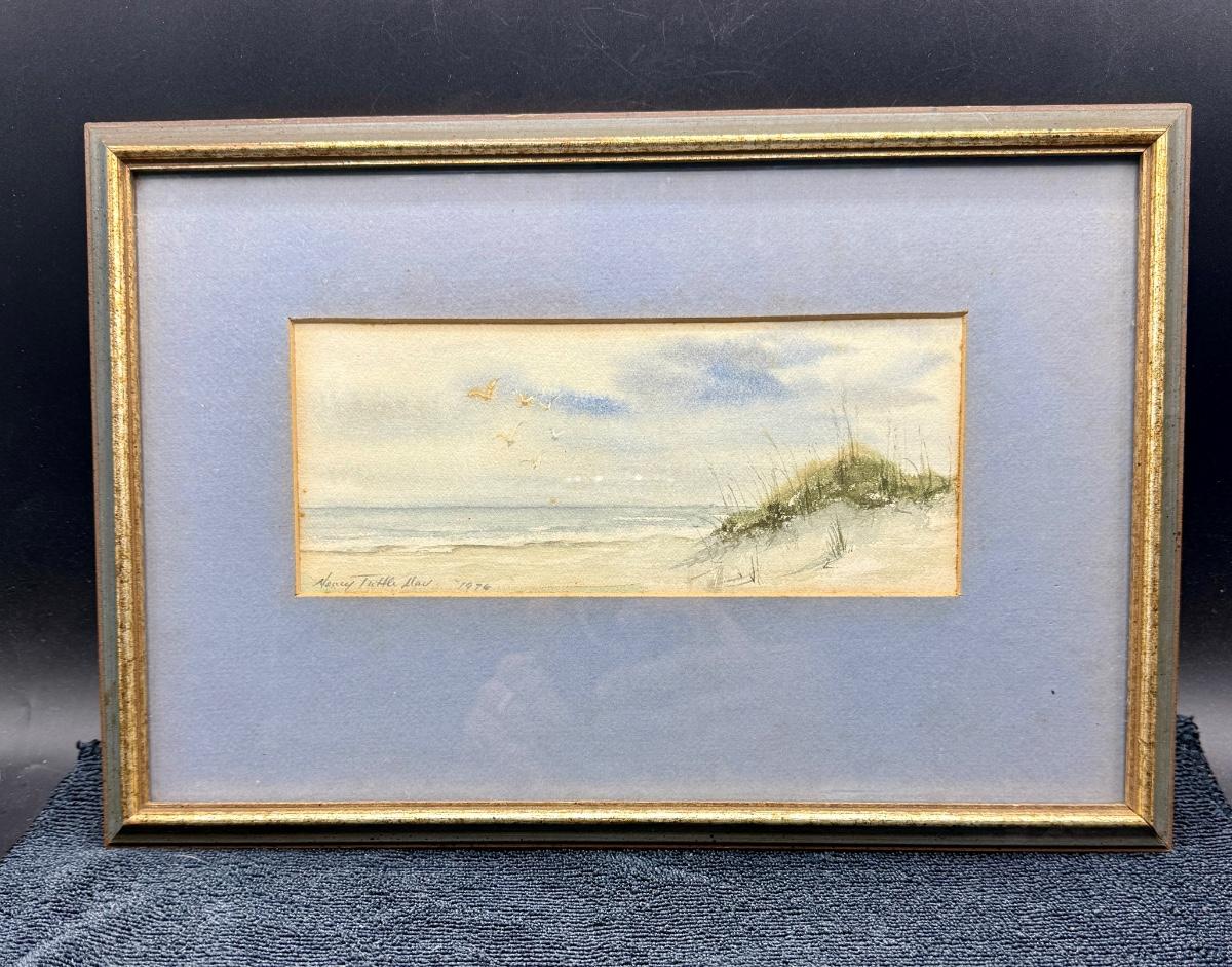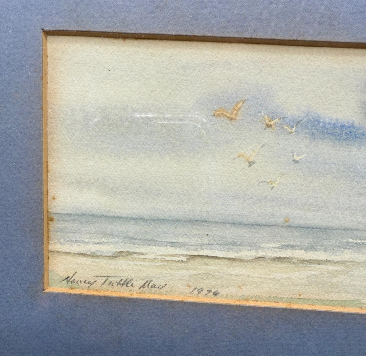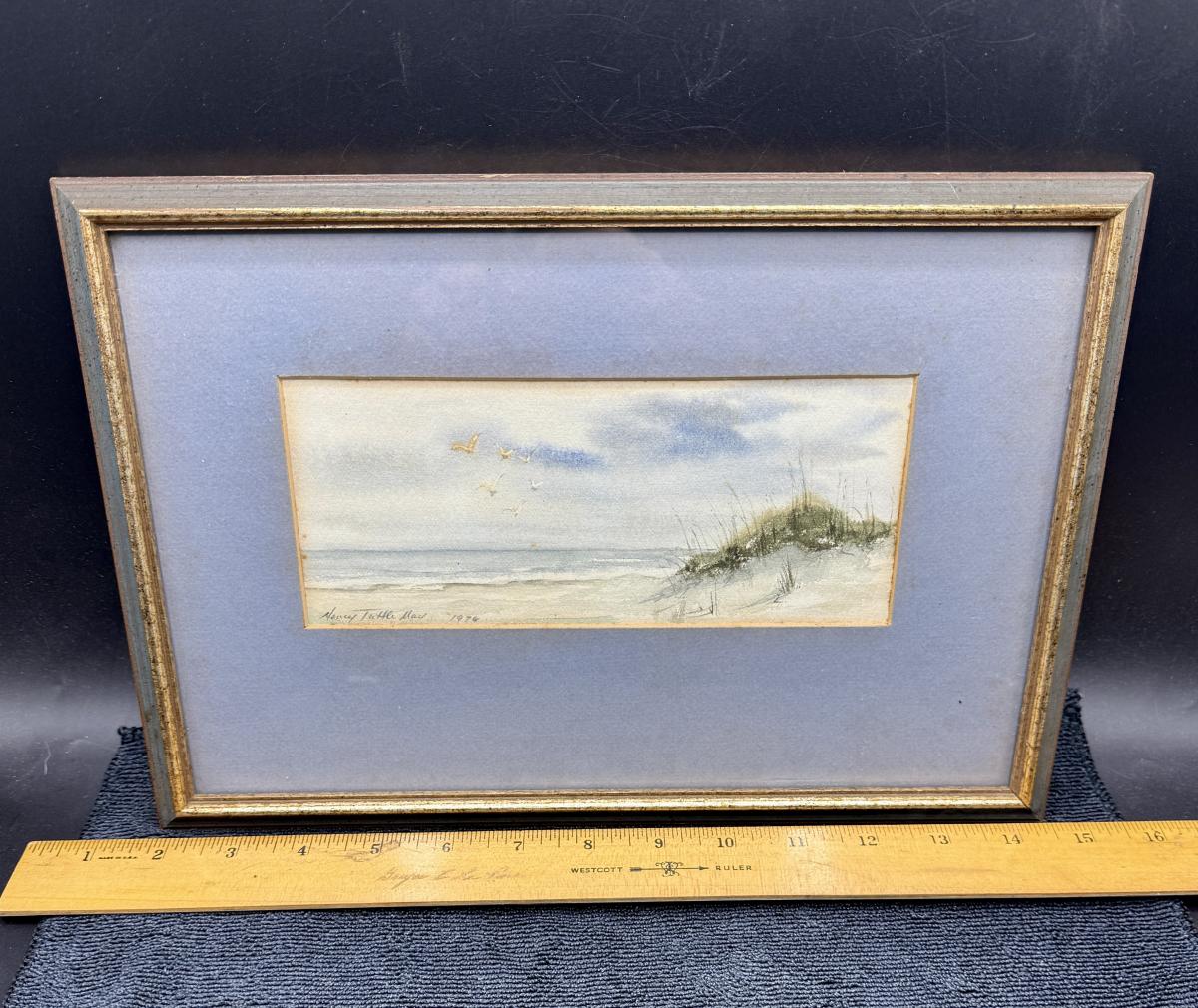 Stunning coastal beach scene done in watercolor by Nancy Tuttle May, signed on lower left. From 1974. Framed and matted,