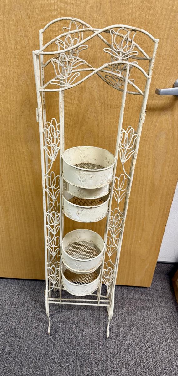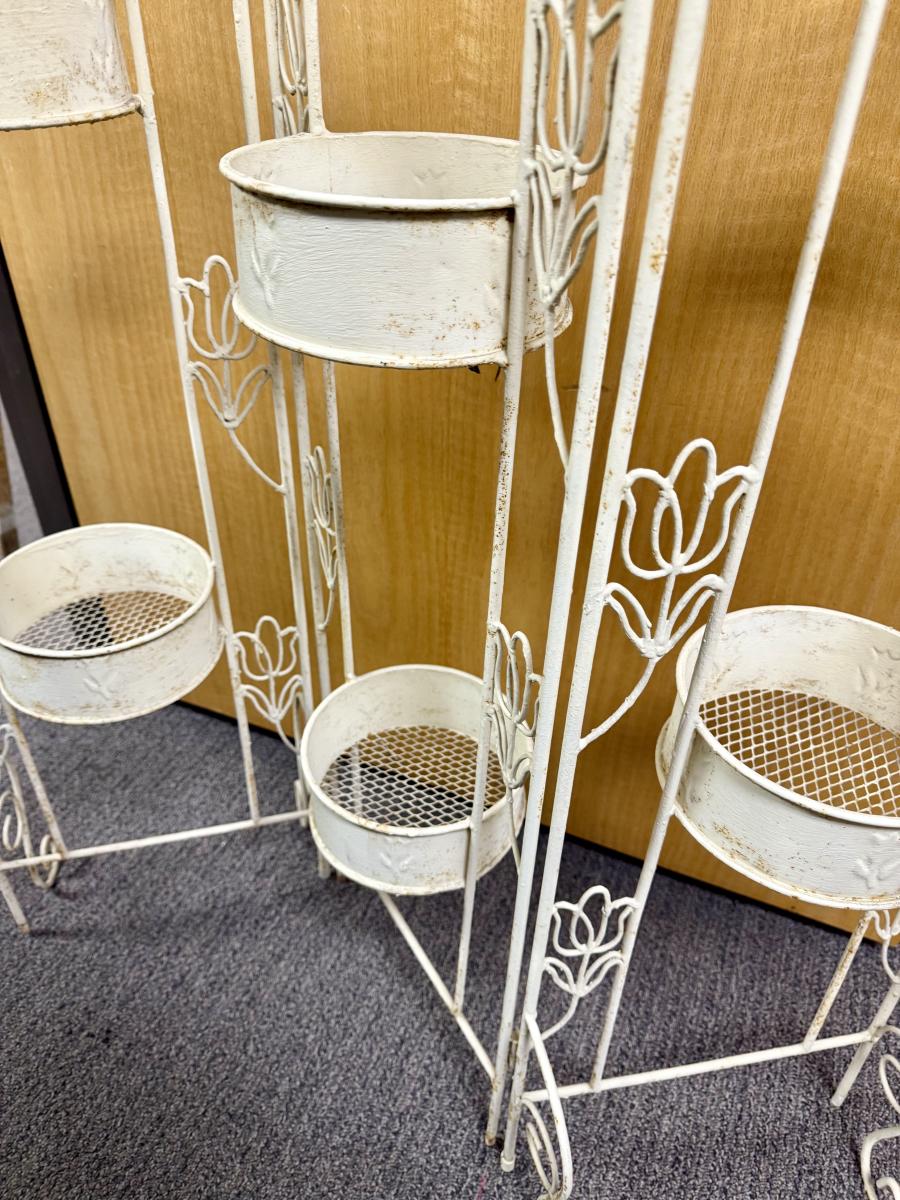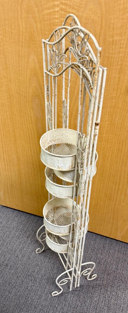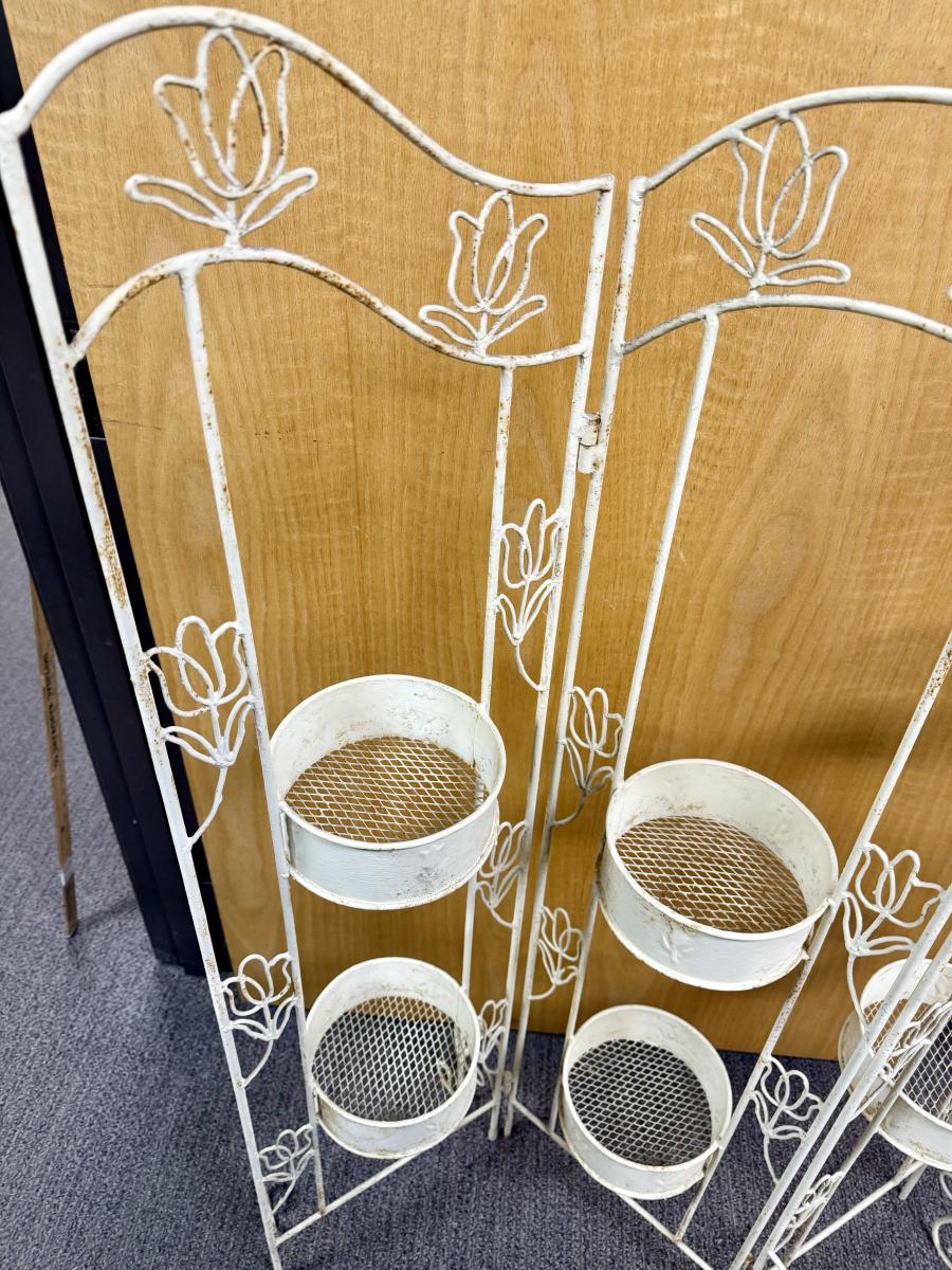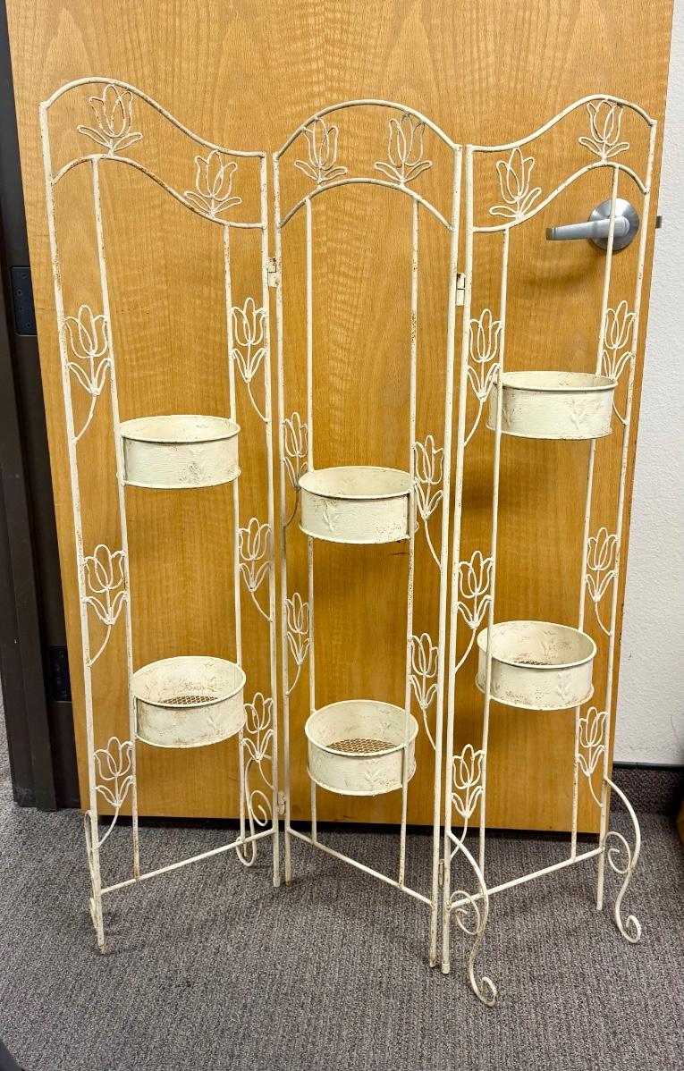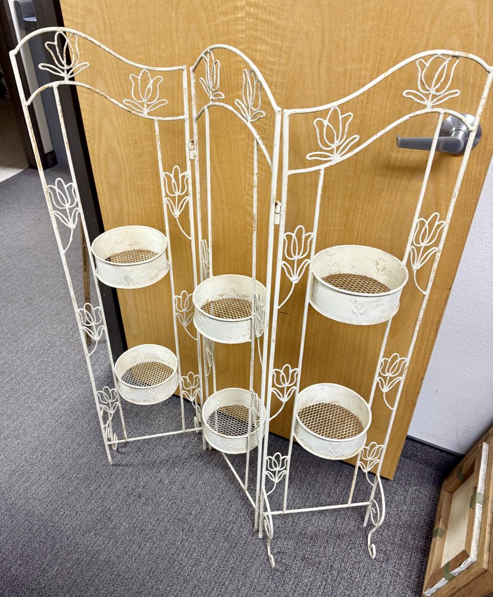 Opens in a zig-zag line and can hold 6 potted plants. Painted wrought iron. Approx. 47" tall and 36" wide when fully opened. Can fold into a small size for storage.