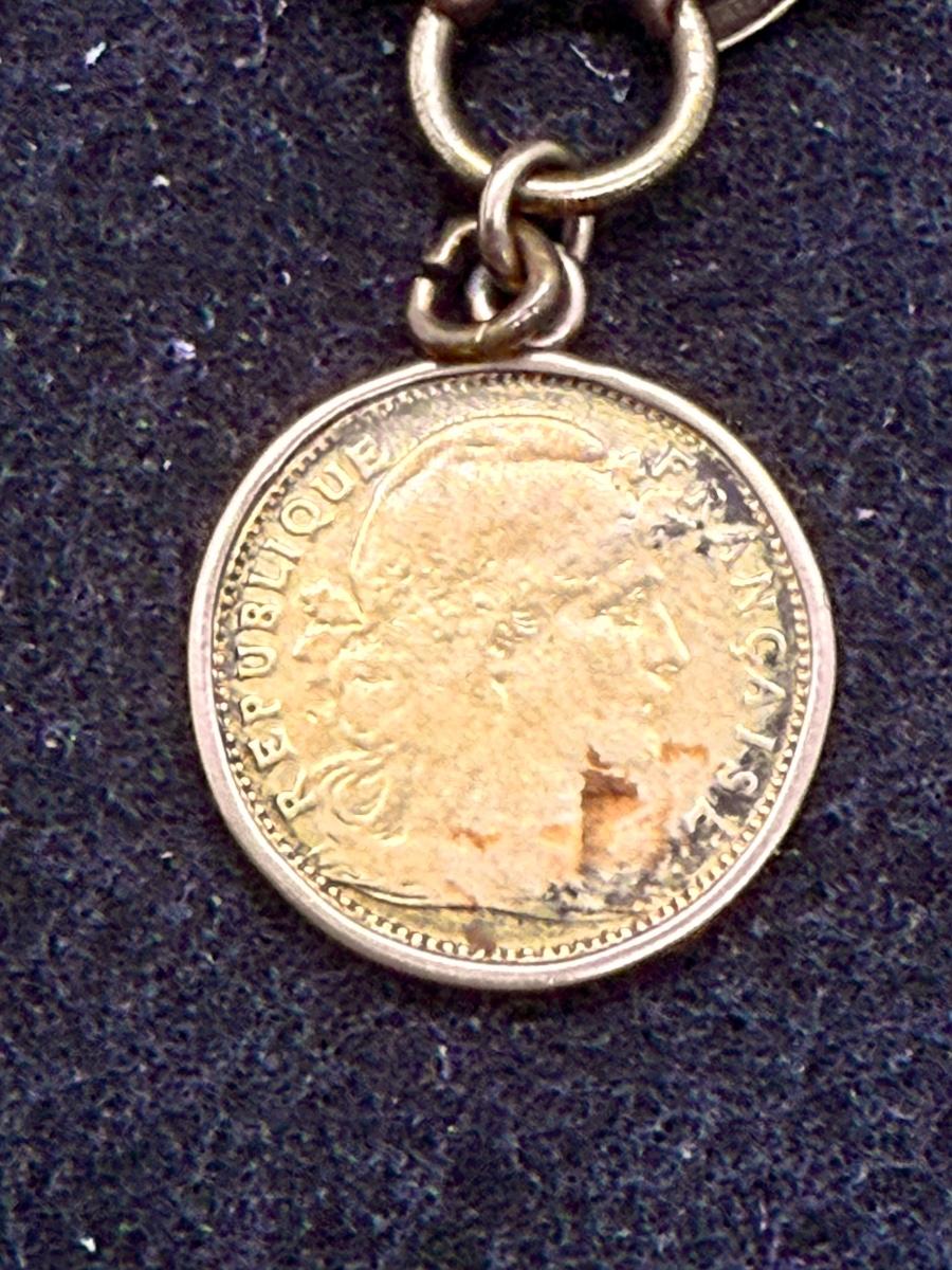 This French coin was minted at The Paris Mint. The obverse, designed by J. C. Chaplain depicts the national symbol Marianne and the reverse depicts a rendition of “le coq gaulois” (Rooster), the unofficial symbol of France. 3.2 grams Gross Weight. 900.0 fine Gold. Coin is surrounded by a gold ring perhaps to be worn on a necklace as a pendant, but is now attached to a 9C Gold bracelet. See photos for details.
