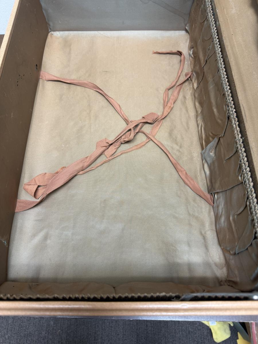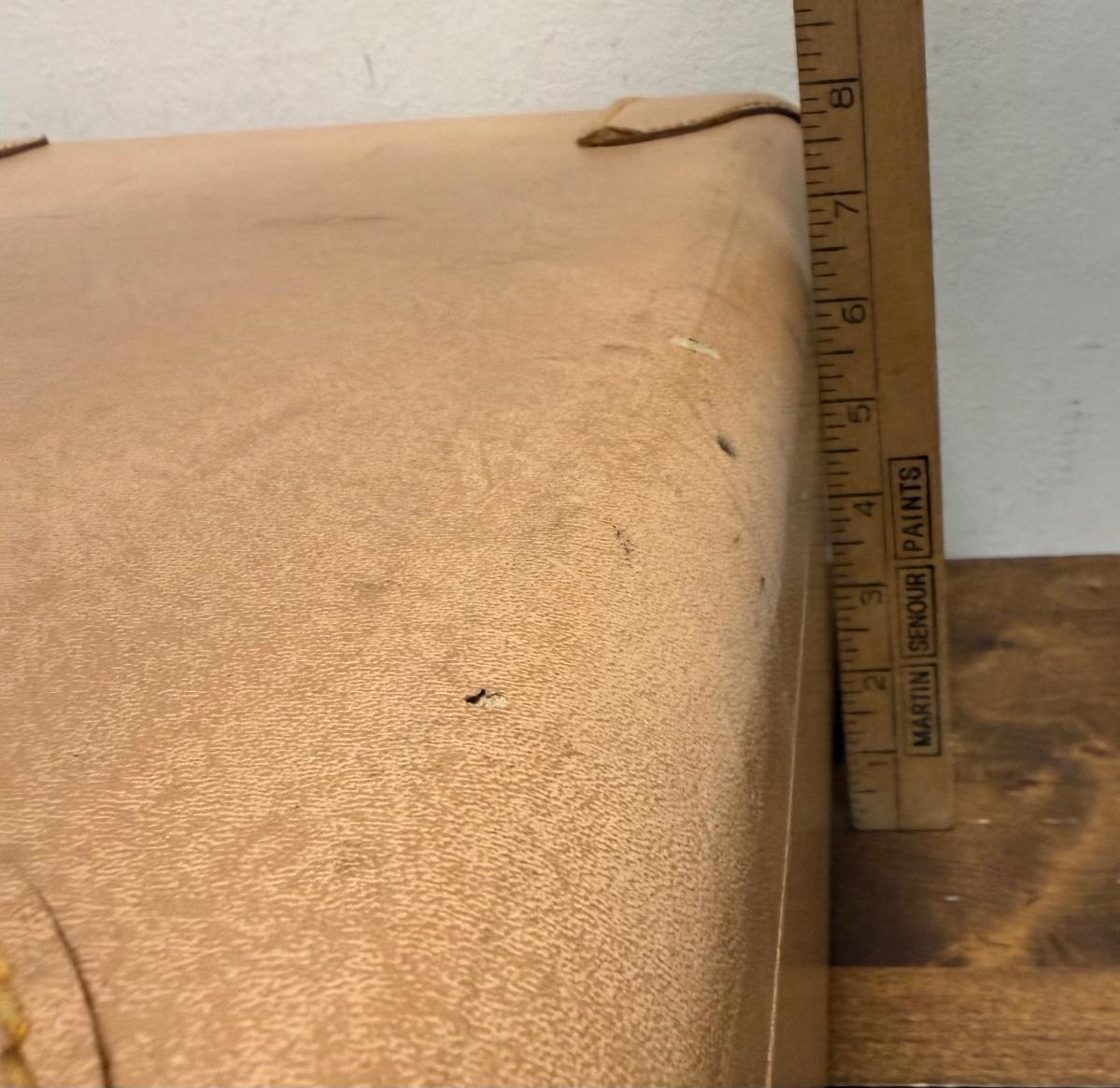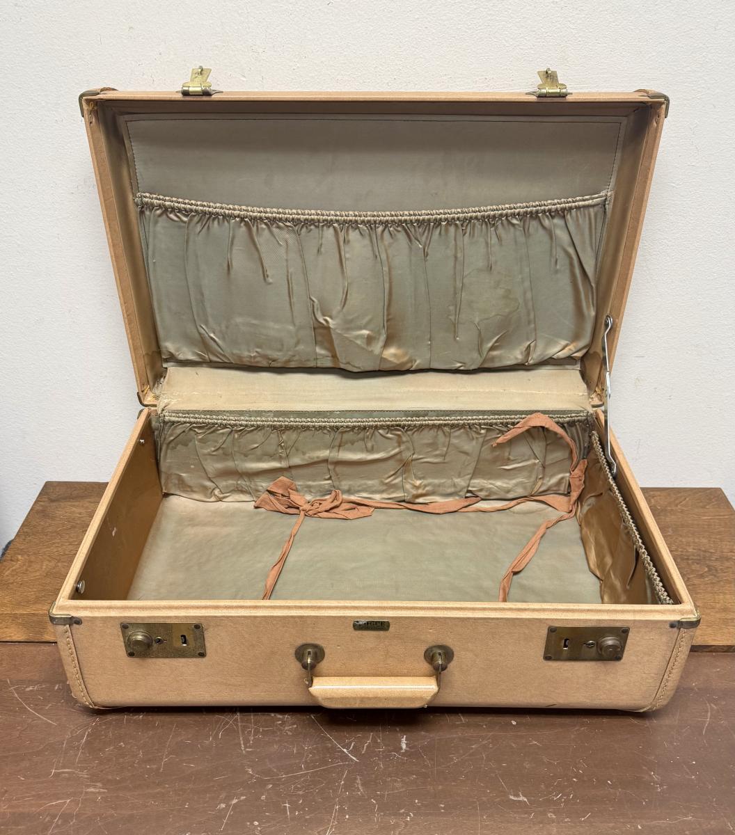 Some wear marks on the outside and a liquid stain on the inside, handle is in great shape and latches work as expected. No Keys. Size is approx. 21" x 14" x 8".