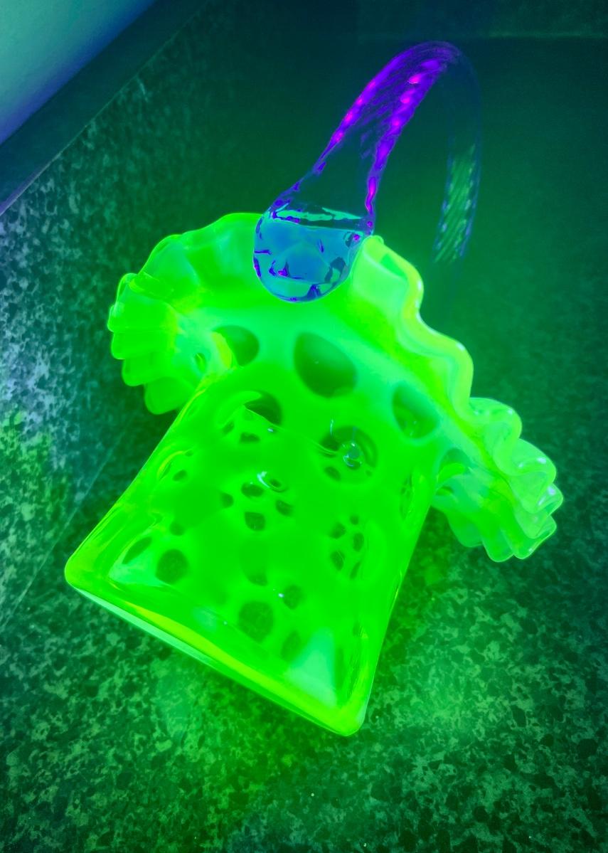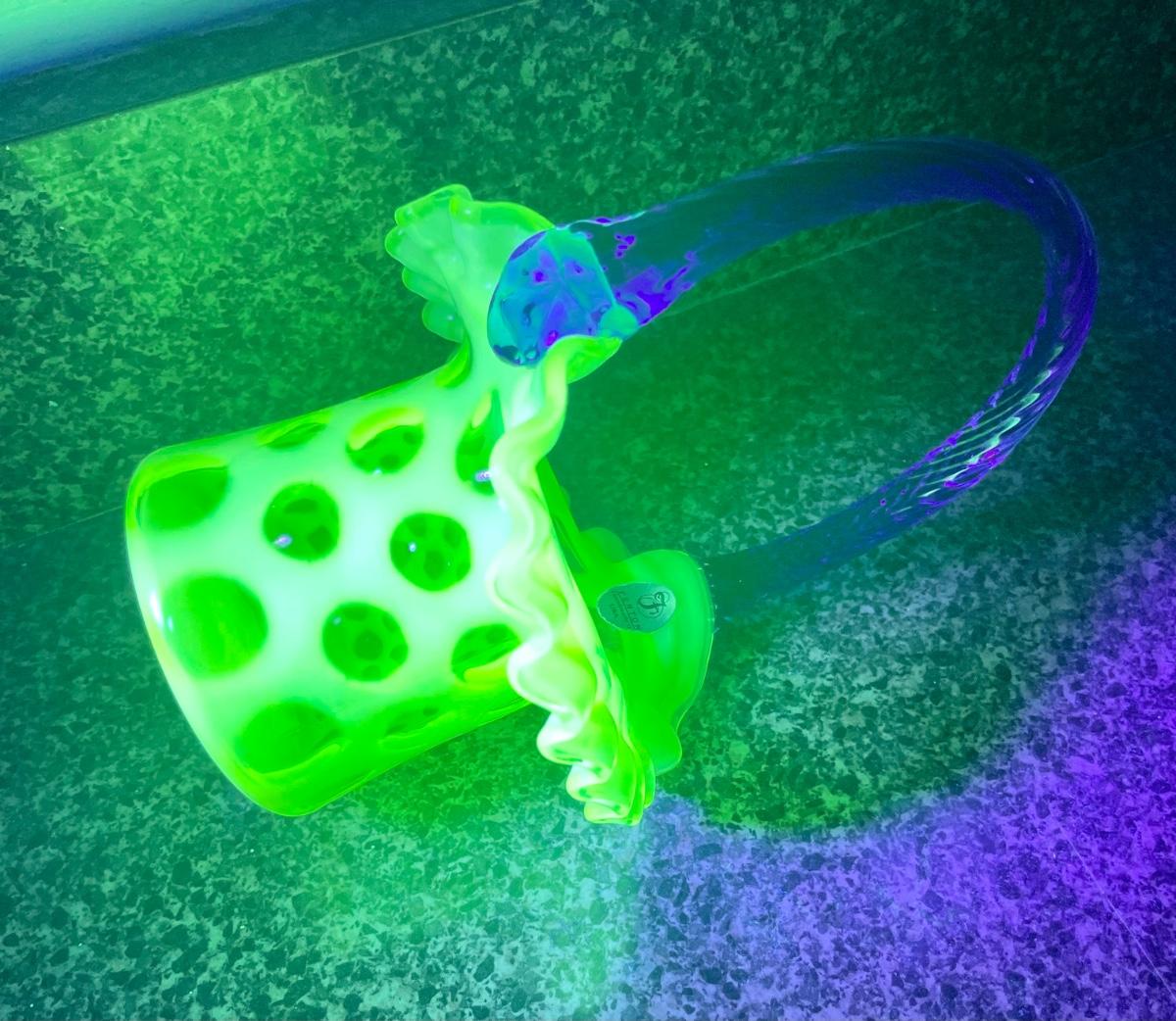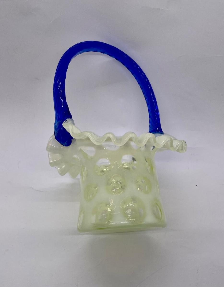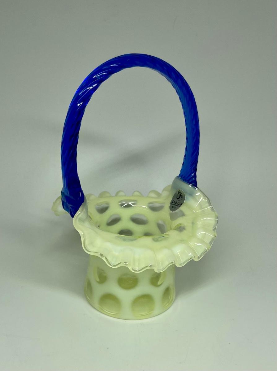 Fenton Topaz Opalescent Cobalt Blue Handle Coin Dot Hat Basket glows