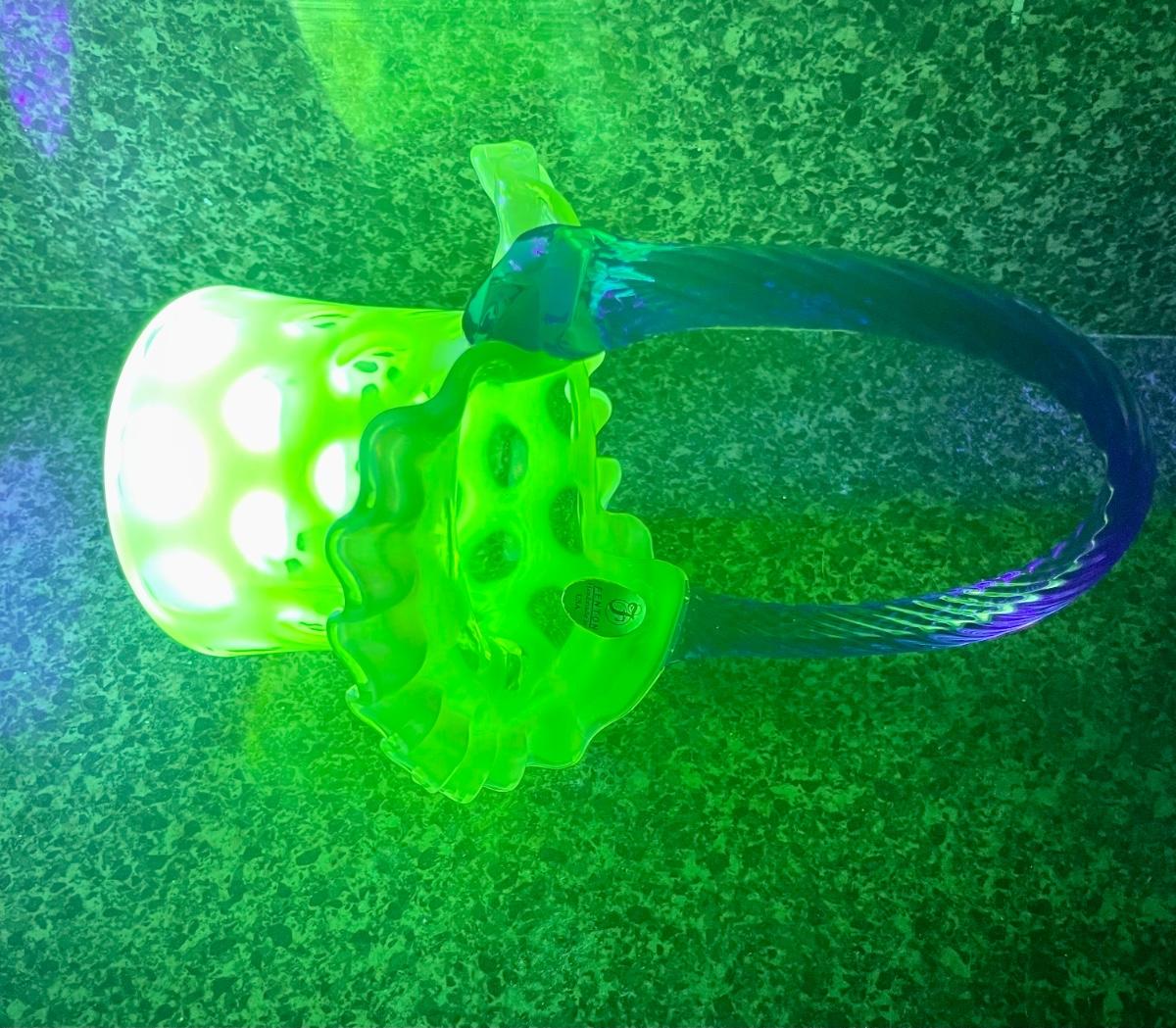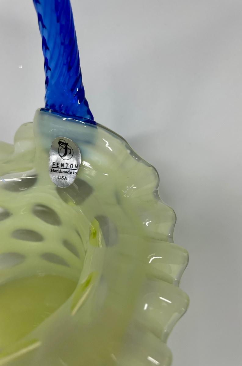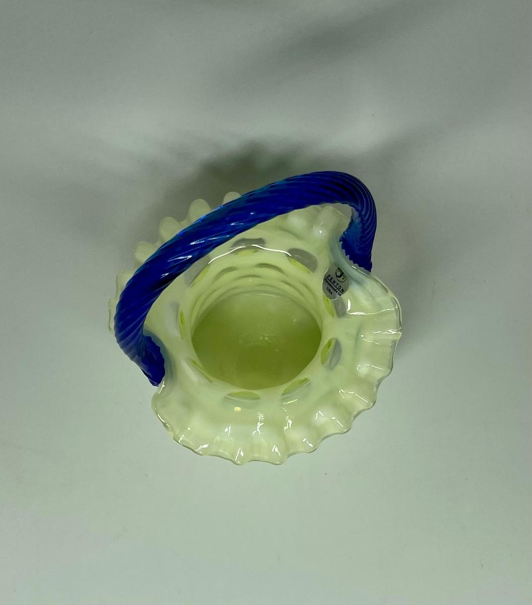 Fenton Topaz Opalescent Cobalt Blue Handle coin dot hat basket glows. Perfect condition, no chips or cracks, see details in photos. Has original manufacturer's sticker.
