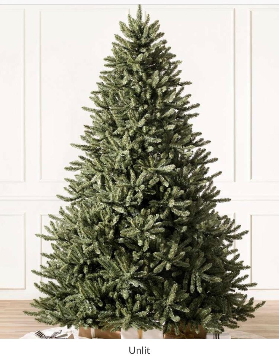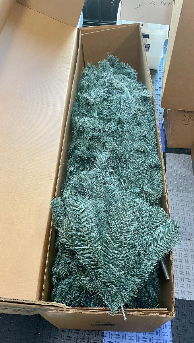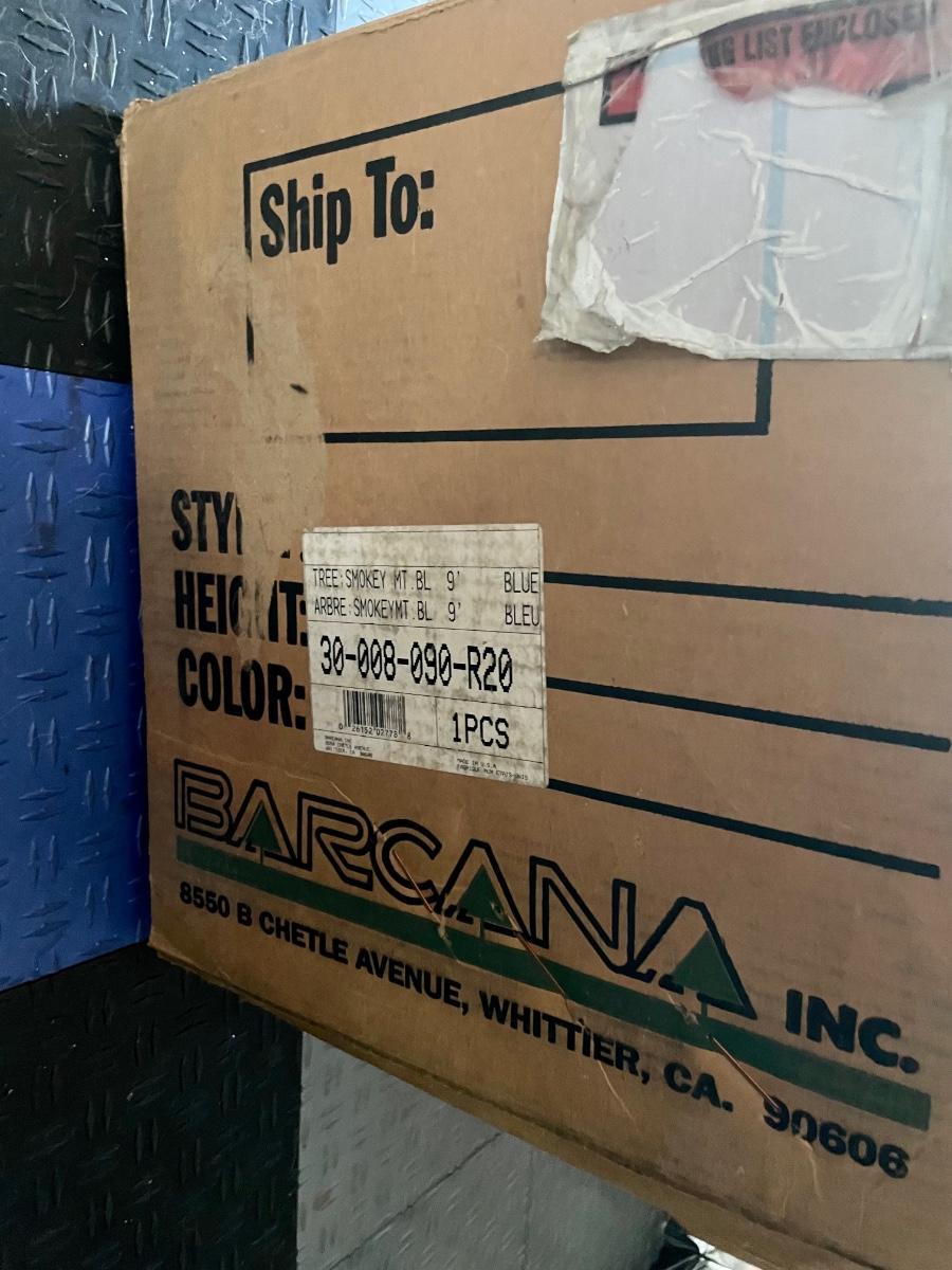 Barcana 9' Artificial Unlit Christmas Tree. Appears to be unused, stored inside original box. Has metal stand and instructions.