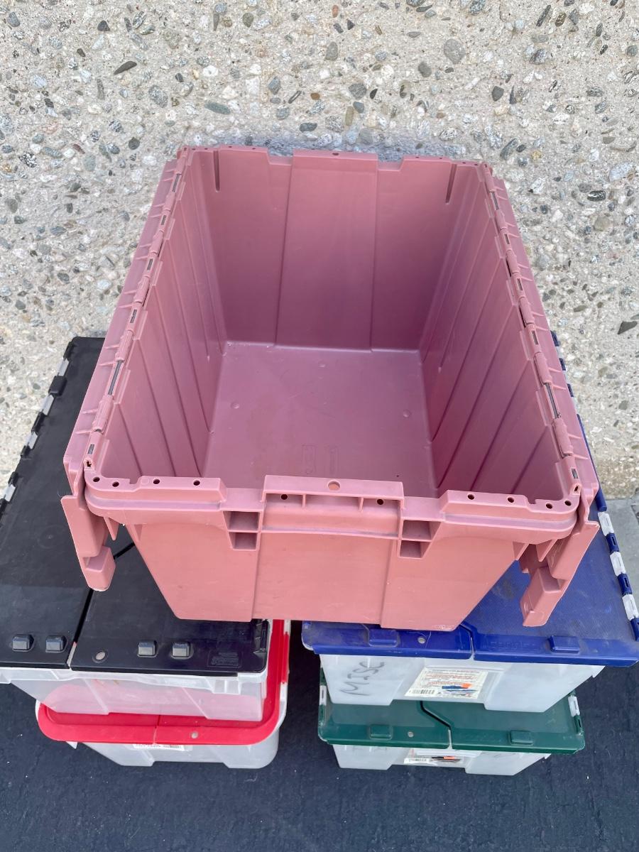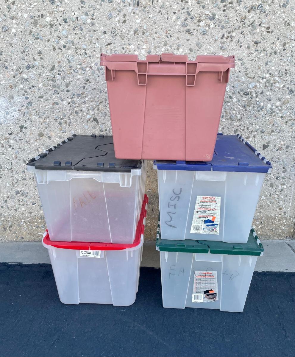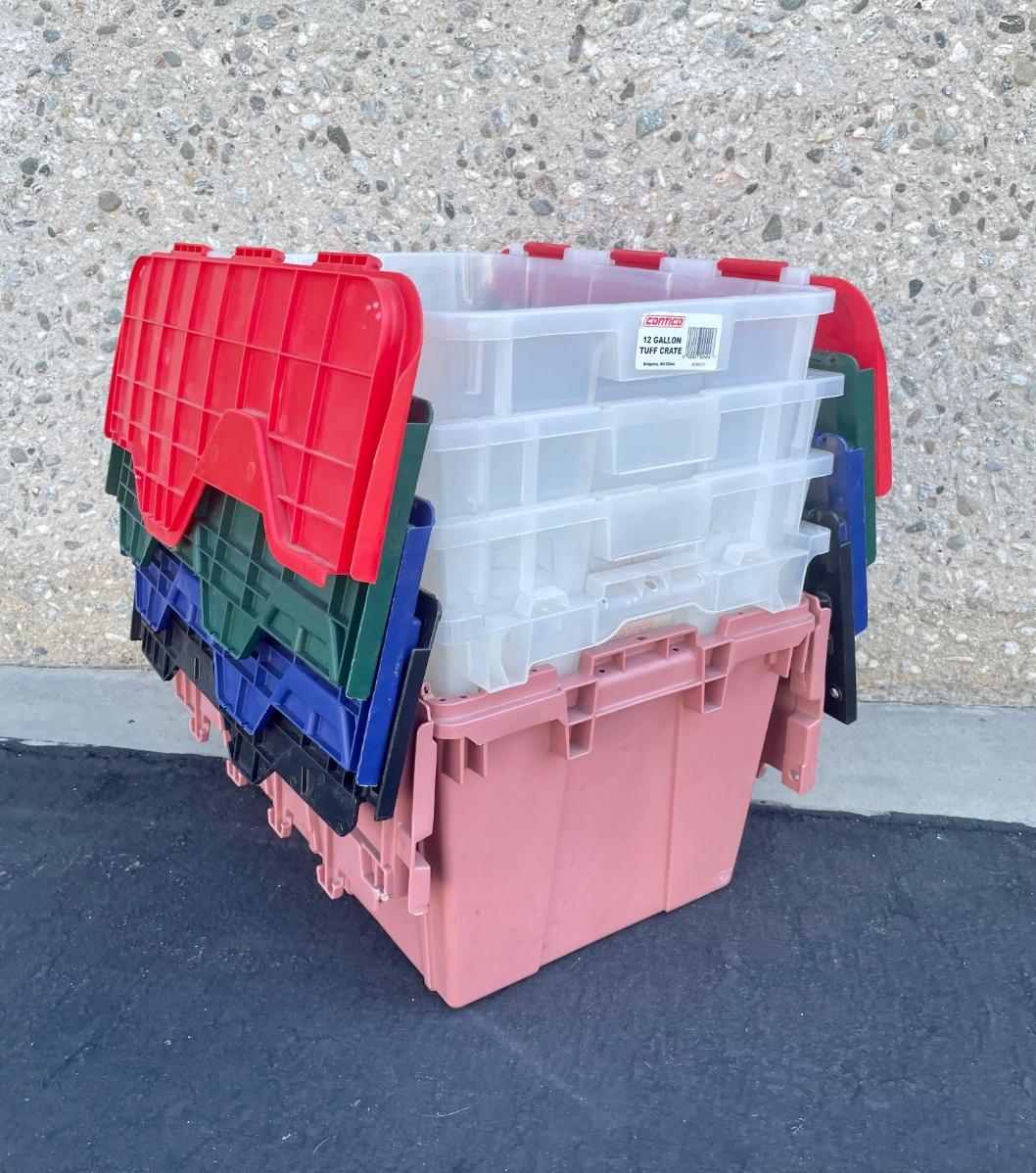 Stackable 12-gallon size bins. Different makers, all used but in good condition. Can be stacked in a nested manner for storage when empty, lids are strong enough to allow stacking on top of each other when full.