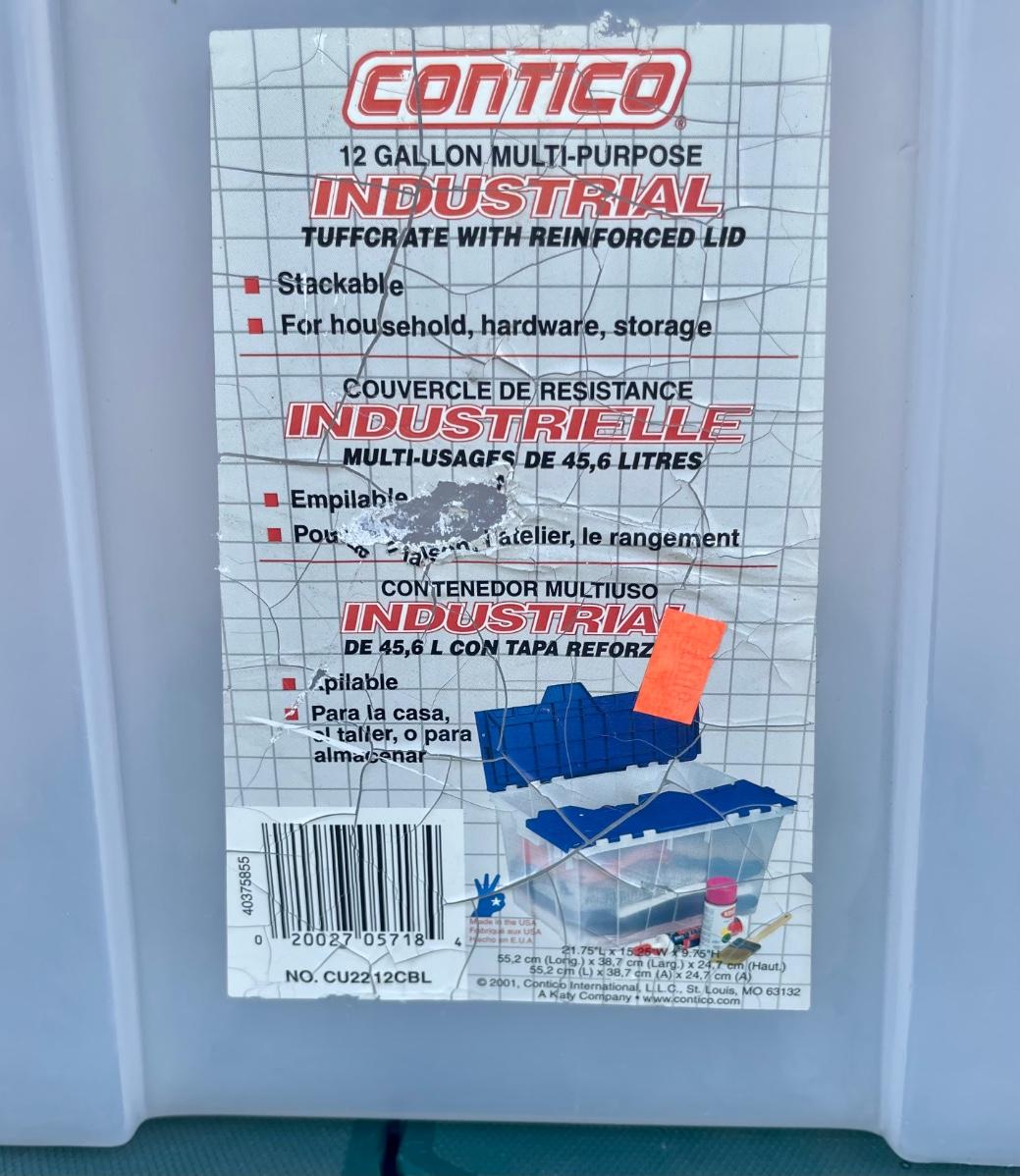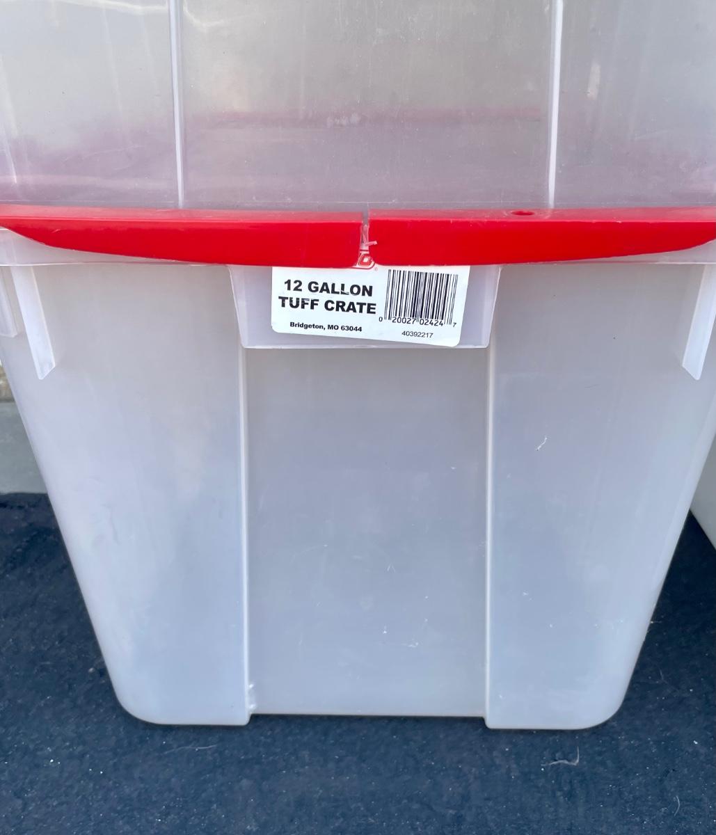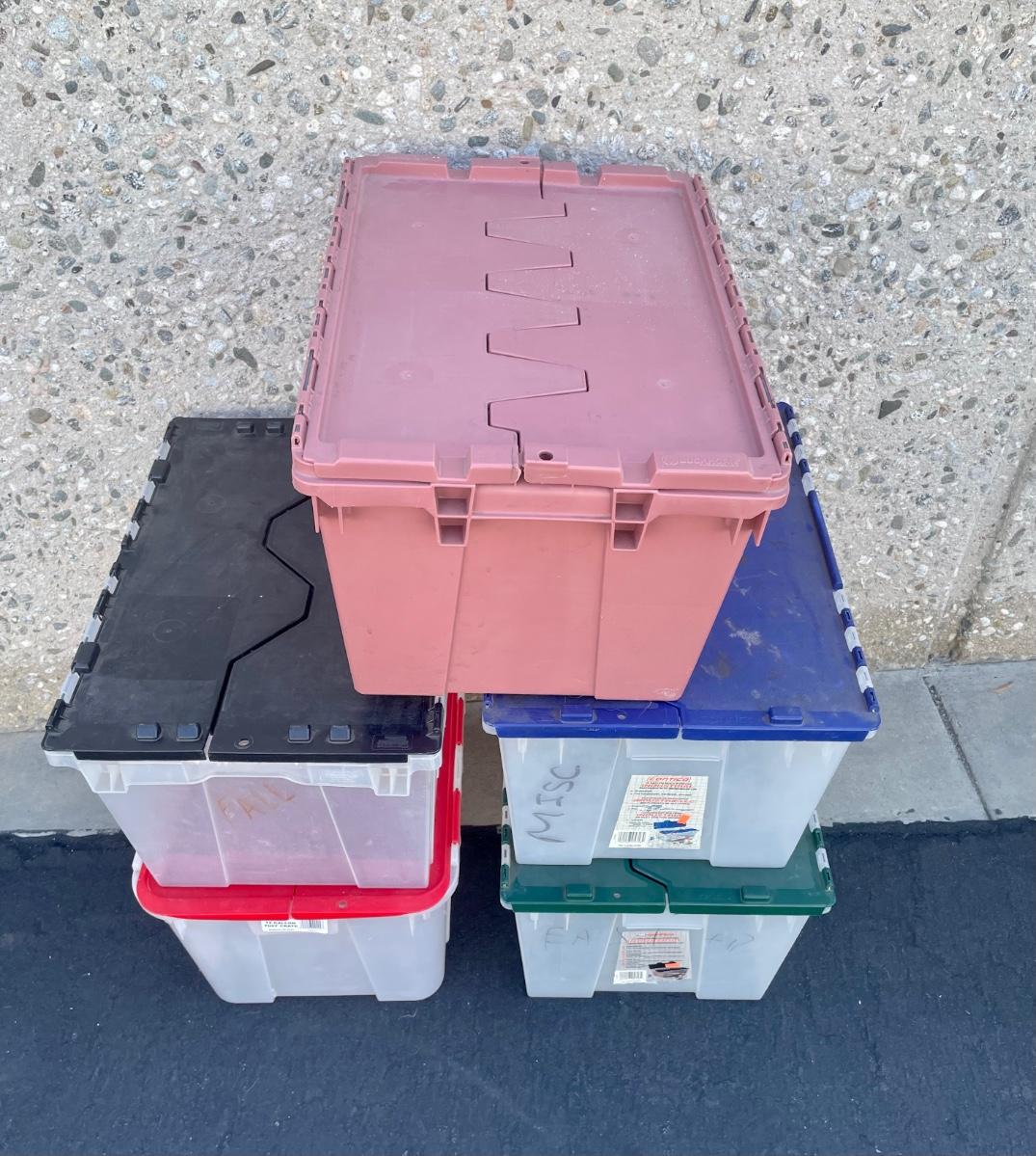 Stackable 12-gallon size bins. Different makers, all used but in good condition. Can be stacked in a nested manner for storage when empty, lids are strong enough to allow stacking on top of each other when full.