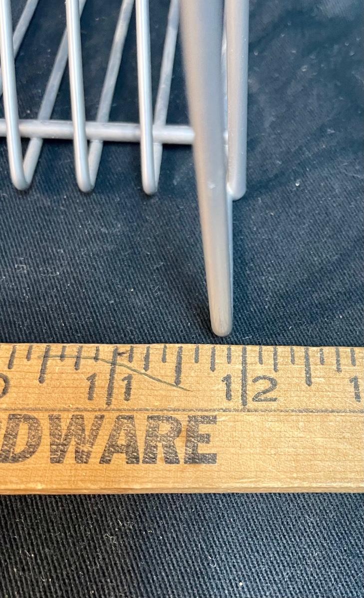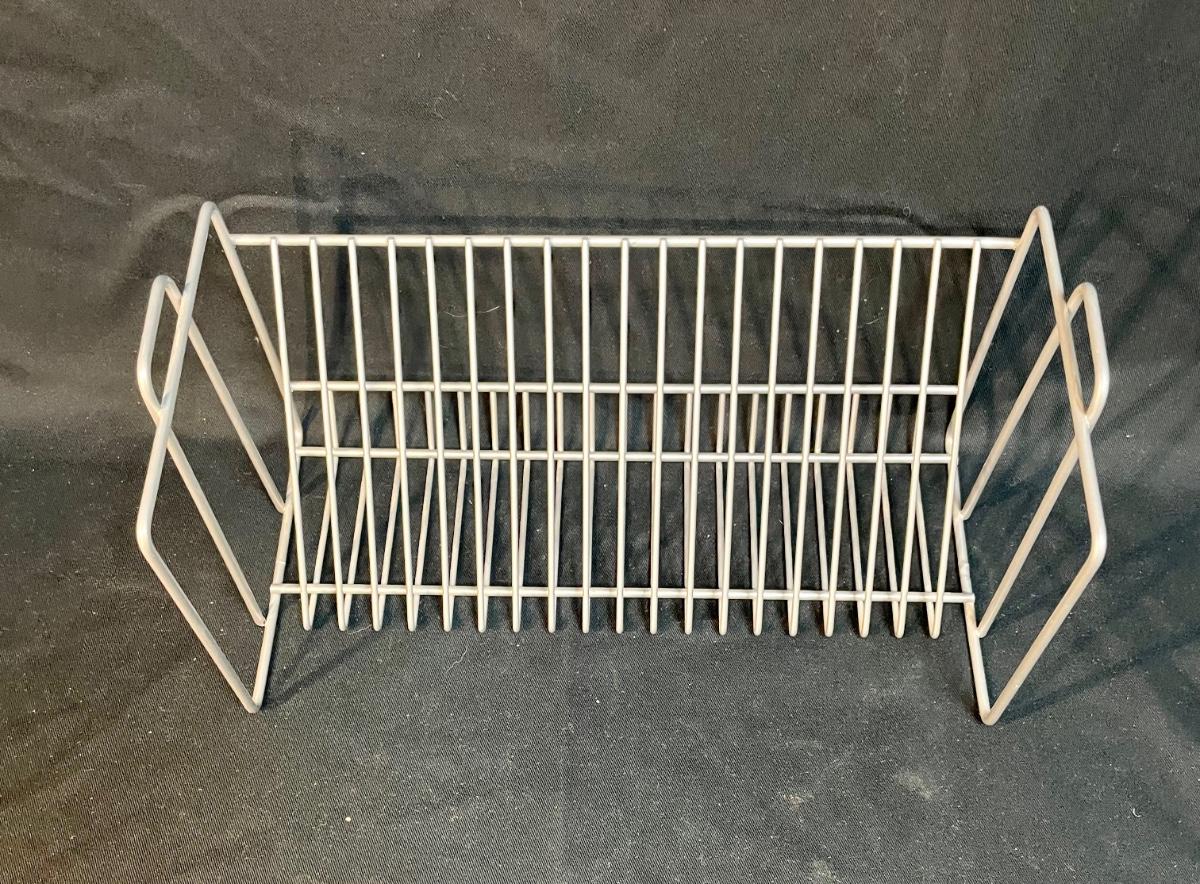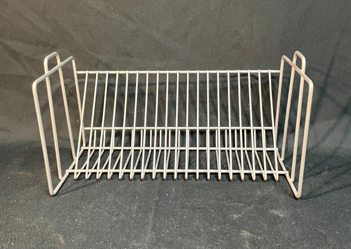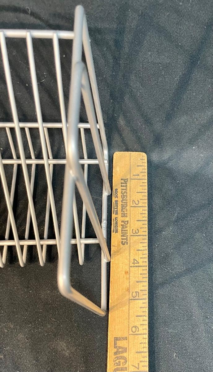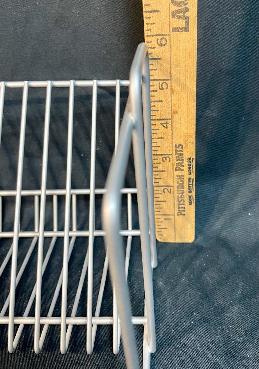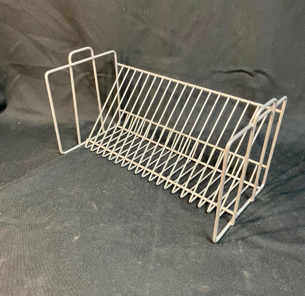 Wire CD rack, fits on shelf or can sit on tabletop.. Holds 20 CDs. Approx. 12" across.