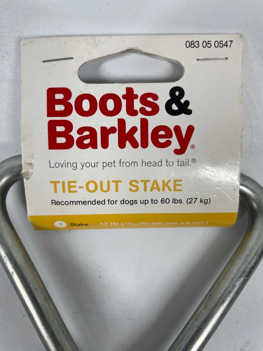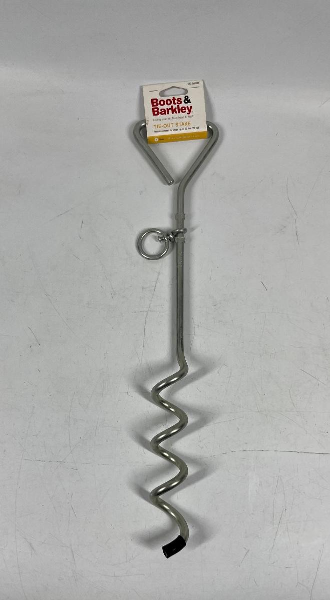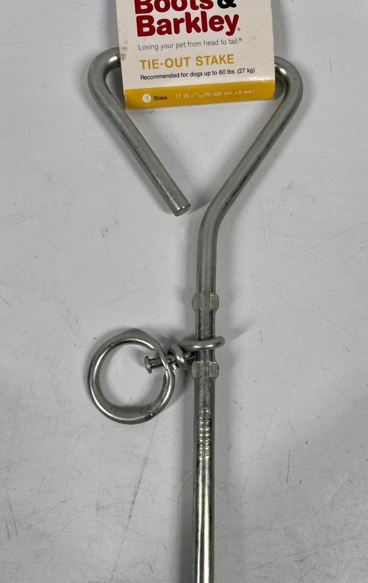 New, by Boots & Barkley. Chrome-plated, screws into ground, new in package. For dogs up to 60 pounds.