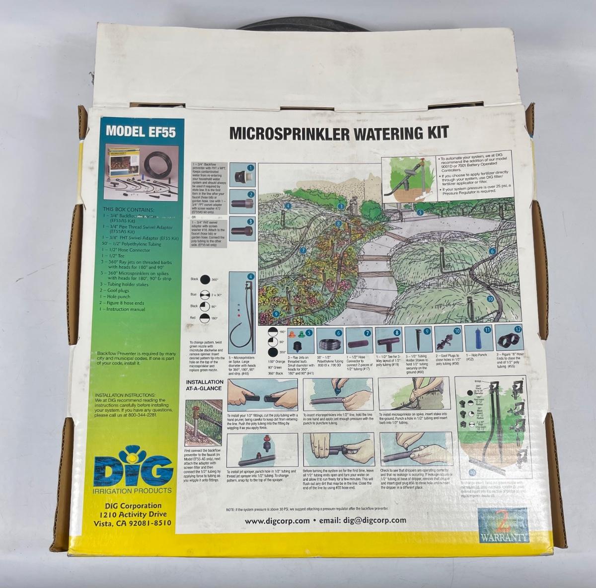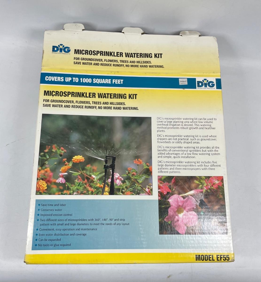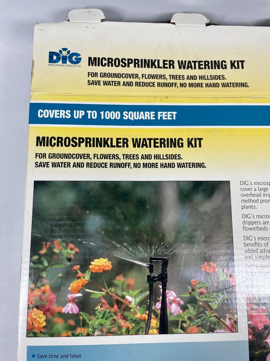 DIG Microsprinkler Watering Kit. New and unused, includes an extra spool of 100' of drip tubing. See photos for what's included.