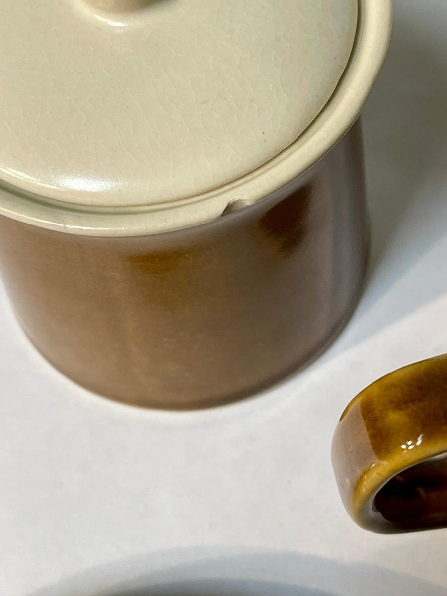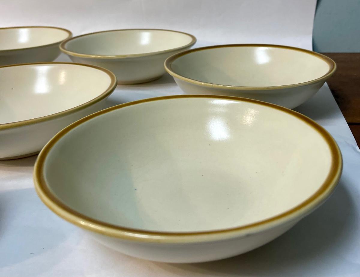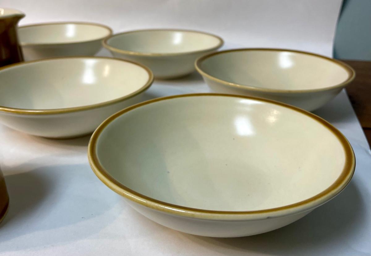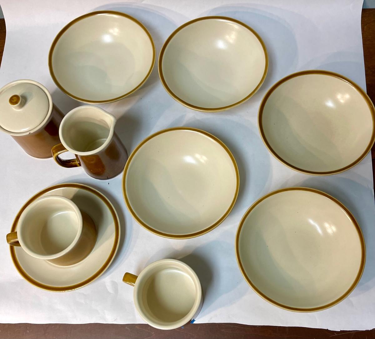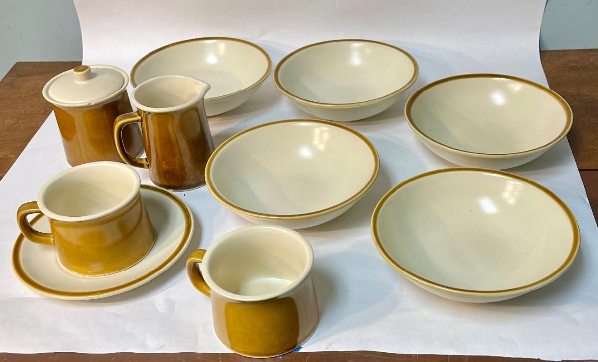 56 bowls, sugar and creamer, 2 cups, and 1 saucer in good condition, except for chip on sugar edge (see photos)