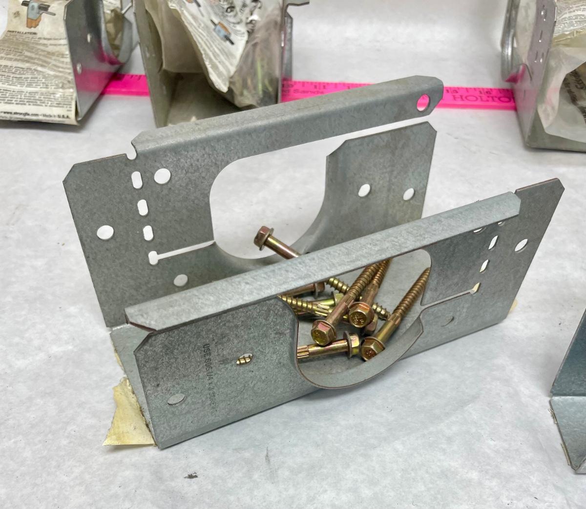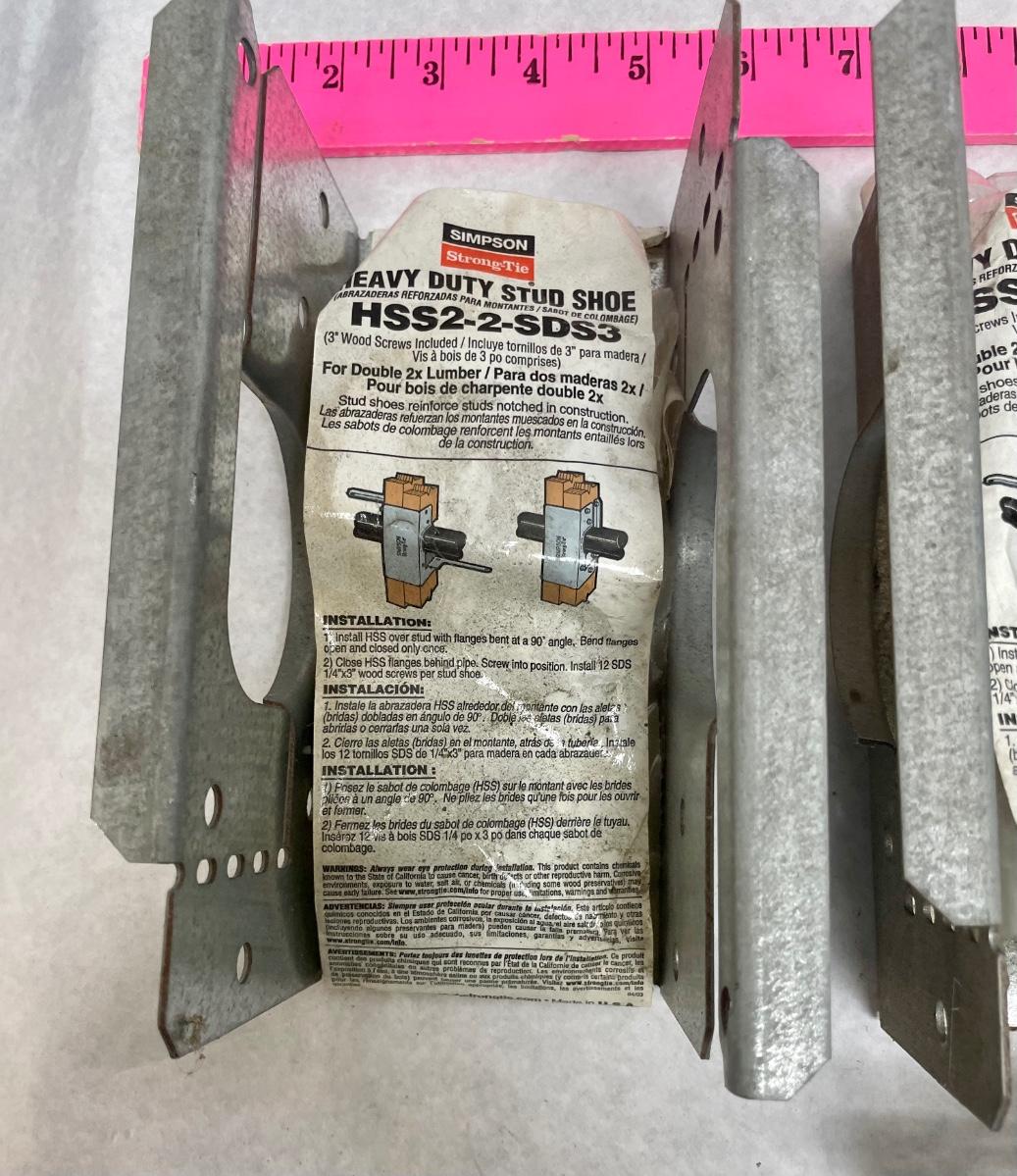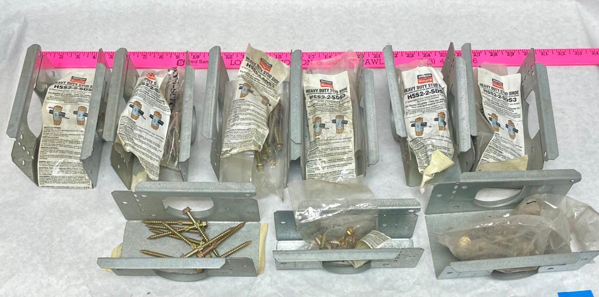 Lot includes 8 new stud shoes and fasteners for use on 2 studs, and 1 stud shoe for use on a single stud. Made from Galvanized steel.