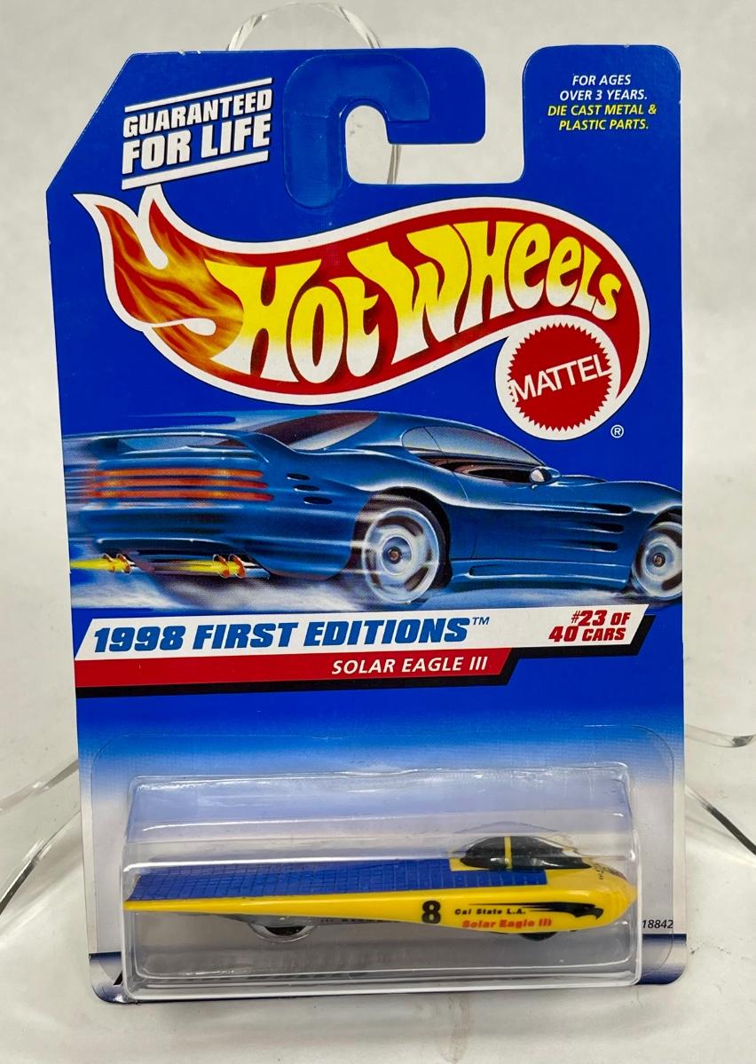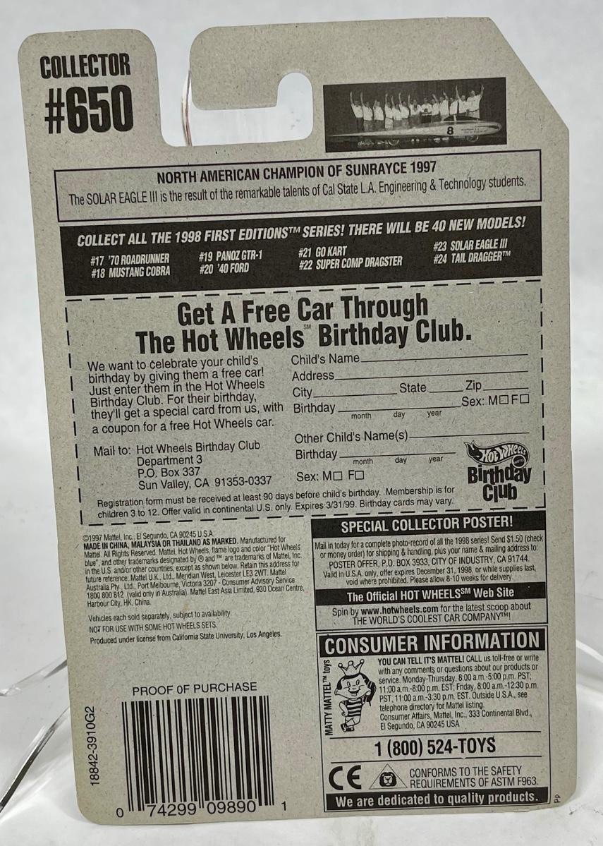 On original hand card package. 1998 First Editions Collector Car. #23 of 40 cars. Solar Eagle III. Collector #650.
