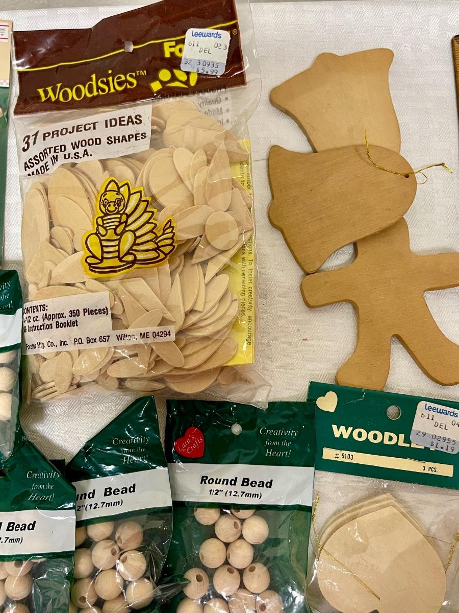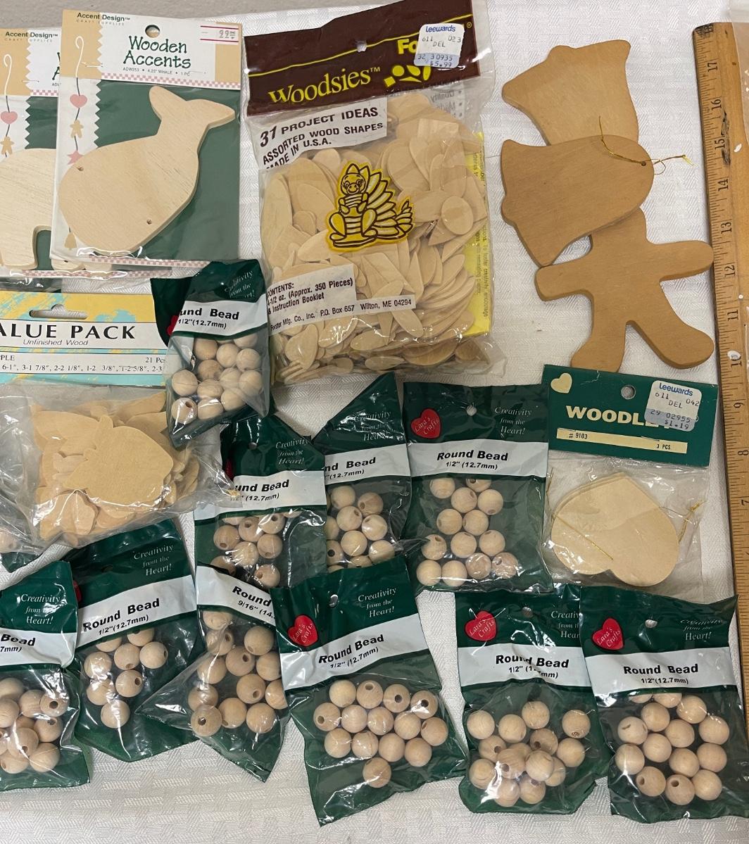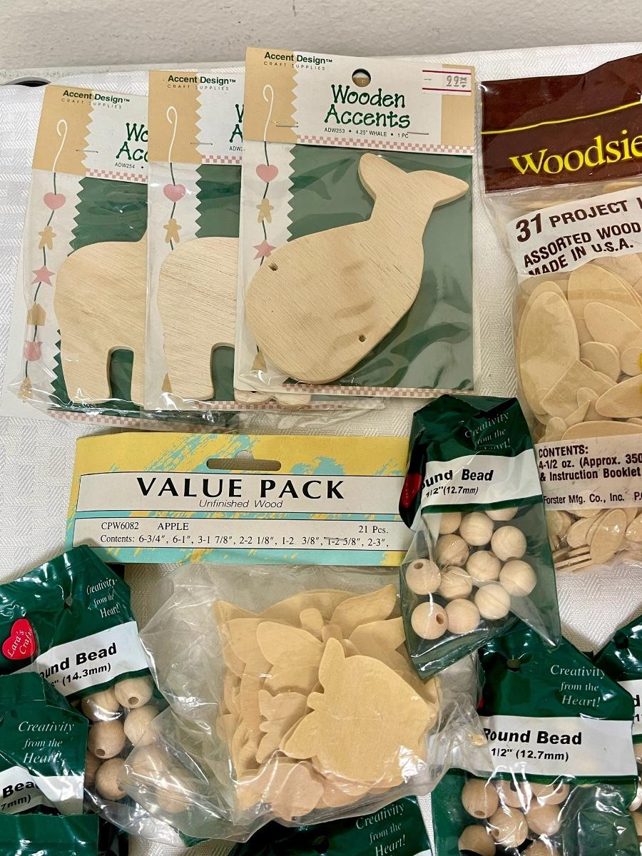 New packages of wood beads, hearts, bells, whales, and other shapes.