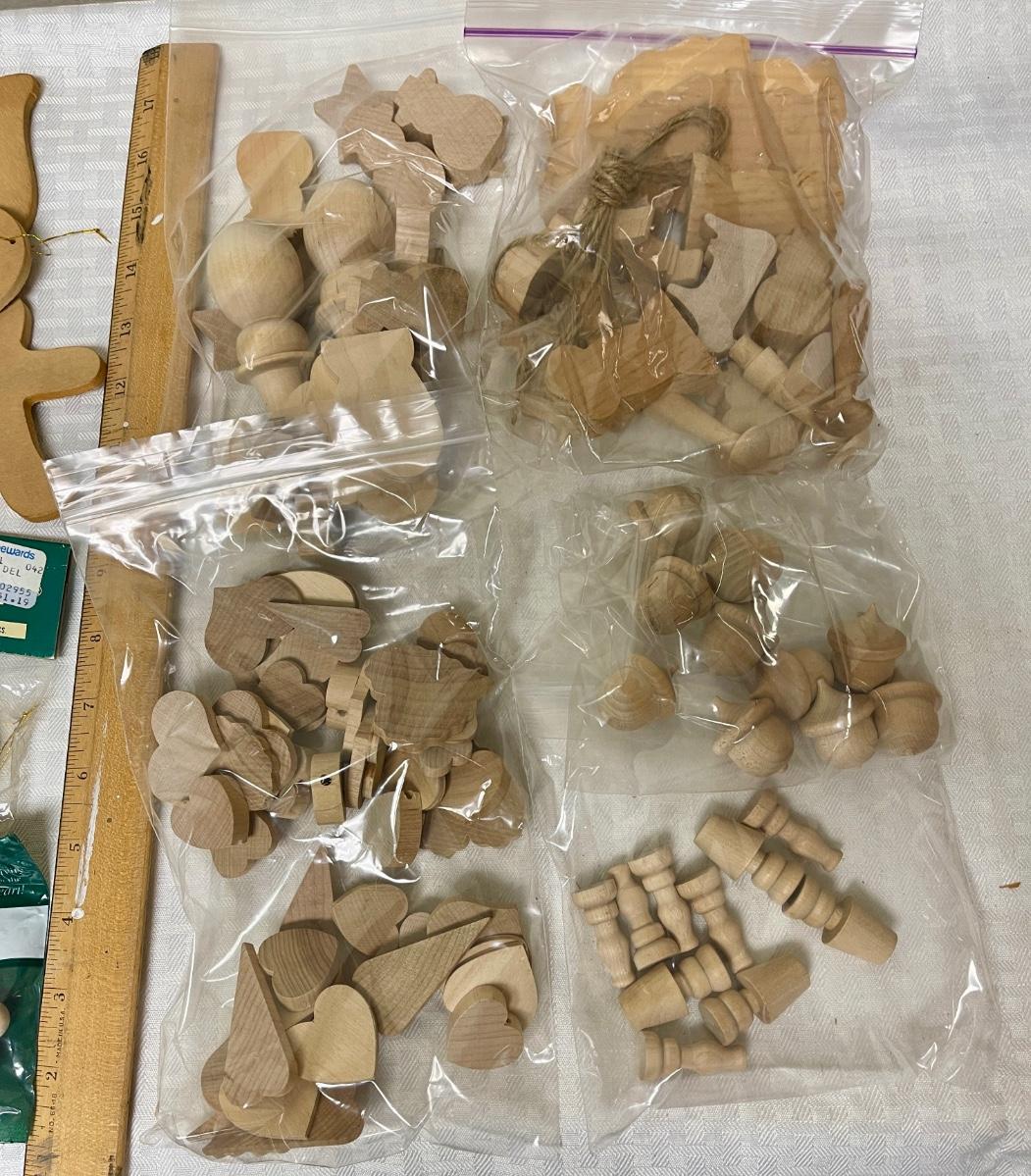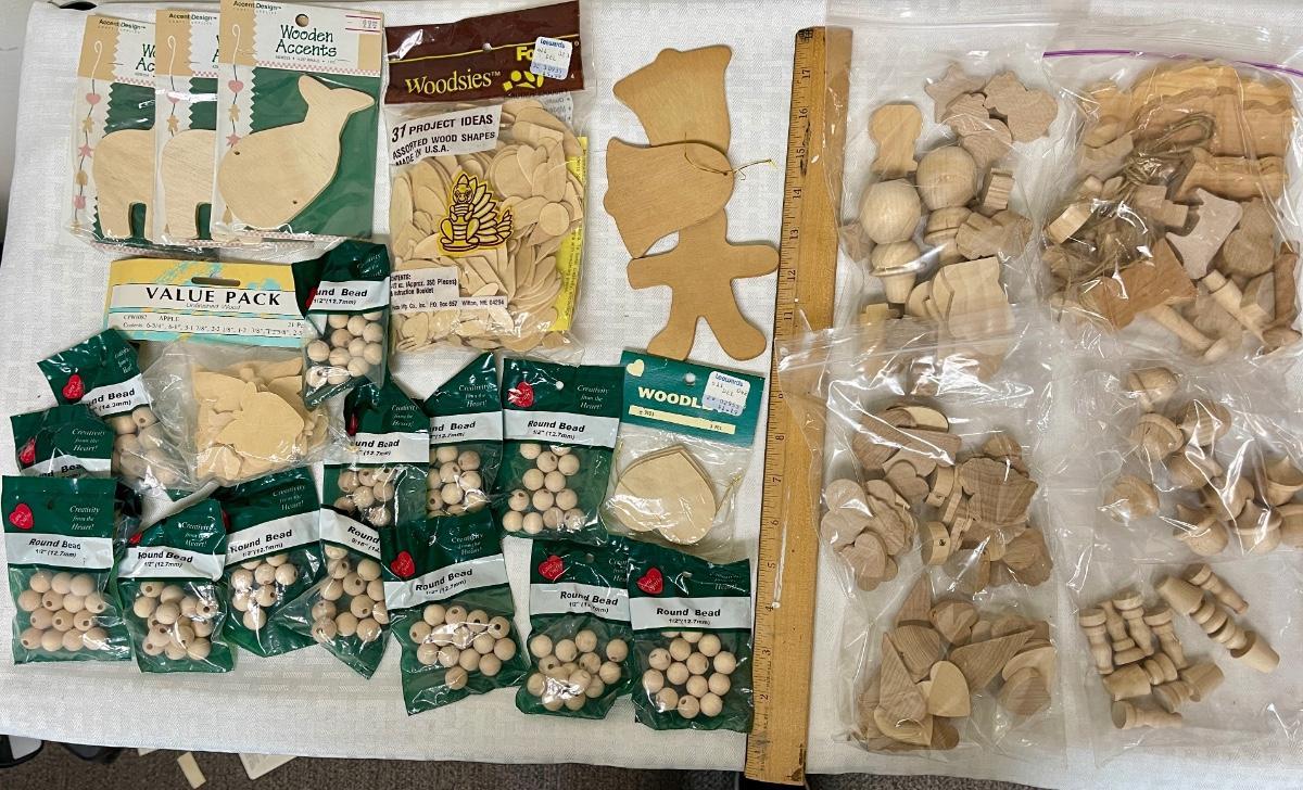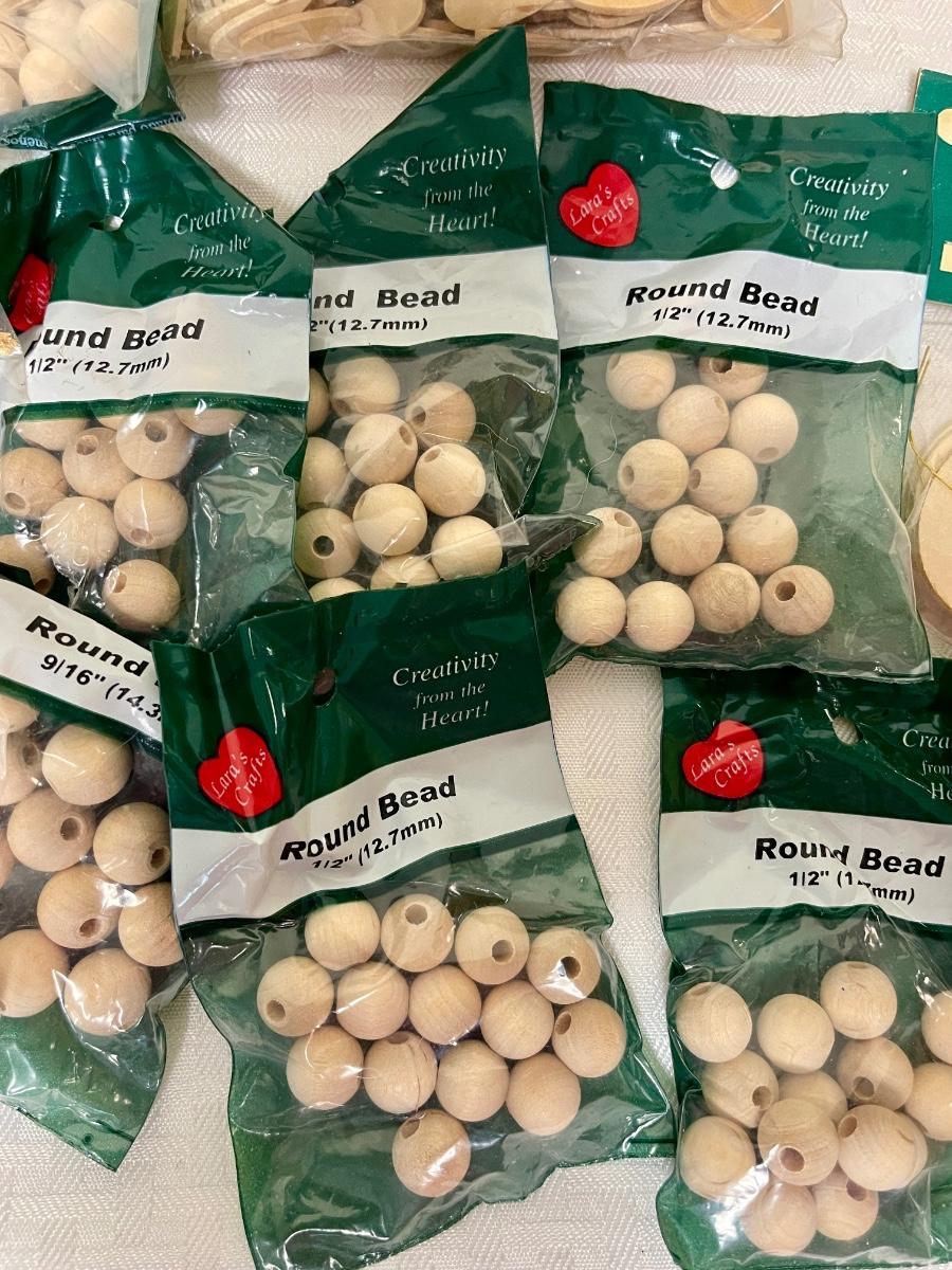 New packages of wood beads, hearts, bells, whales, and other shapes.