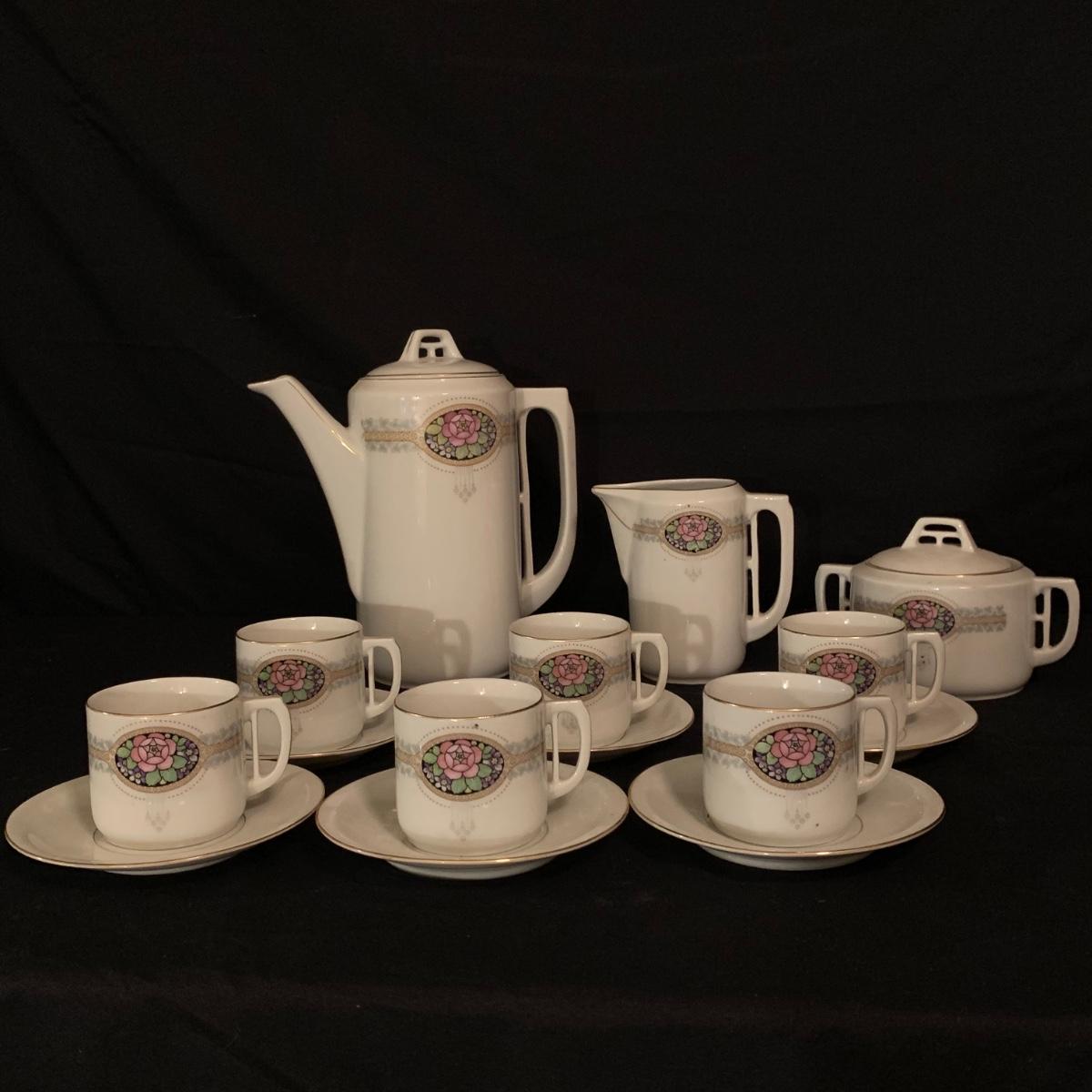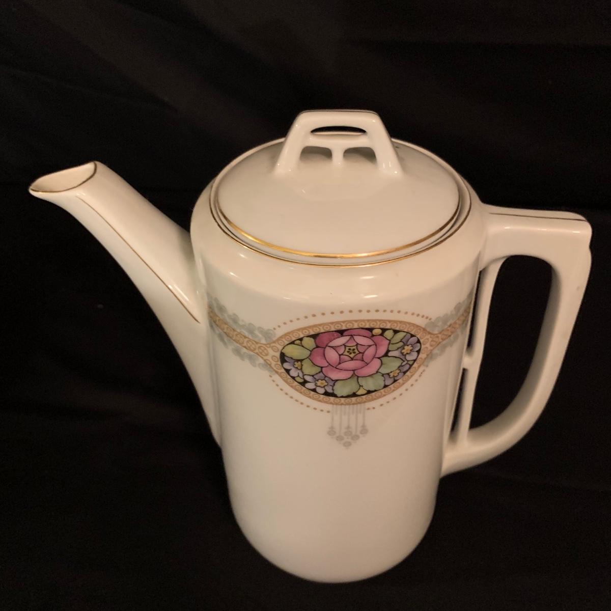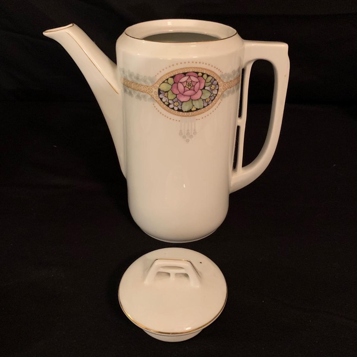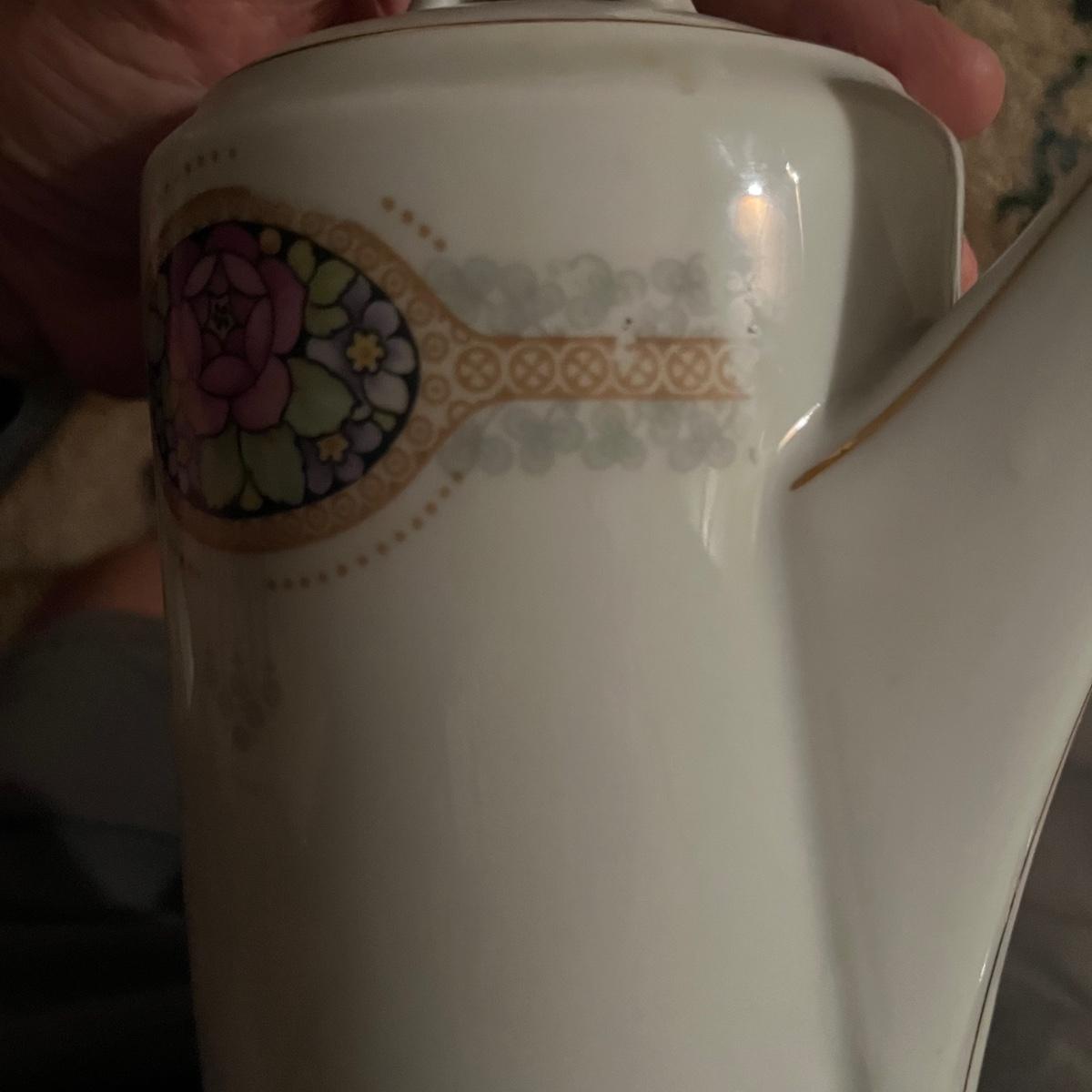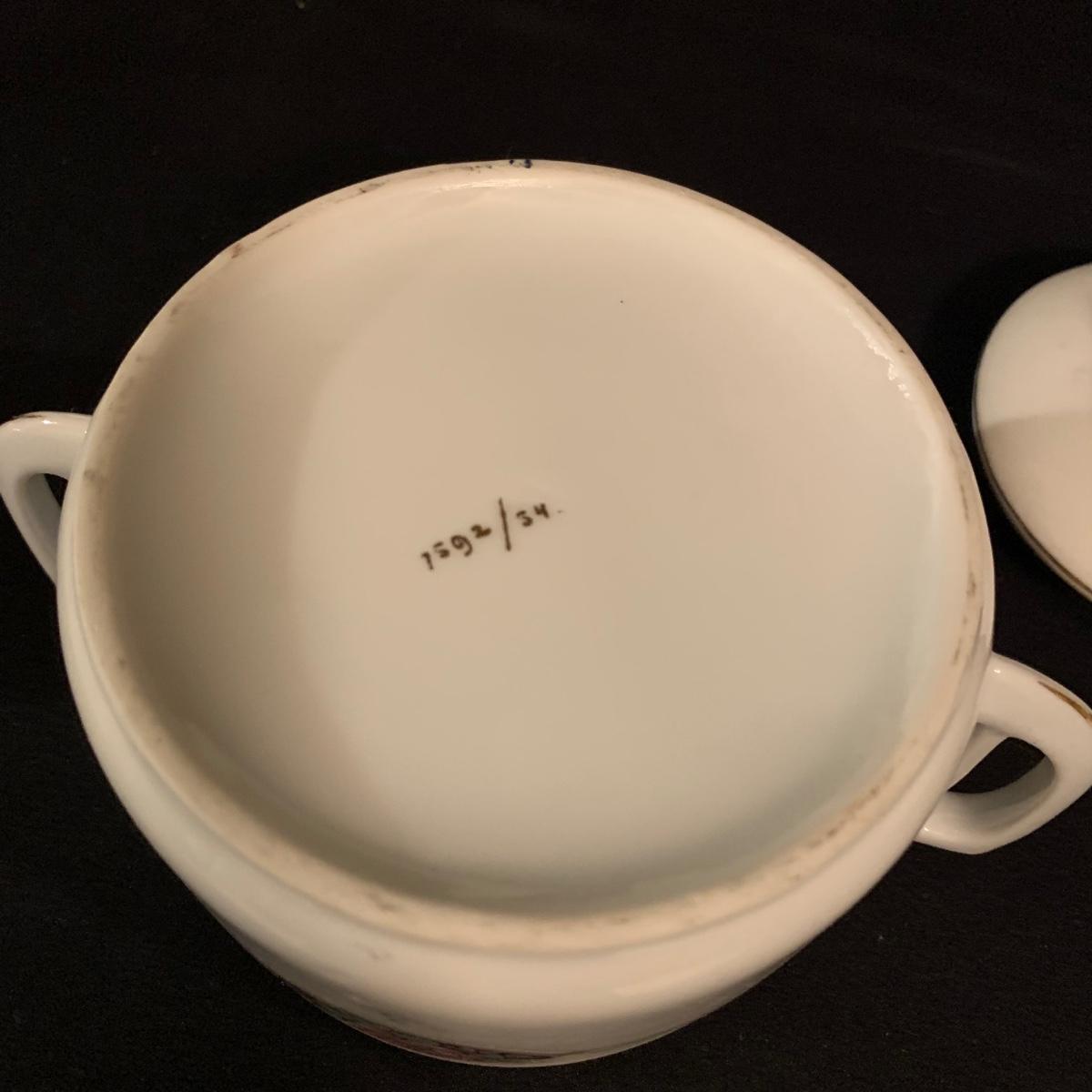 Lovely floral china tea set with a teapot, cream and sugar set, and six teacups with saucers. Items all have gold rims. The set is mostly in good condition, with no visible chips or cracks. There are some small marks on a few of the items, and one area on the teapot where the decoration is worn. The teapot with its lid is 9.5” tall. No brand name is seen on any of the items, but two items have “1592” written in gold on the bottom. Shipping available.