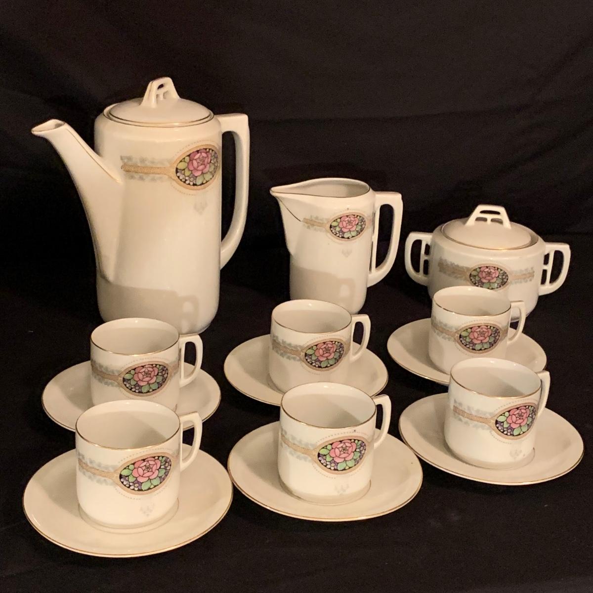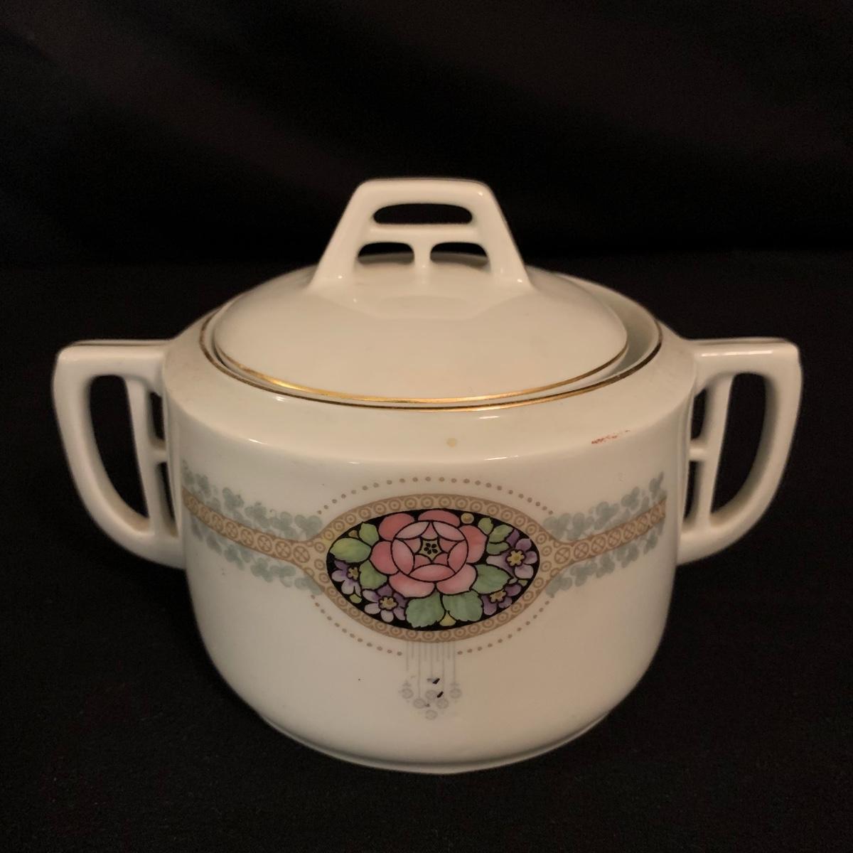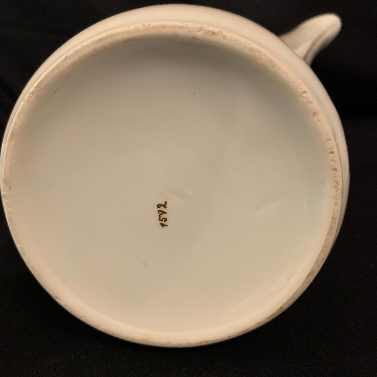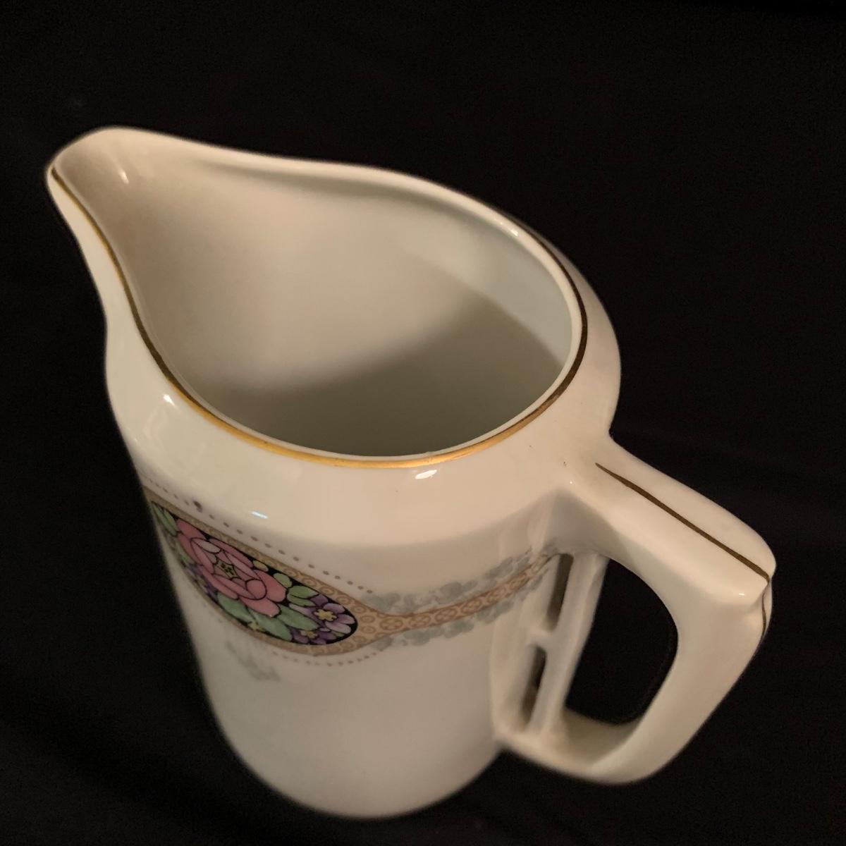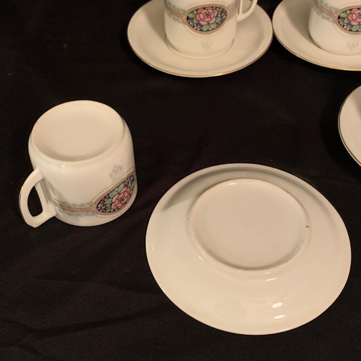 Lovely floral china tea set with a teapot, cream and sugar set, and six teacups with saucers. Items all have gold rims. The set is mostly in good condition, with no visible chips or cracks. There are some small marks on a few of the items, and one area on the teapot where the decoration is worn. The teapot with its lid is 9.5” tall. No brand name is seen on any of the items, but two items have “1592” written in gold on the bottom. Shipping available.