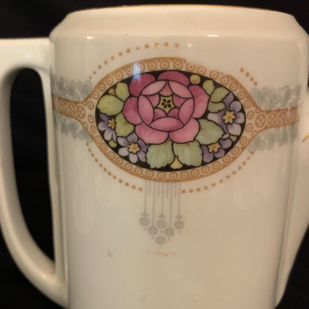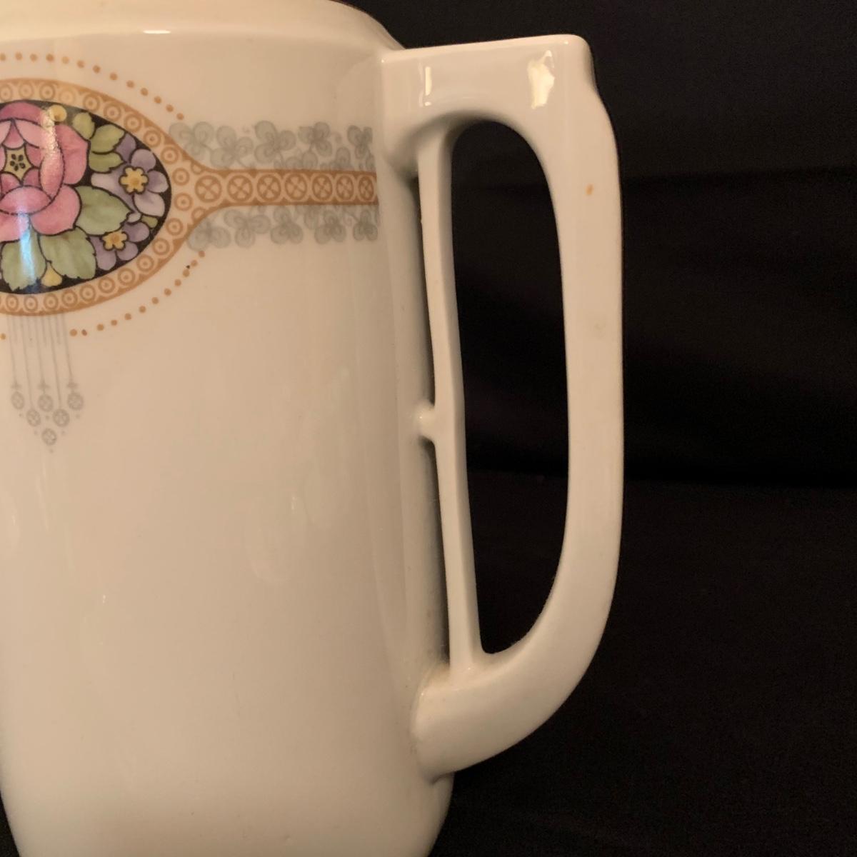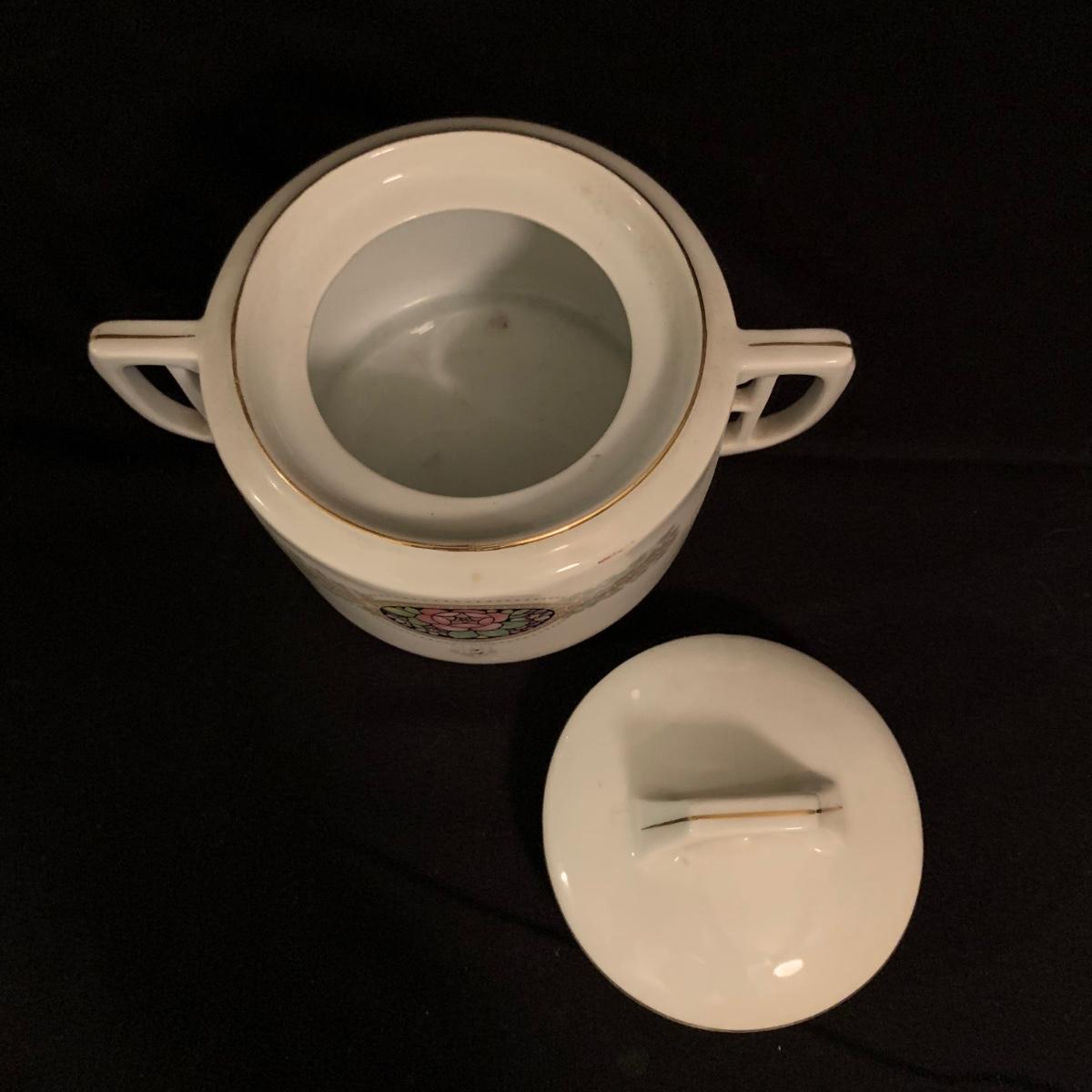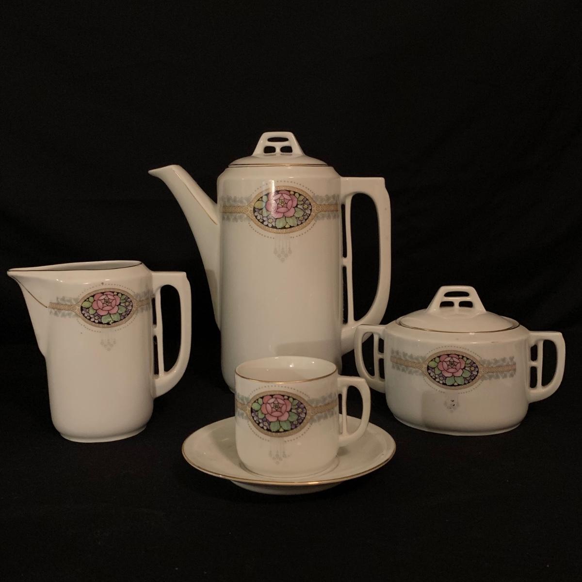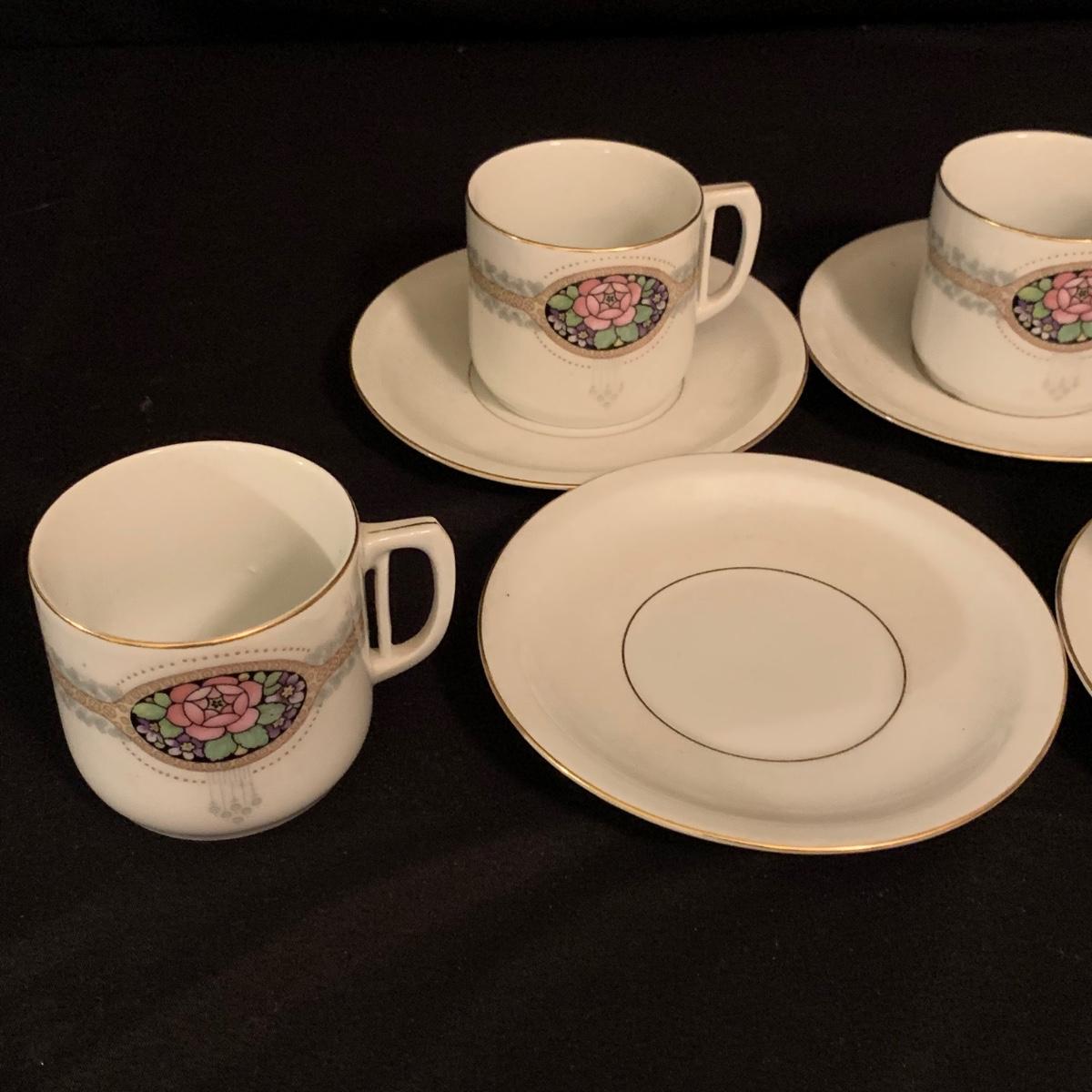 Lovely floral china tea set with a teapot, cream and sugar set, and six teacups with saucers. Items all have gold rims. The set is mostly in good condition, with no visible chips or cracks. There are some small marks on a few of the items, and one area on the teapot where the decoration is worn. The teapot with its lid is 9.5” tall. No brand name is seen on any of the items, but two items have “1592” written in gold on the bottom. Shipping available.
