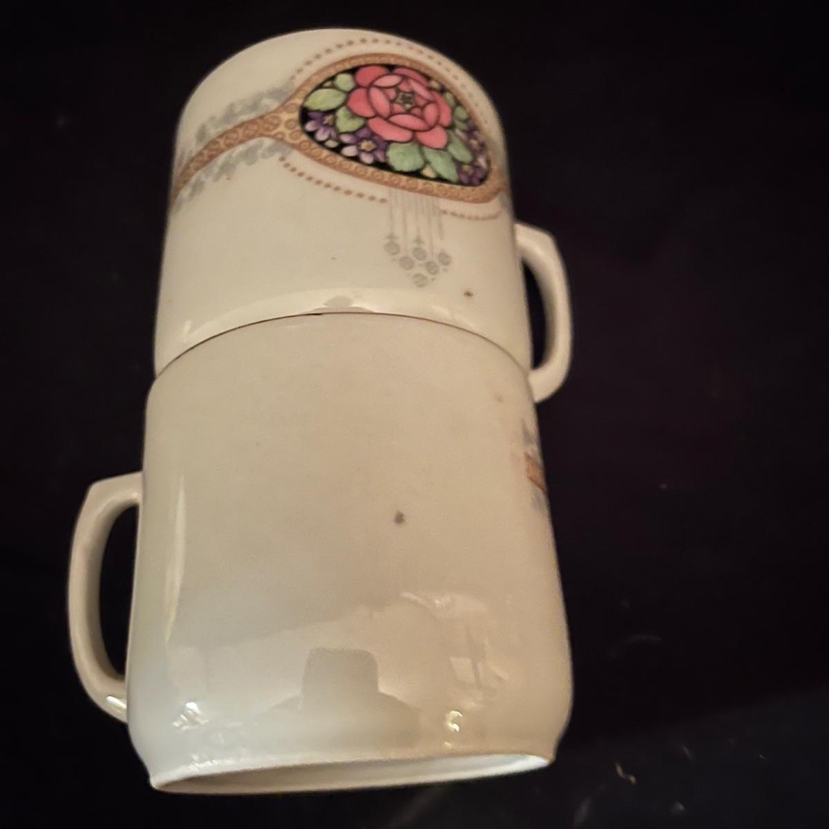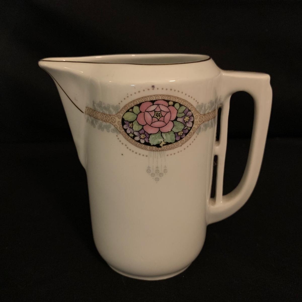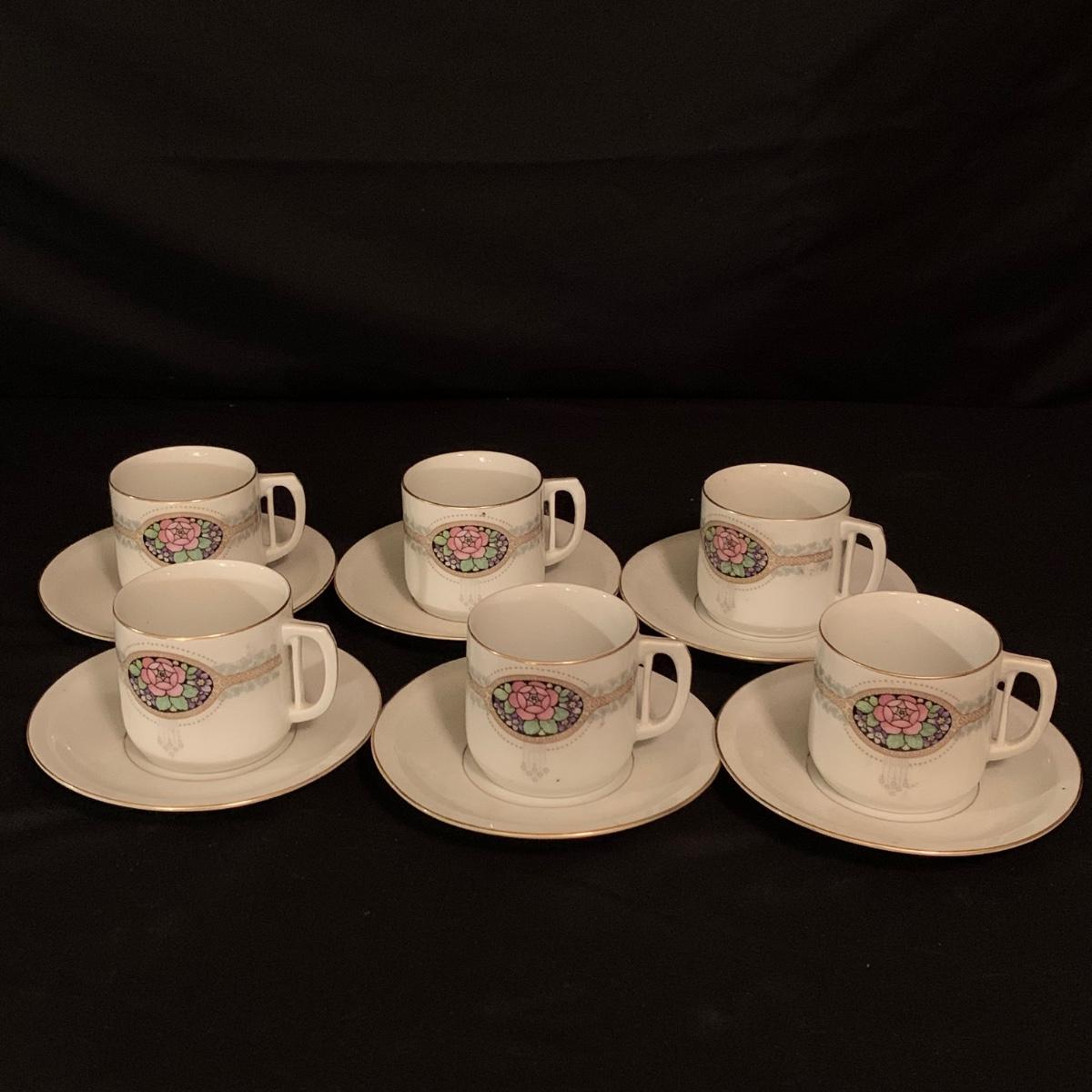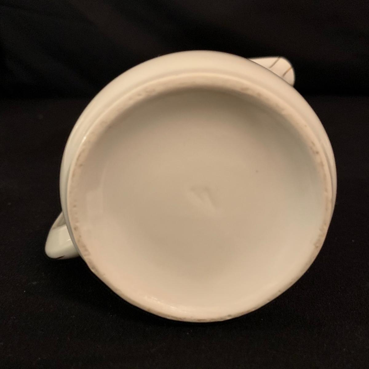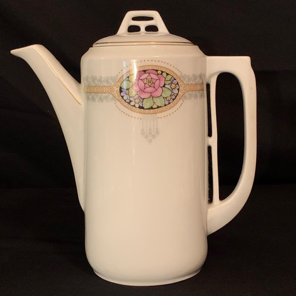 Lovely floral china tea set with a teapot, cream and sugar set, and six teacups with saucers. Items all have gold rims. The set is mostly in good condition, with no visible chips or cracks. There are some small marks on a few of the items, and one area on the teapot where the decoration is worn. The teapot with its lid is 9.5” tall. No brand name is seen on any of the items, but two items have “1592” written in gold on the bottom. Shipping available.