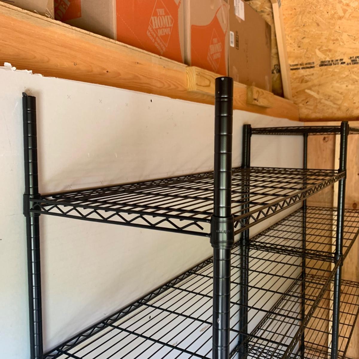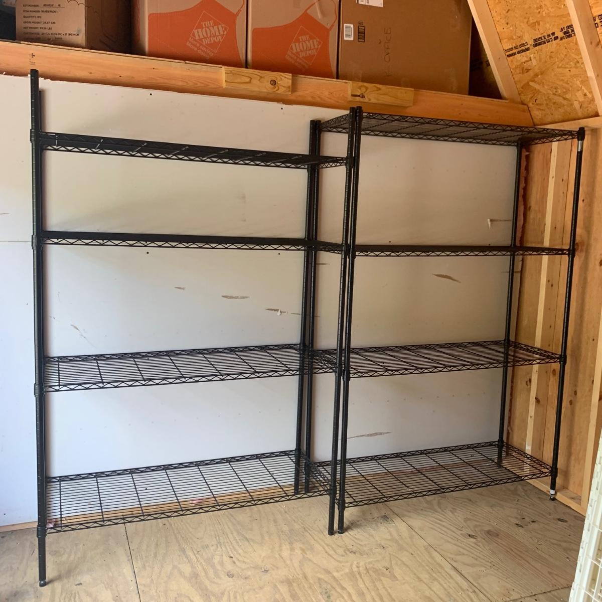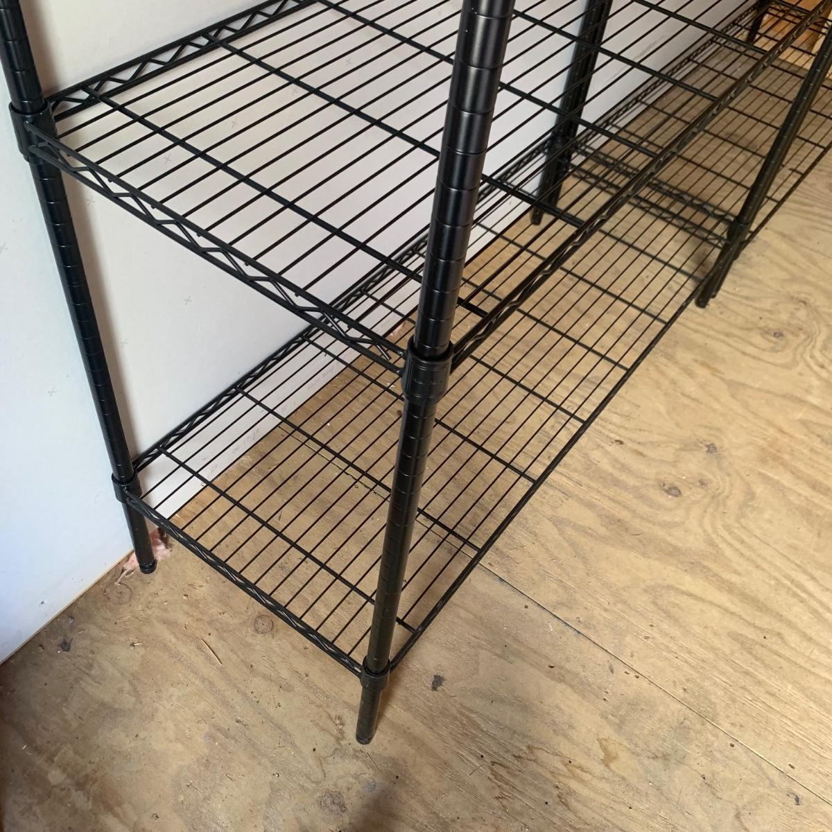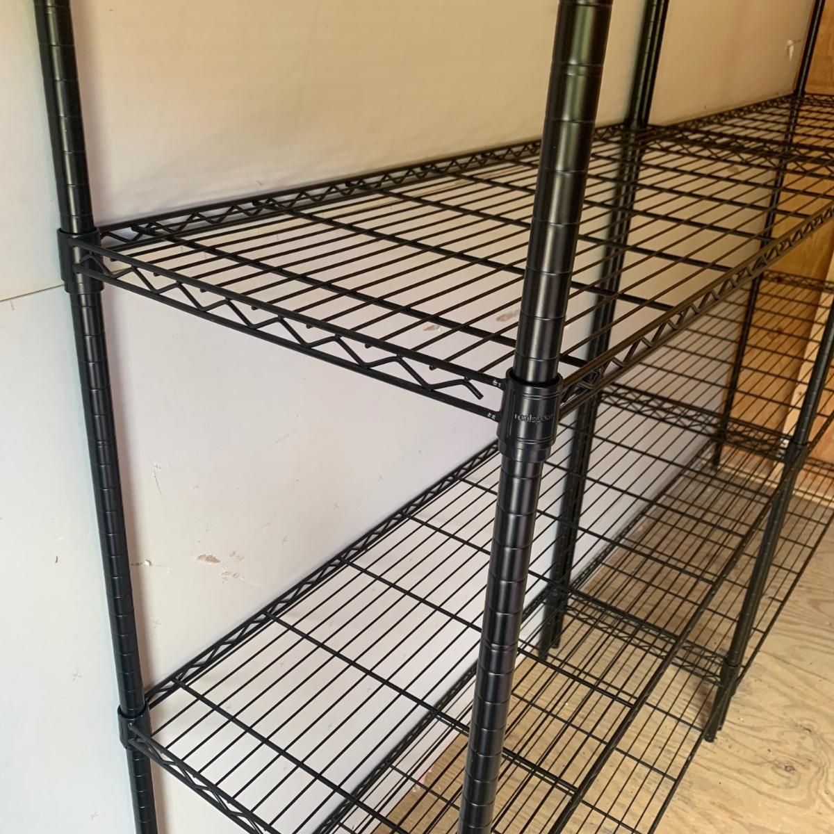 A pair of black wire shelving units by RealSpace. The units have adjustable feet and adjustable shelf heights. Each unit has four shelves. Each unit measures 48 x 18 x 72H”.