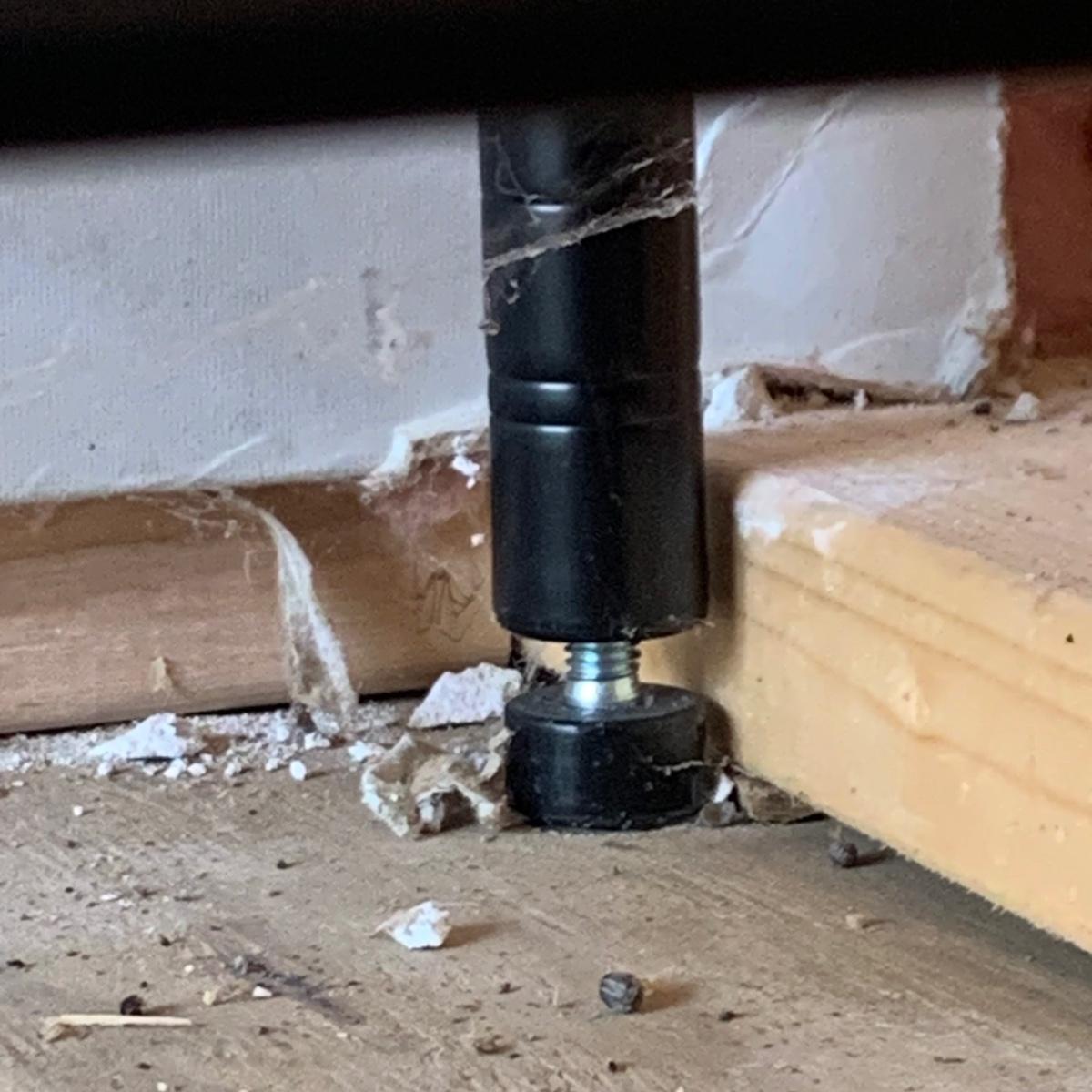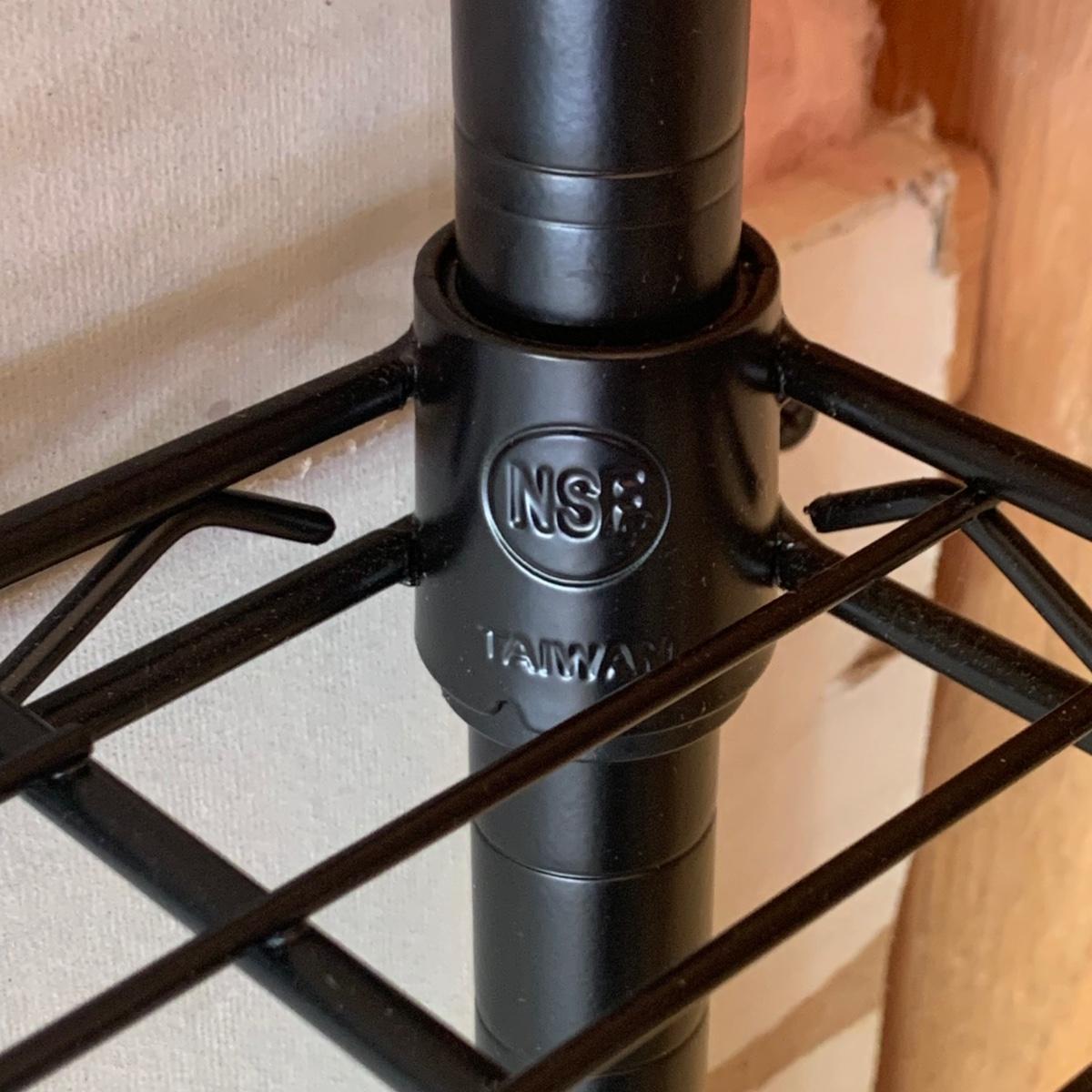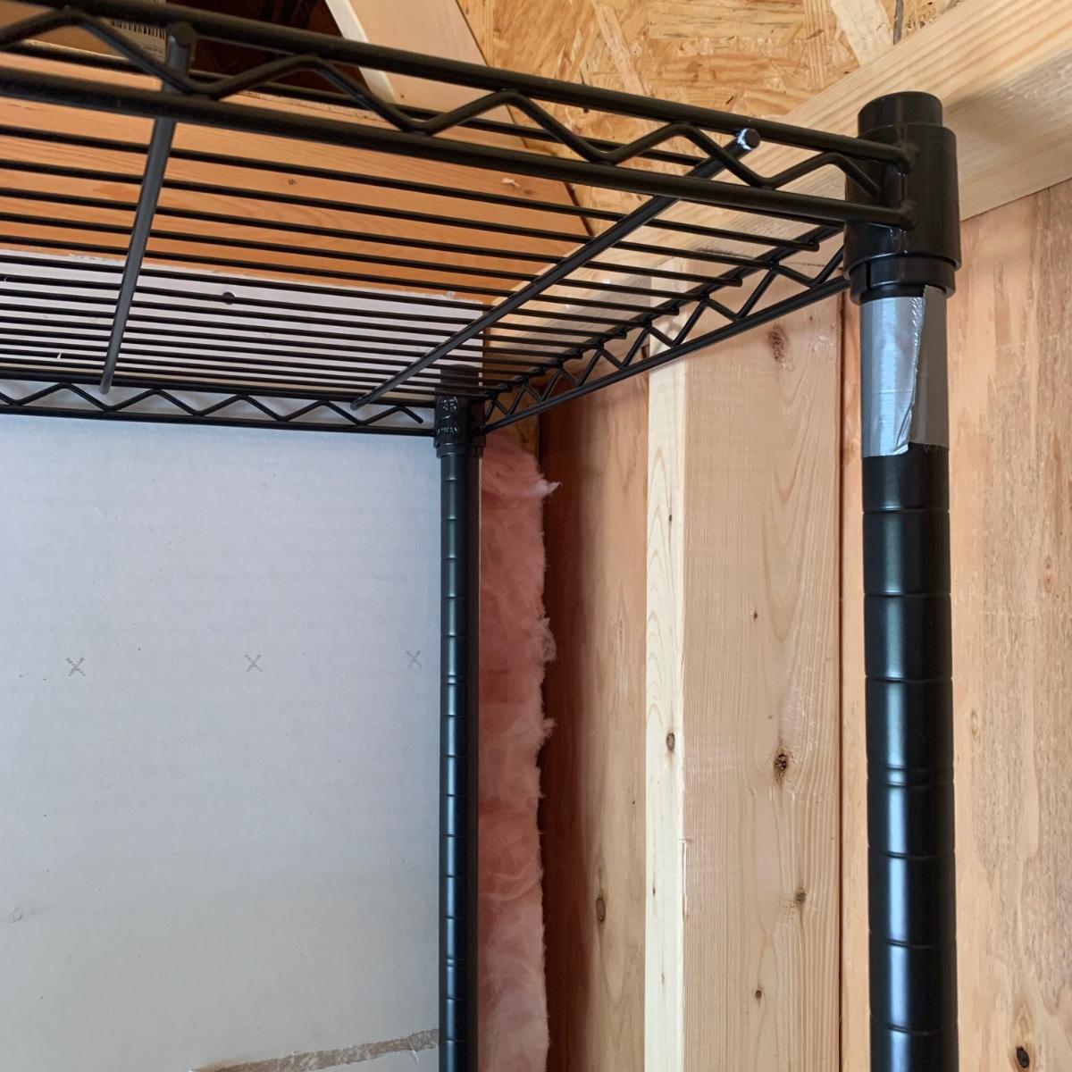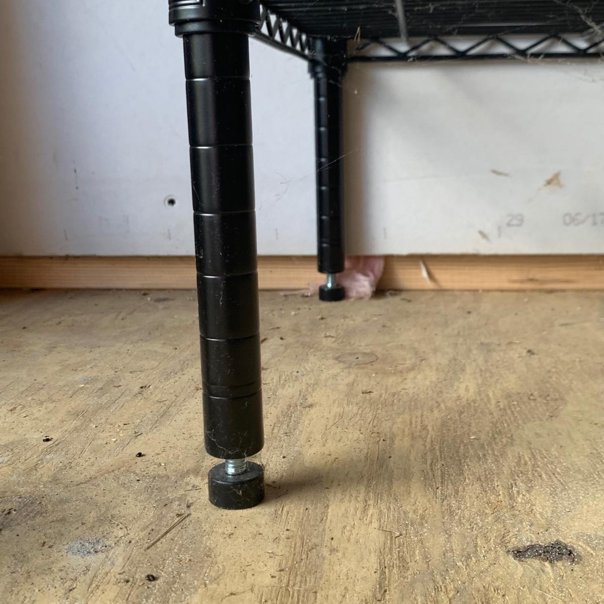 A pair of black wire shelving units by RealSpace. The units have adjustable feet and adjustable shelf heights. Each unit has four shelves. Each unit measures 48 x 18 x 72H”.