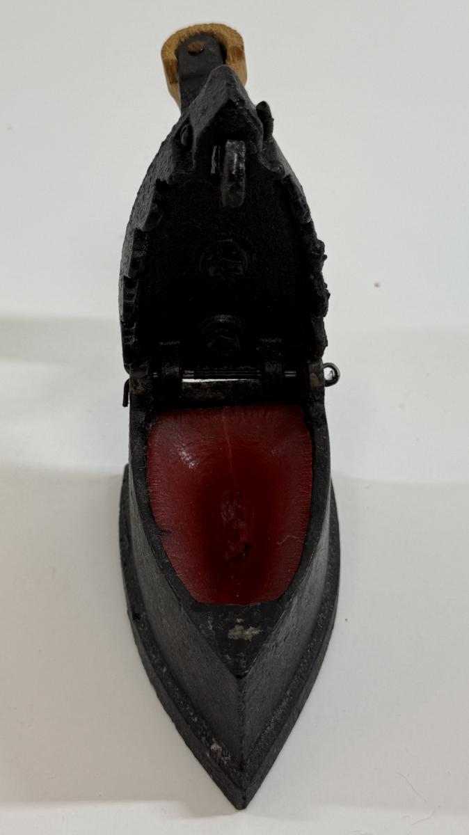 The iron has a hinged lid, secured by a rooster-shaped latch, to hold hot coals inside as a heat source. In good pre-owned condition.