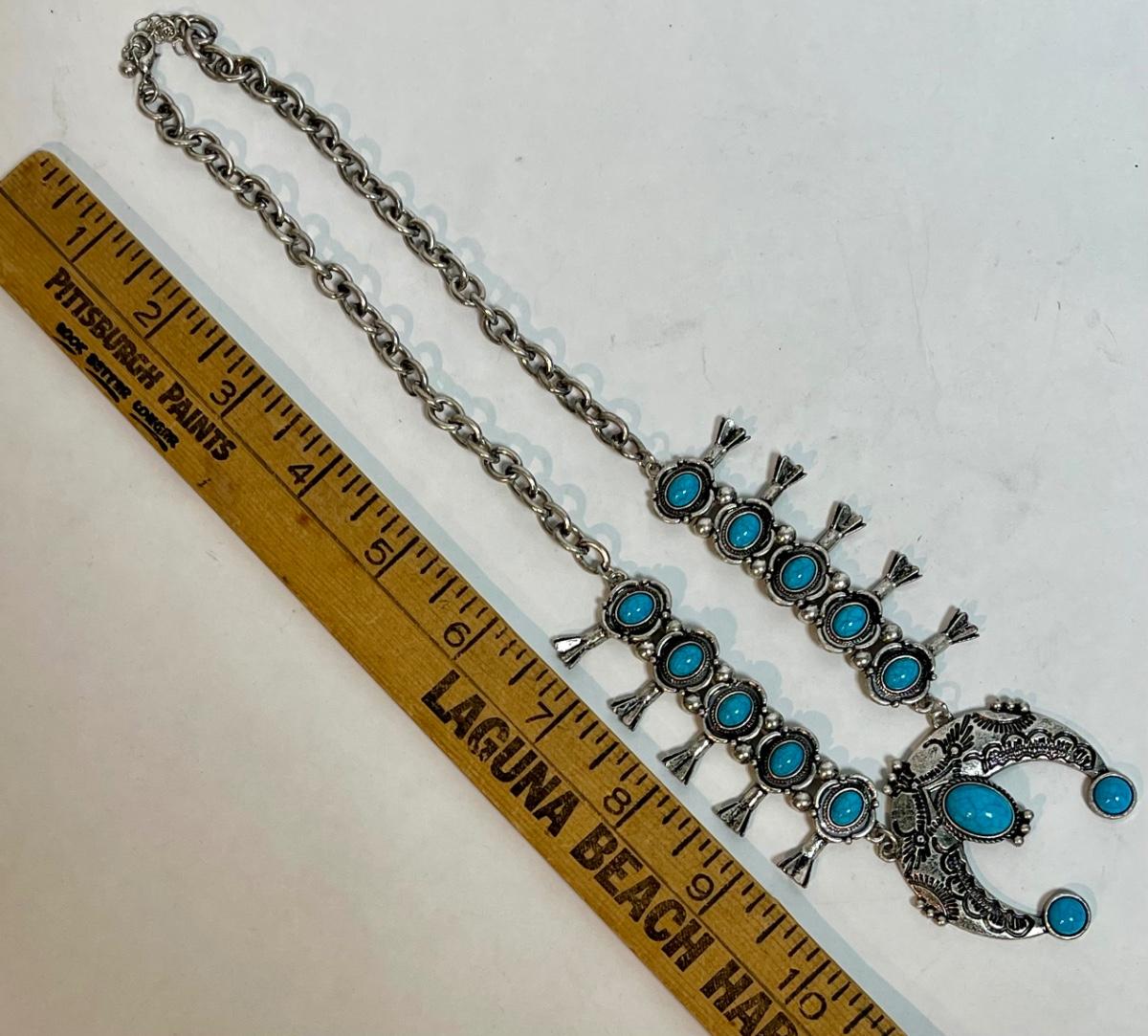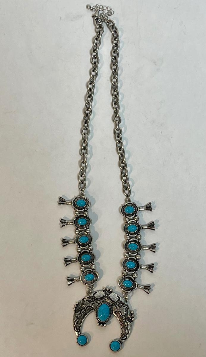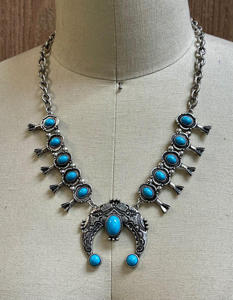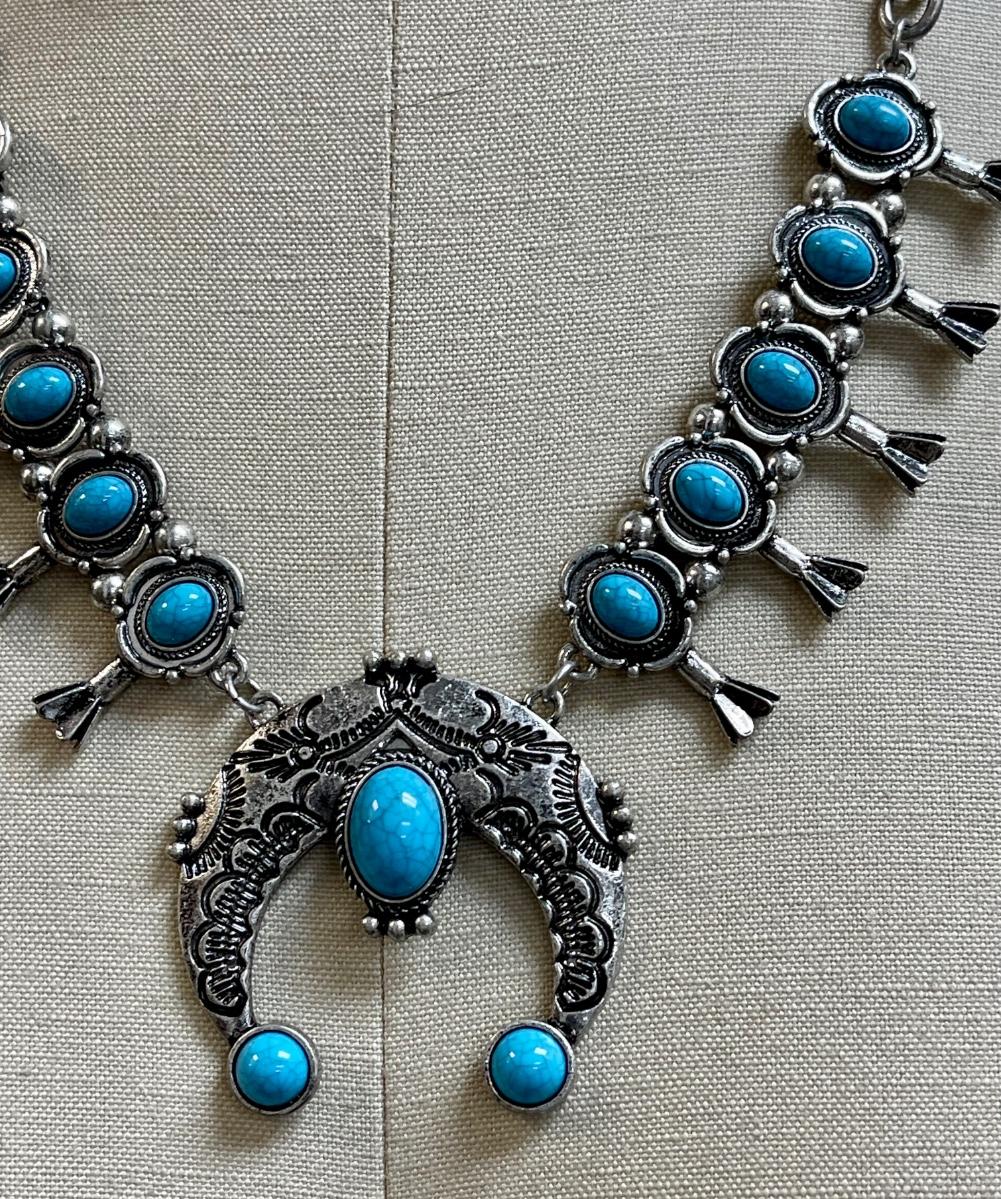 Faux Turquoise and Silver Tone Squash Blossom Statement Necklace